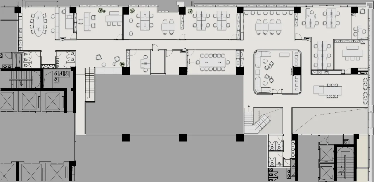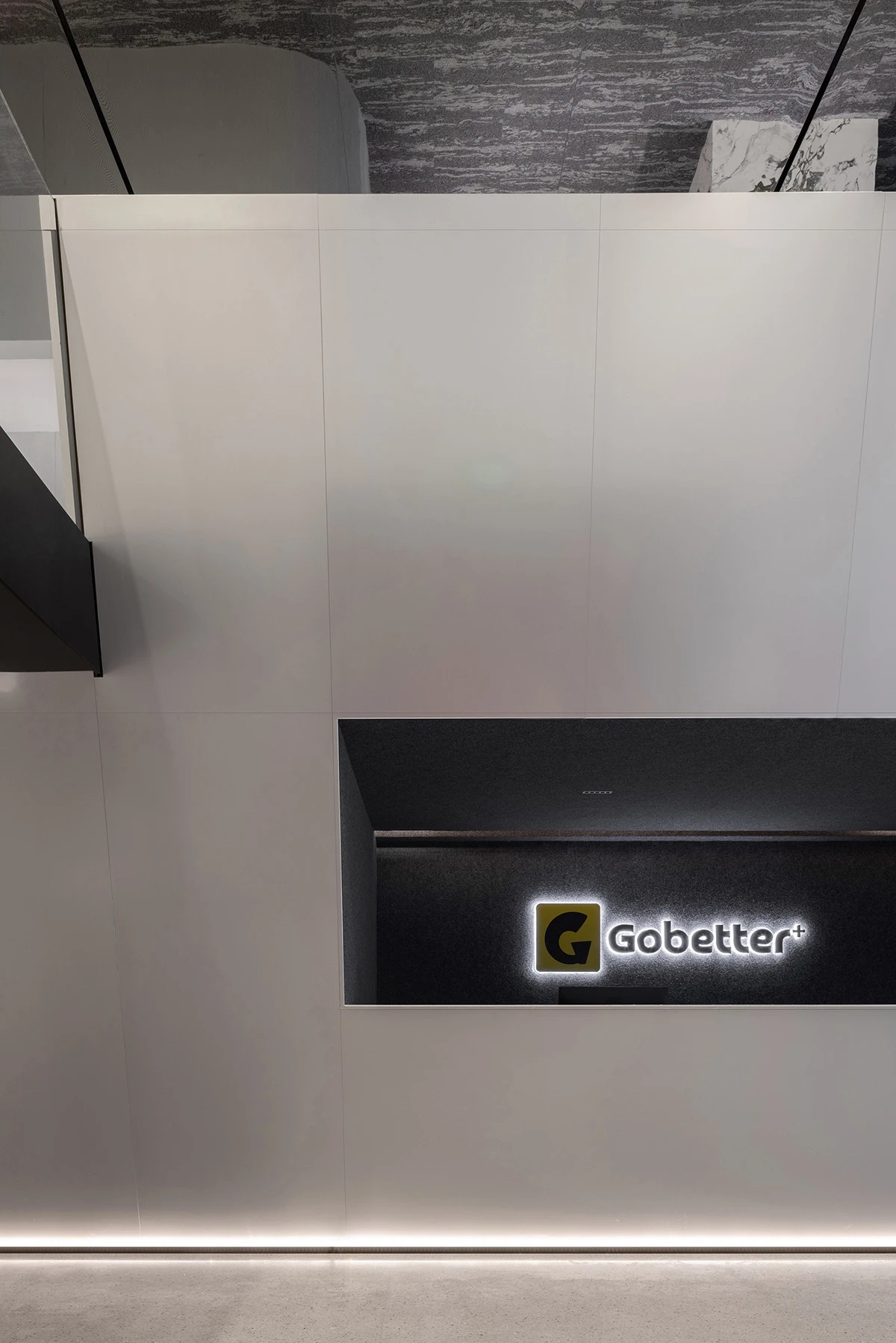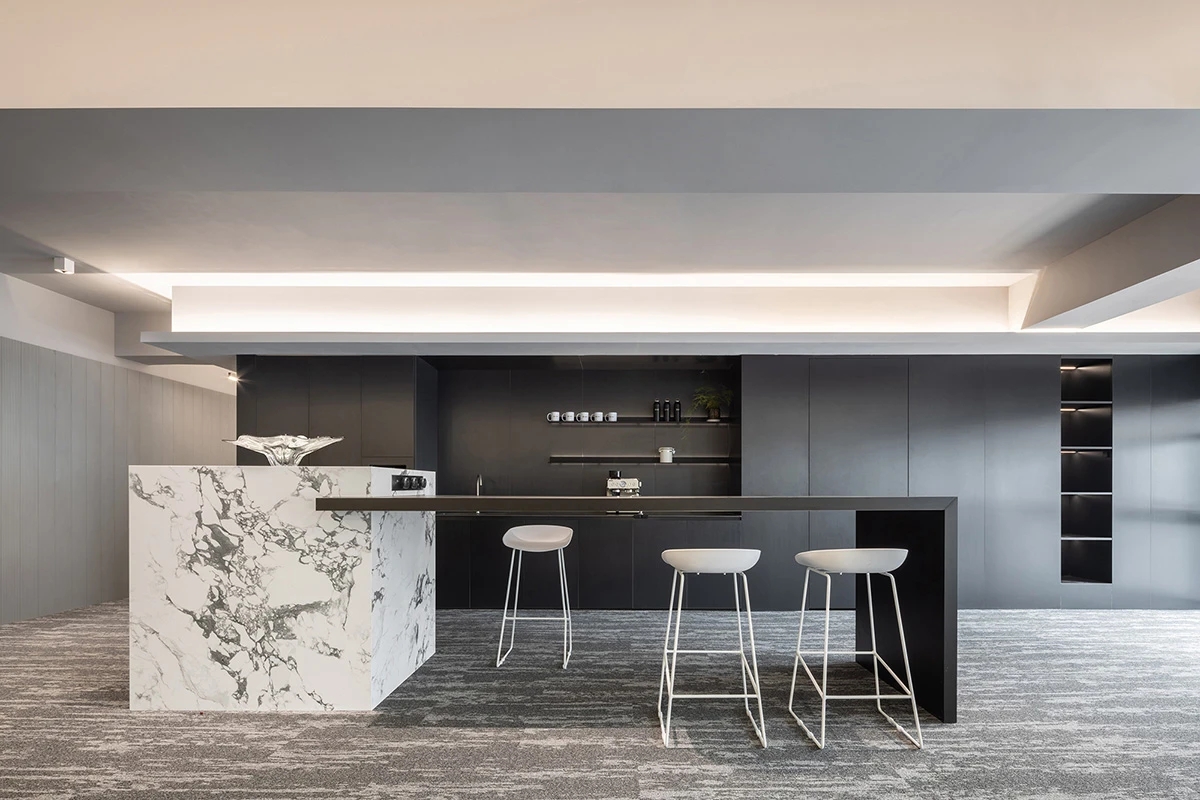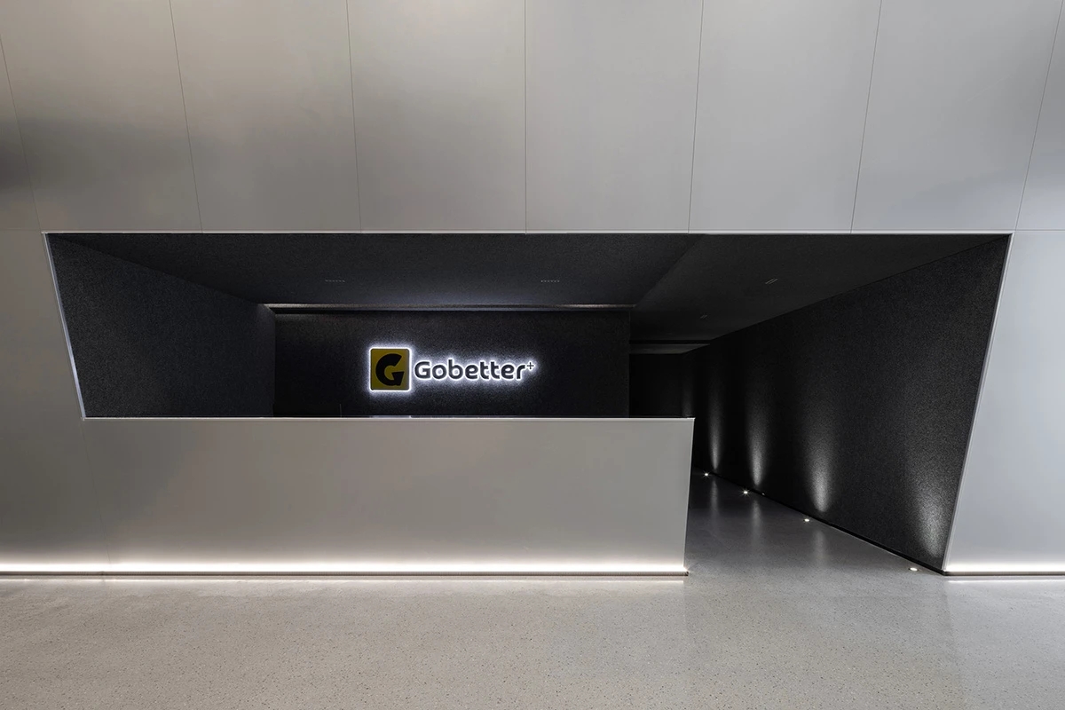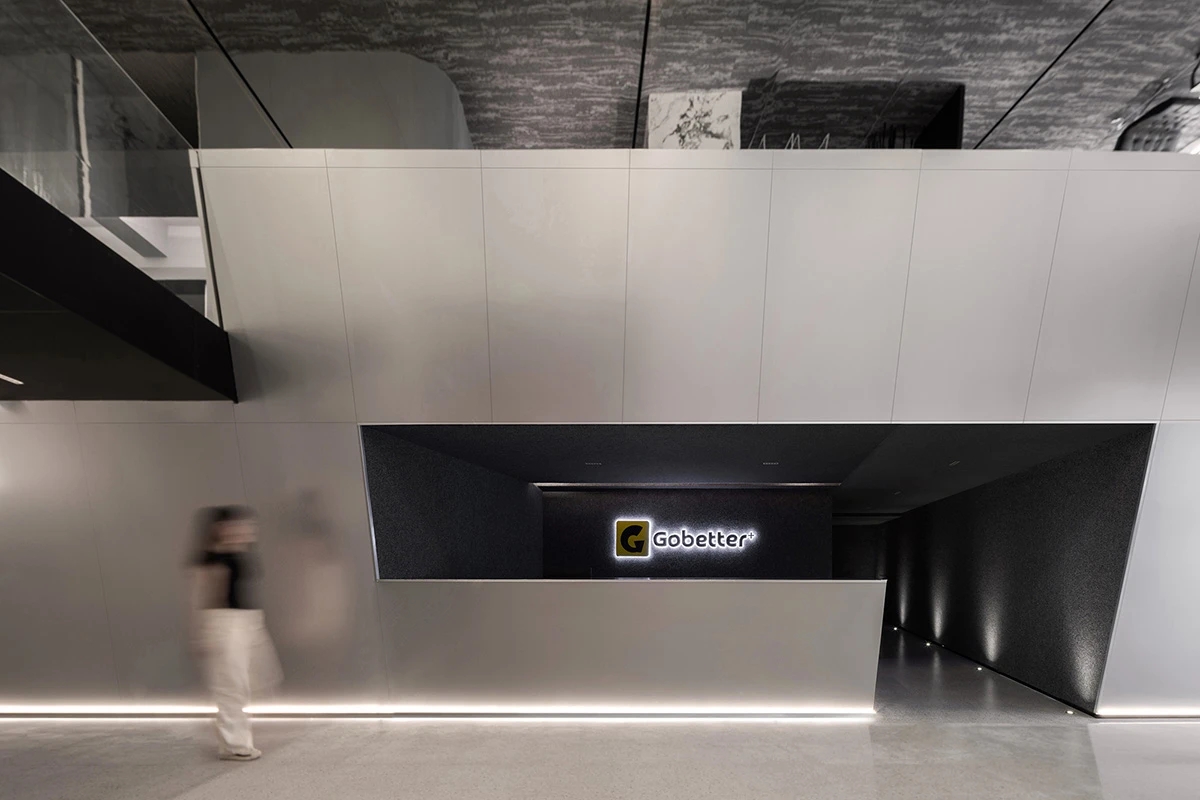 接待区 Reception Zone | 接待前厅,作为进入总部的第一空间,极具视觉张力和记忆点。整体调性以现代简约的灰色系为主,点缀少量鲜明的黄色,突出高级的科技感,通过不同材质和肌理的灰色形成叠加与融合,达成多种层次的空间构成输出,一张一弛,形成记忆锚点,于此塑造的空间语言亦在诉说着企业的品牌愿景。