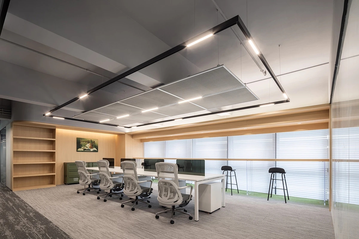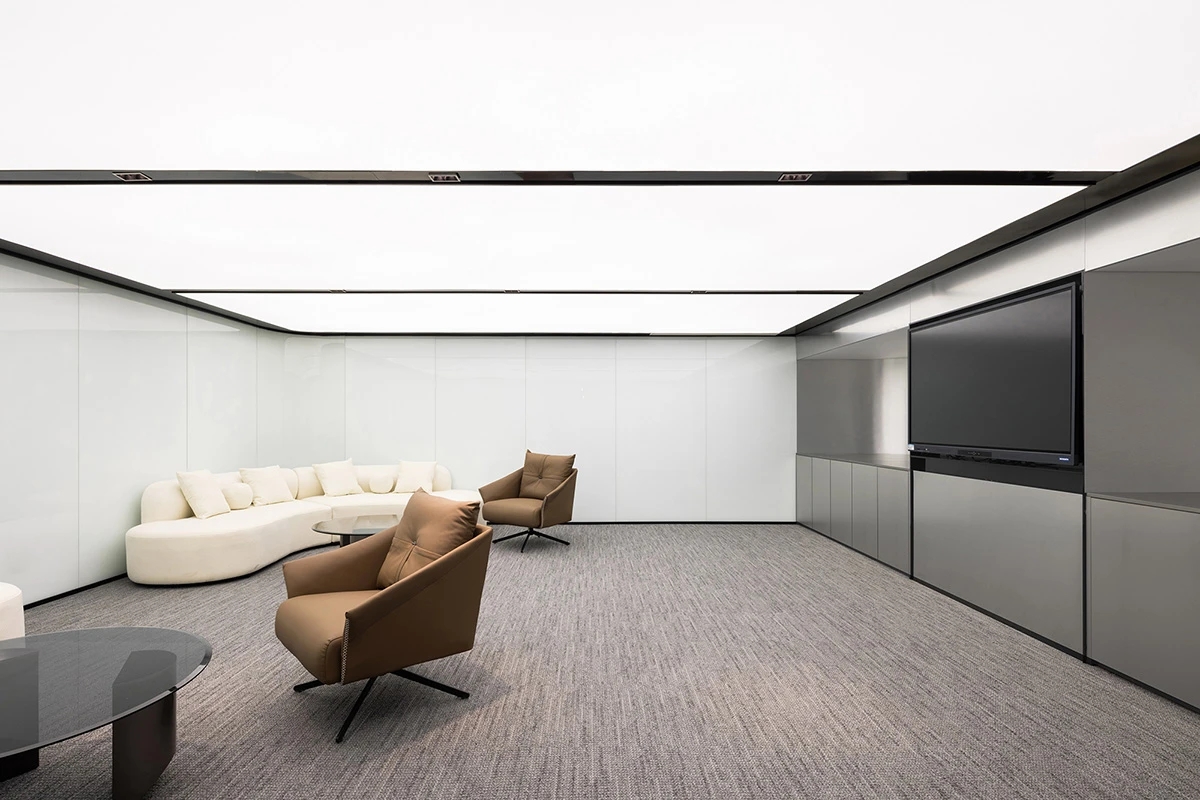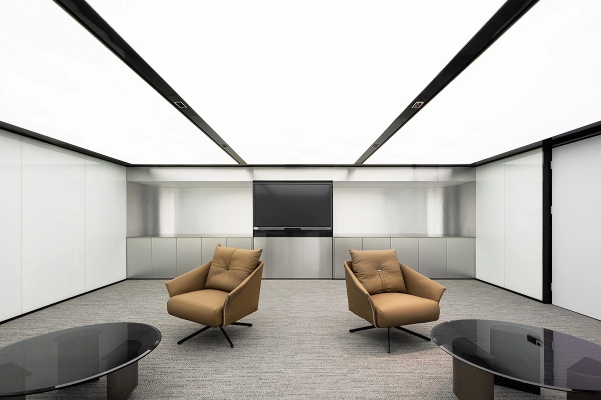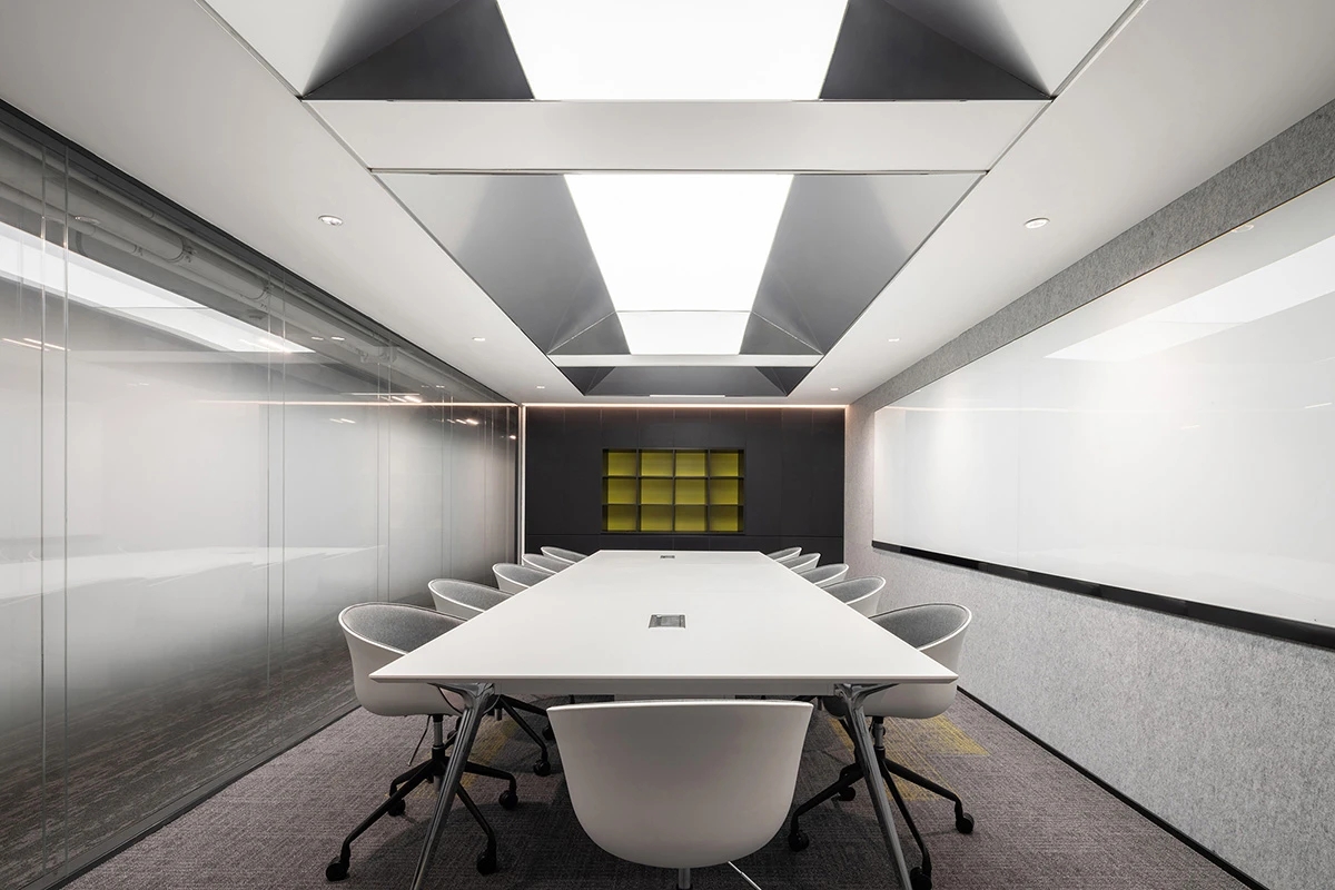 会议室 Meeting Room | 冷酷的渐变玻璃隔绝了内部与外部,满足会议的独立私密的需求。特别采用柔和纯净的软膜灯光,既遮住了天花裸露的横梁,又一定程度上削弱了层高只2.2米的压抑感,仿佛天窗的吊顶设计亮点也营造出纯粹整洁的空间调性。烤漆玻璃提供了开会讨论的头脑风暴的介质,而墙面的吸音板则将声音隔绝于会议室内部,不影响周围其它空间。