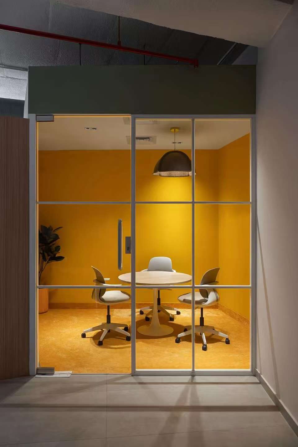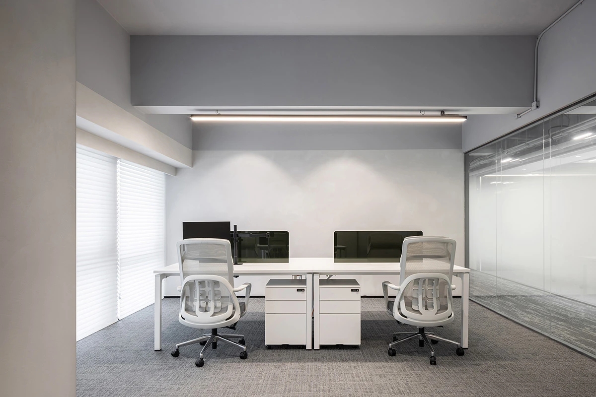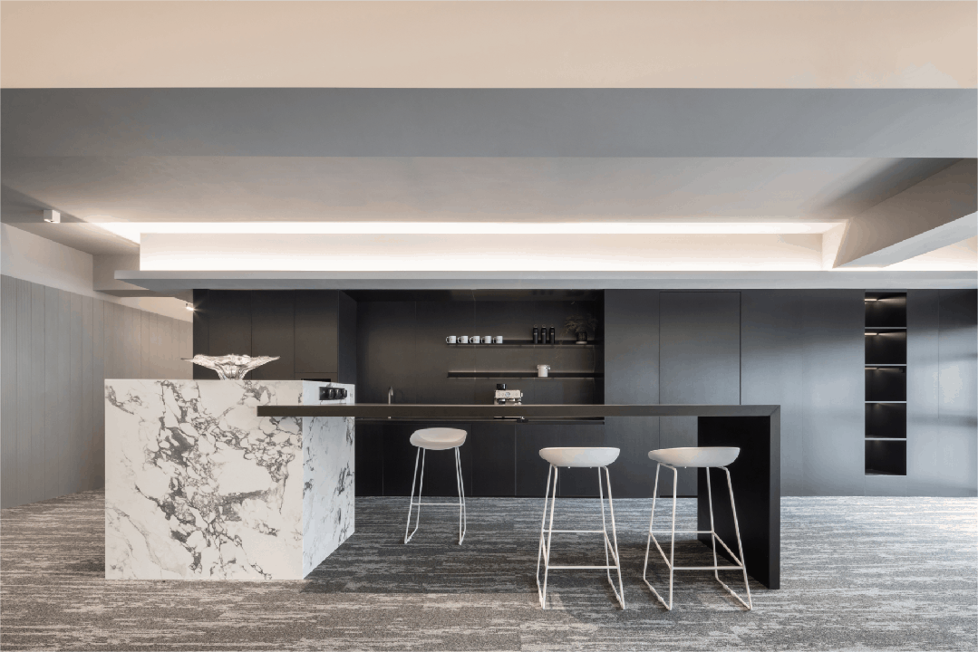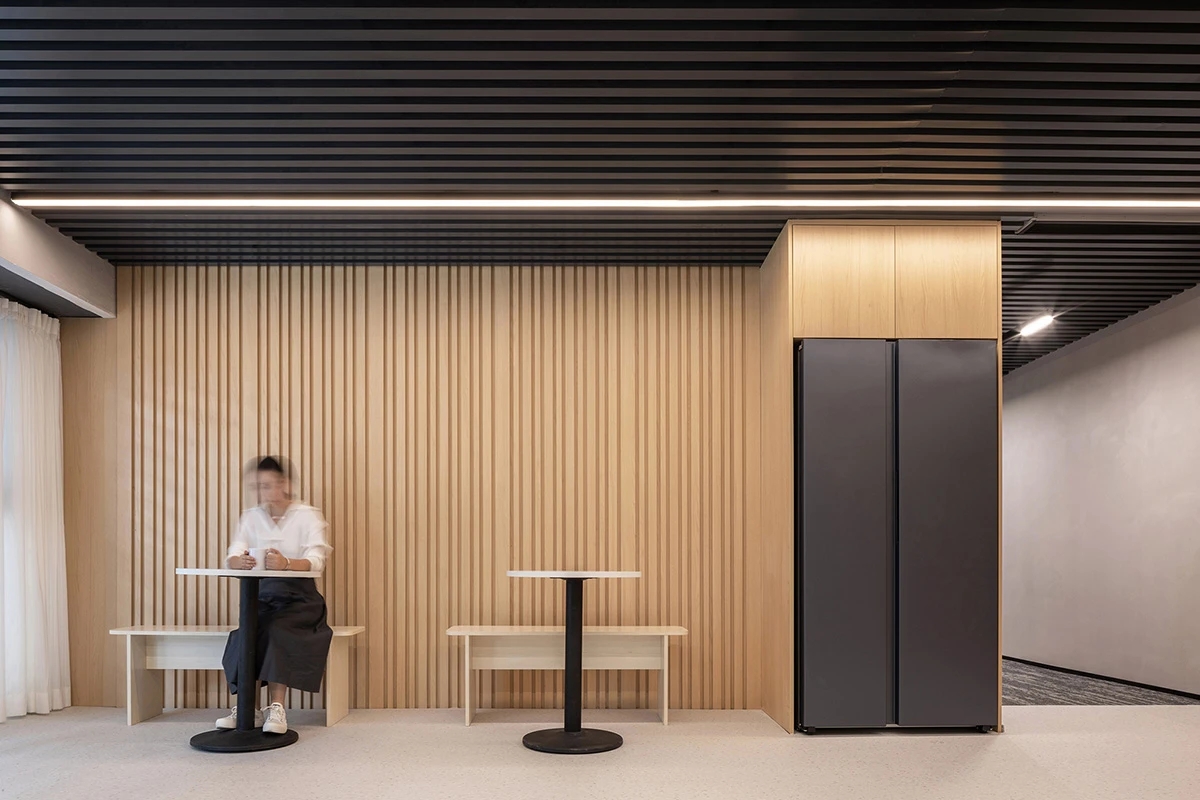 会议室 Meeting Room | 冷酷的渐变玻璃隔绝了内部与外部,满足会议的独立私密的需求。特别采用柔和纯净的软膜灯光,既遮住了天花裸露的横梁,又一定程度上削弱了层高只2.2米的压抑感,仿佛天窗的吊顶设计亮点也营造出纯粹整洁的空间调性。烤漆玻璃提供了开会讨论的头脑风暴的介质,而墙面的吸音板则将声音隔绝于会议室内部,不影响周围其它空间。