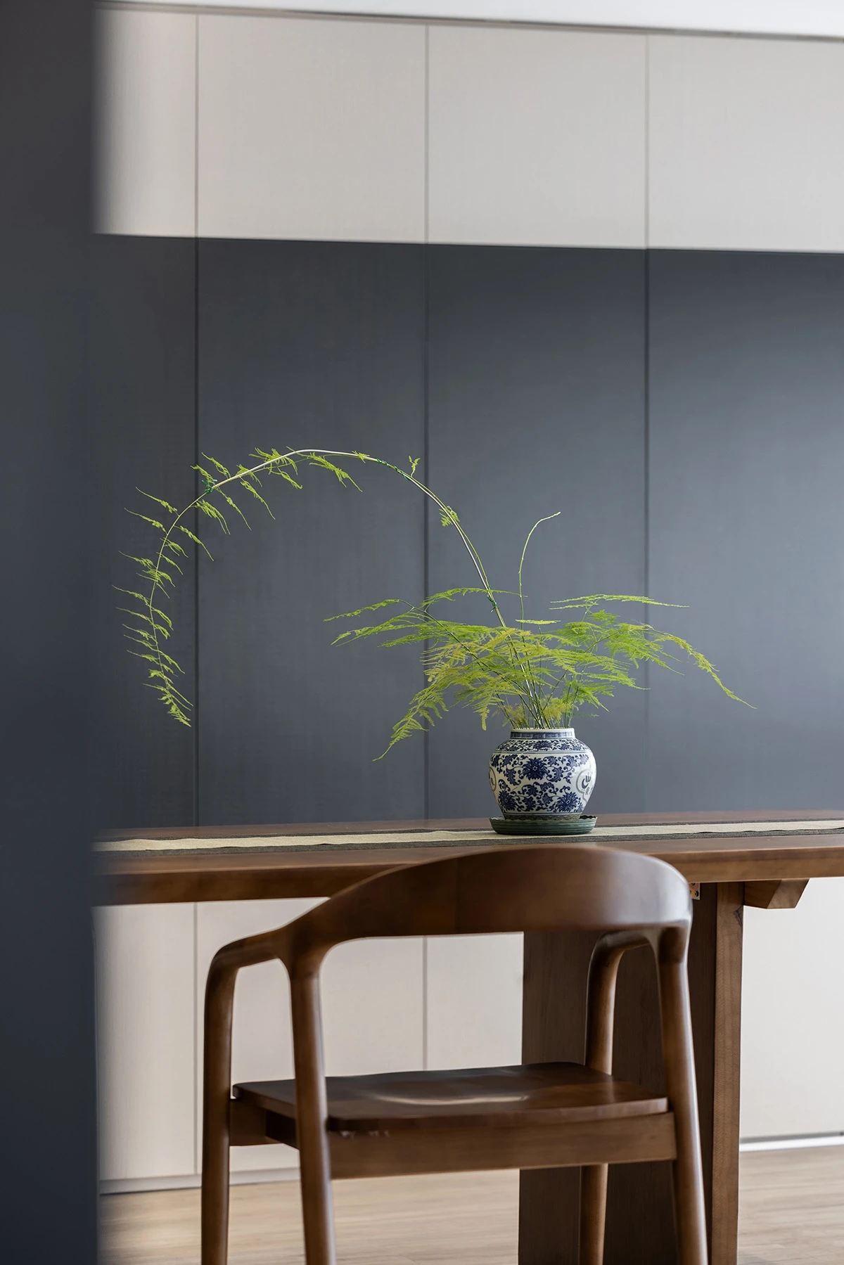 办公区 Office Area | 办公区以开放式布局为主,既鼓励团队间的互动协助,又为专注的个人工作提供舒适的区域。特别设置了开放讨论区,右侧的一整面墙设计为可书写的面板,满足个人或小组间的主题讨论和项目协作。通过温暖的木质柜子、渐变的绿色地毯、窗边的高吧台座位等营造出自然轻松的环境,鼓励专业输出与人际交流。