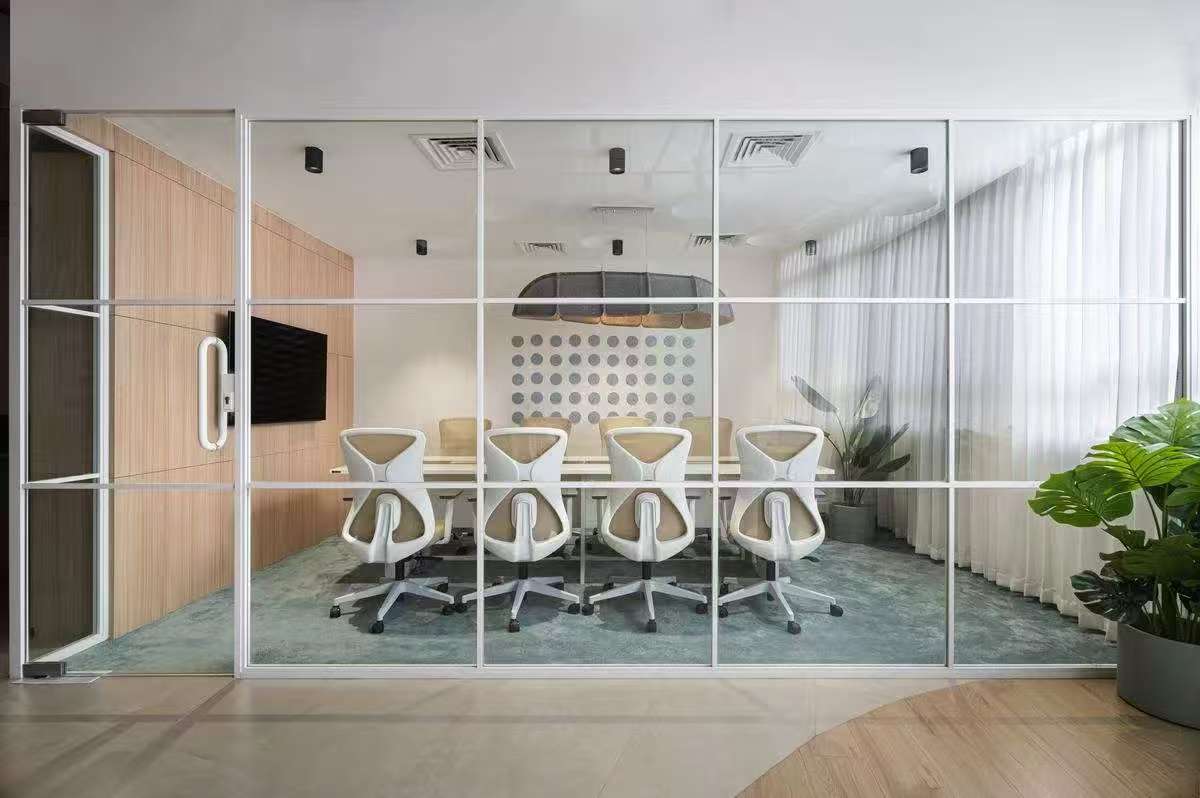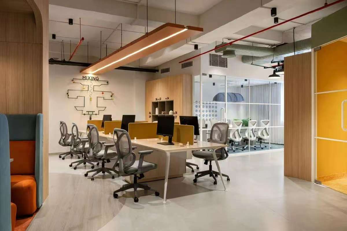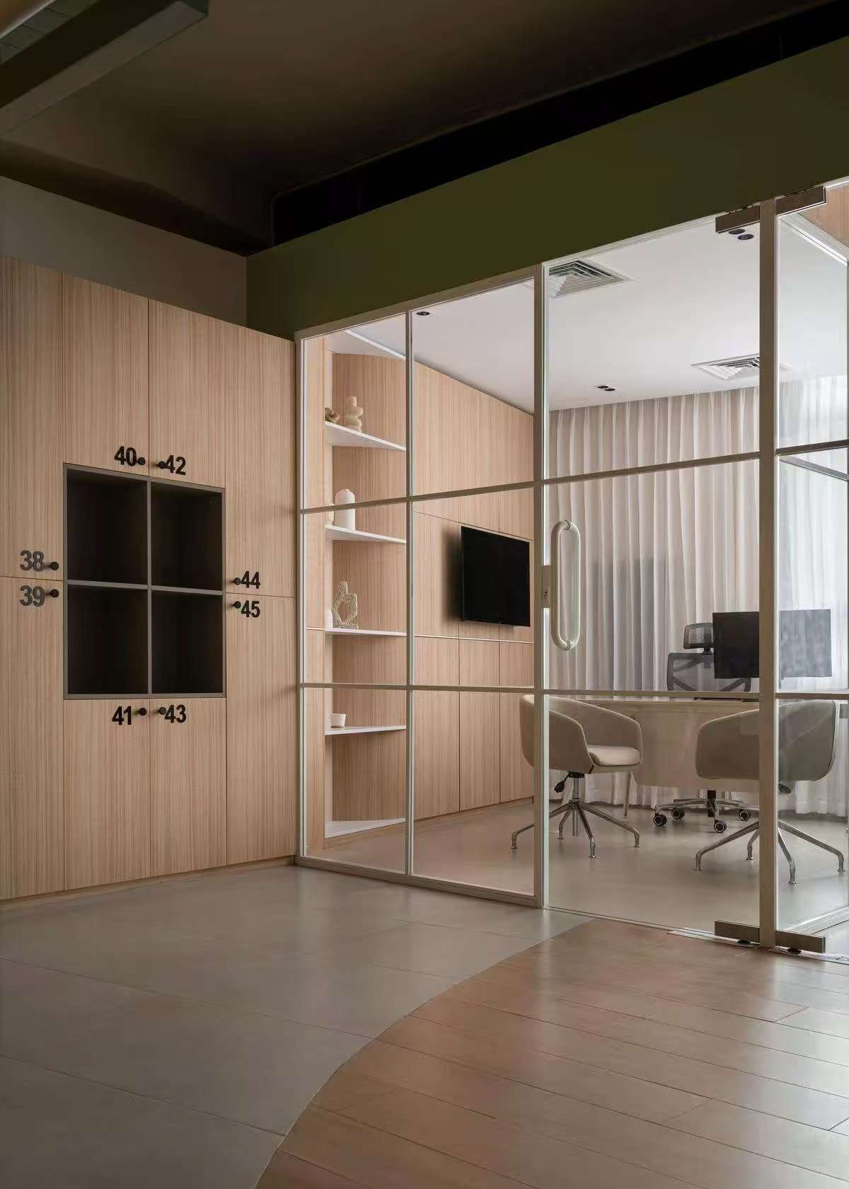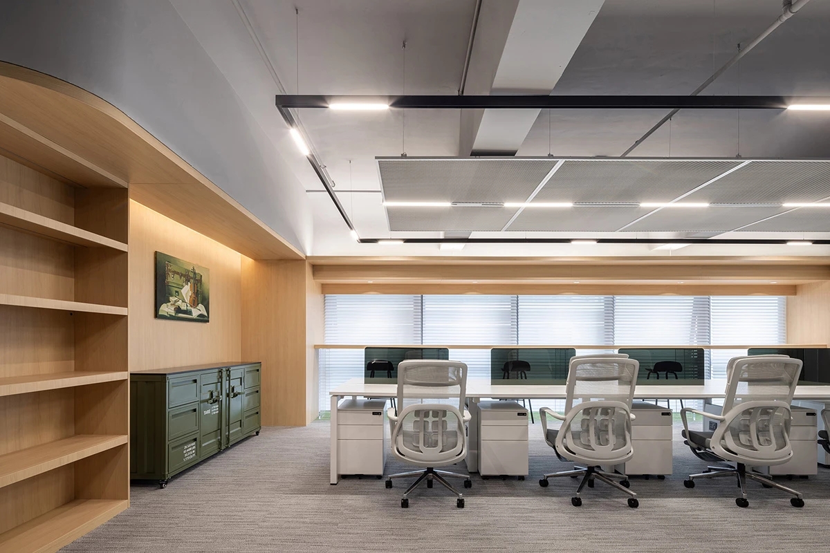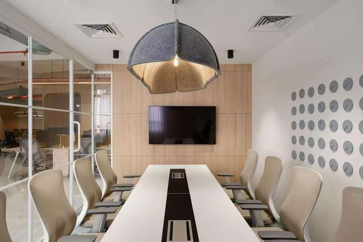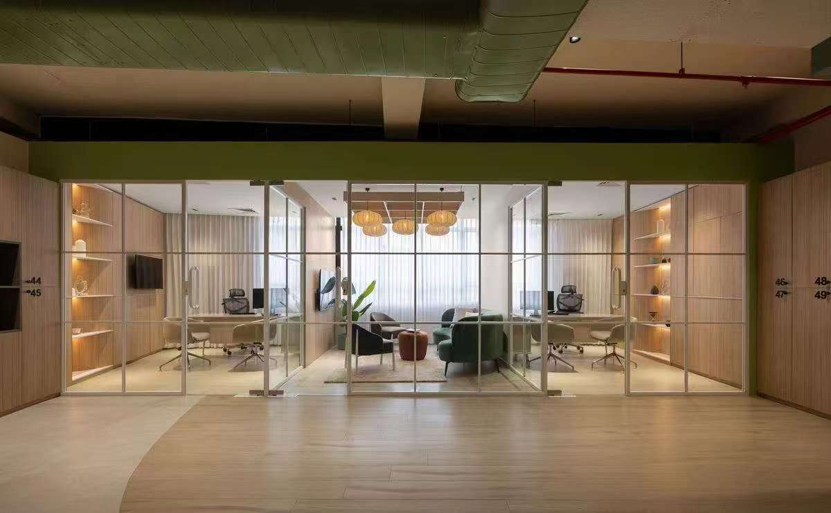 步入前厅,设计师摒弃了传统办公空间的身份仪式感。米灰色云纹石材地面延伸出温暖的引力场,接待台与沙发以群岛形态漂浮其间,苔藓绿长椅与赭石色圆几构成大地色谱的变奏曲。这里既非拒人千里的冰冷权威,亦非浮夸的视觉轰炸,恰似调香师工作台上等待被唤醒的中性基调,为后续的空间叙事预留无限可能。移步核心办公场域,通透性成为设计语言的母题。行政工作舱犹如悬浮的玻璃方舟,钢构骨架支撑起开敞的落地隔墙,既勾勒出管理者与团队的呼吸距离,又让阳光穿透玻璃,在科技木地板上织就朦胧光毯。设计师巧妙运用声学板构筑视觉屏障,让键盘敲击声与头脑风暴的声浪,在开放式平面中达成微妙平衡。