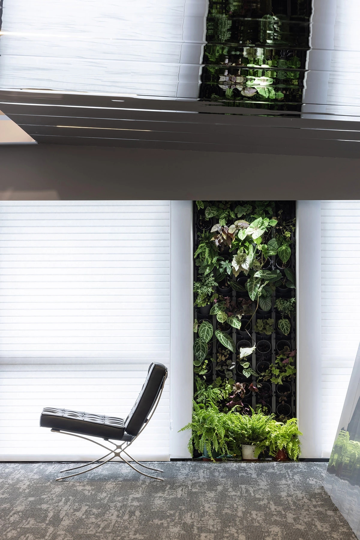 大面积的金属铝板,简洁干净,包裹着特别设计的一整面的斜面造型,于灯光的晕染中尽显办公空间的独特性。天花采用镜面不锈钢,让上下挑空的纵向空间无意间形成上下延伸,通透开阔,结合有序规划的氛围灯,形成辅助照明,营造出一个充满能量的未来科技新环境。