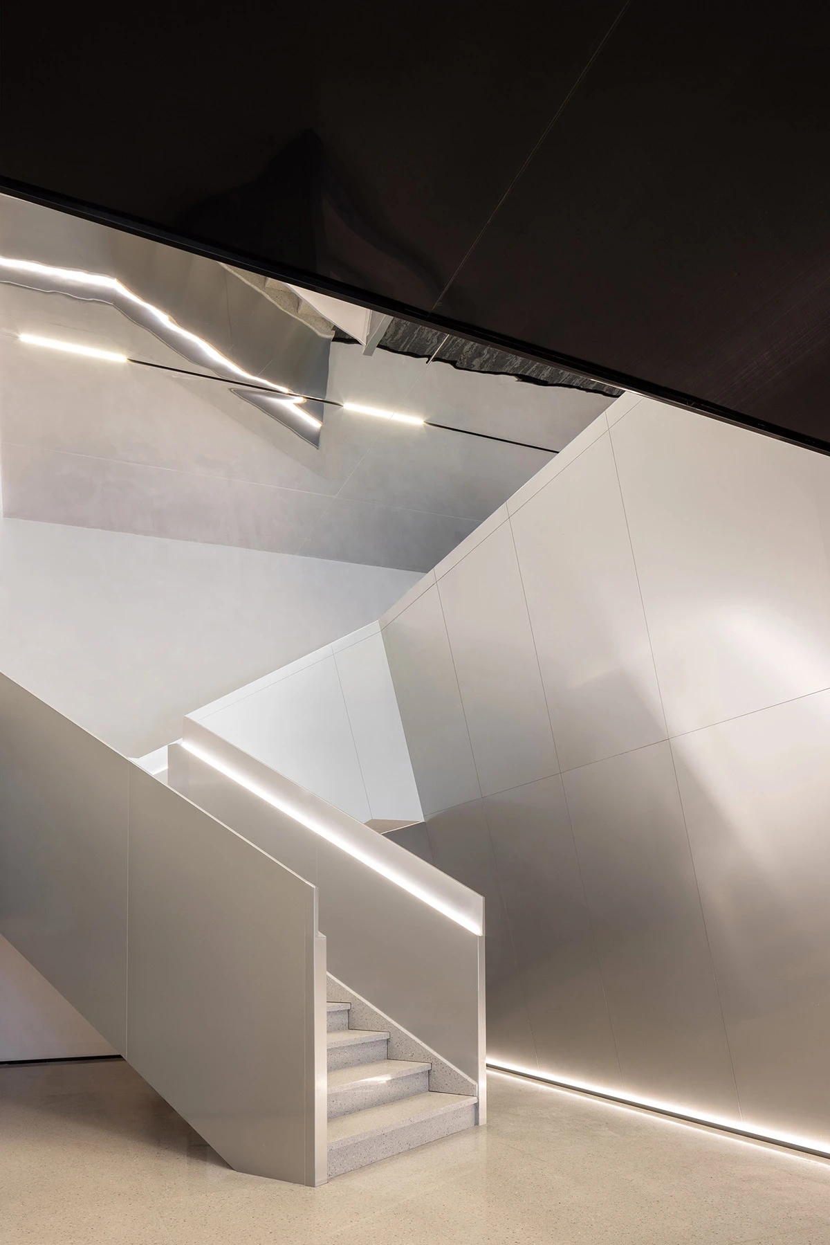 前厅一侧设置了一处通往二层的楼梯,其流畅有力的线条造型呼应了前厅区域的极致美学调性,纯粹冷酷,结合恰到好处的柔和灯光,其独特的反射效果将整个空间得以无限延伸。