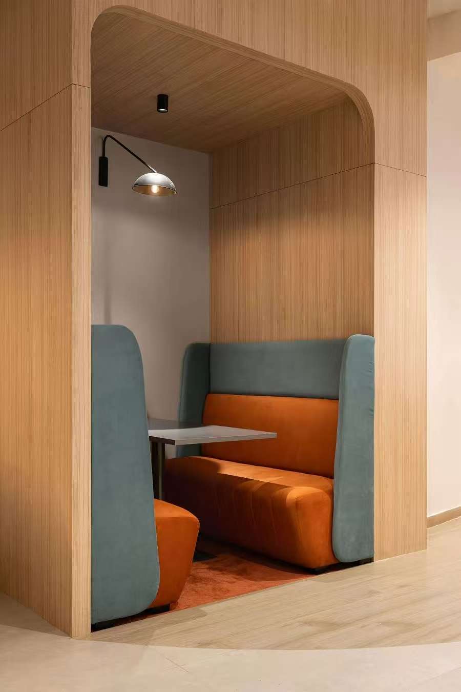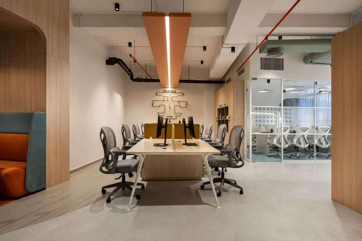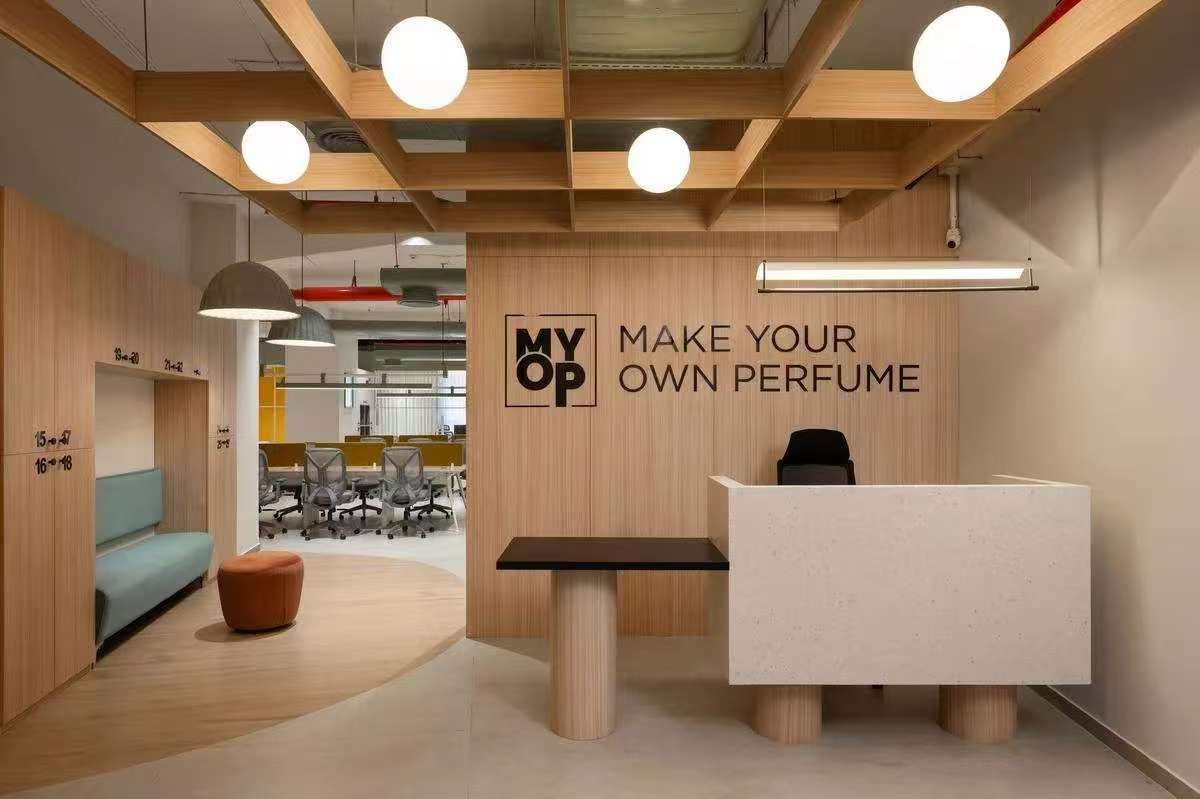 设计师对功能分区的处理堪比精密香调表:头脑风暴区采用渐变雾面玻璃隔断,模拟香水前调的透明感;决策会议室以温暖灰色栅塑造中调的醇厚;而茶歇区的橙红色跳跃如尾调的余韵。精心选配的灯具照明让人工光晕与自然光影在空间中共振,正如顶级香水在皮肤上随时间推移绽放不同层次的芬芳。在这个以可持续材料构筑的香氛工作室里,每处细节都在述说材料诗学:拼接的波浪形地面呼应香水瓶的流体美学;圆润的软体家具吸收足音如海绵吸纳多余香调;甚至连新风系统都在模拟林间清风携带花香的漫游轨迹。当斜阳将钢构投影谱写在素混凝土色的地面上,整个空间仿佛巨型香水瓶盛满金色溶液,等待被某个灵感点燃,迸发出改变气息纪元的创造性焰火。