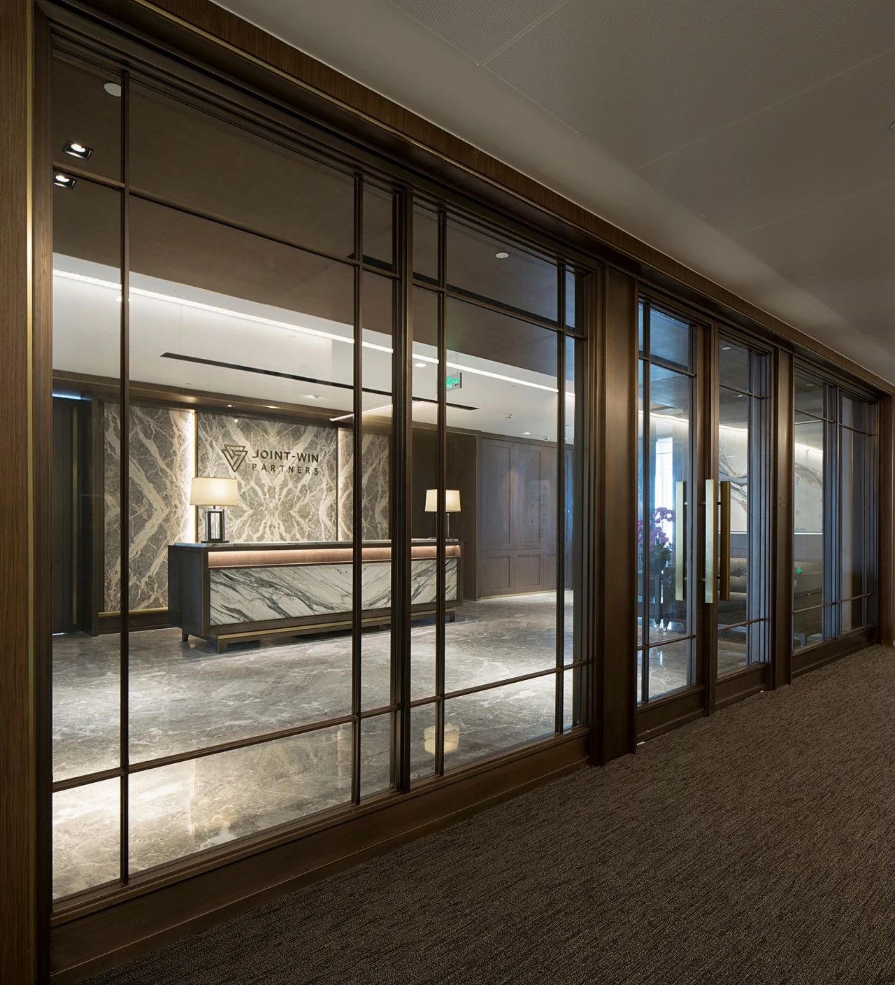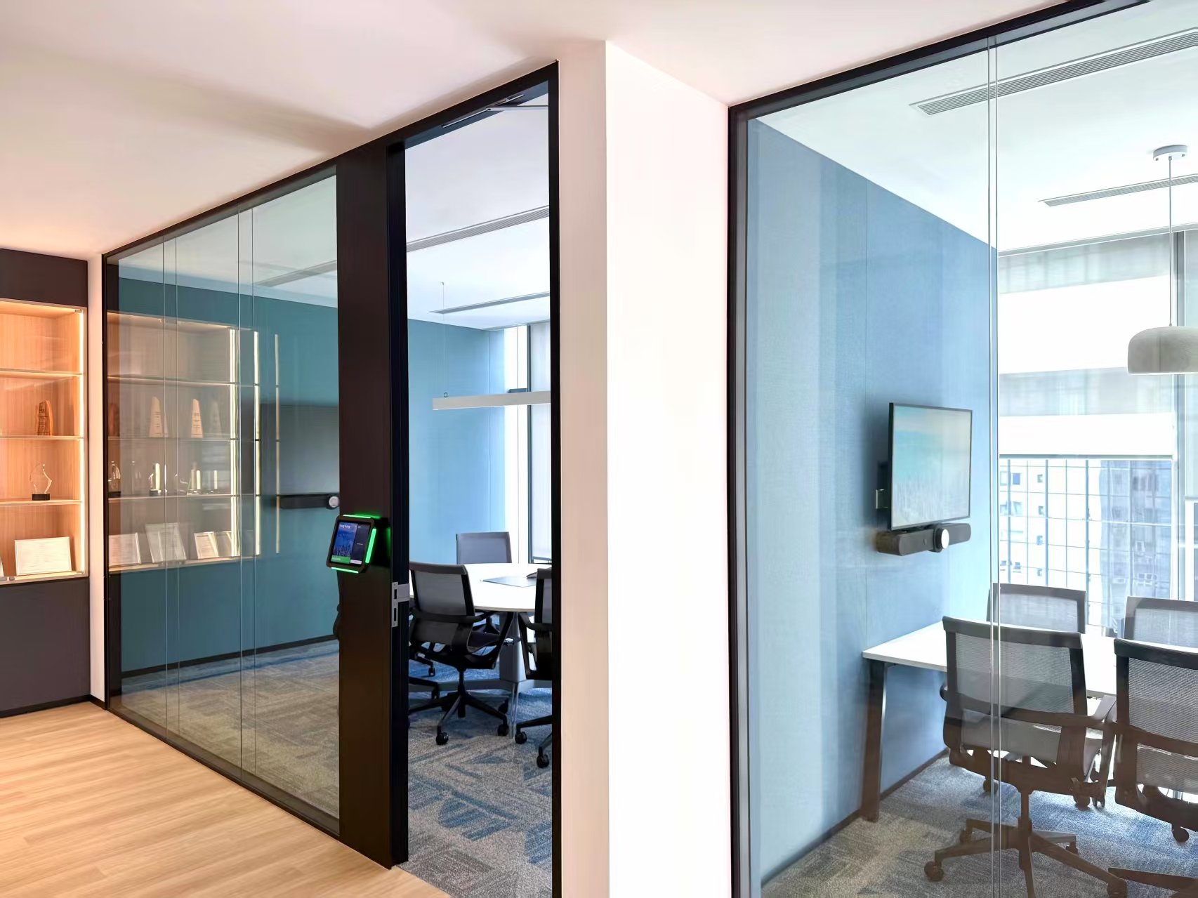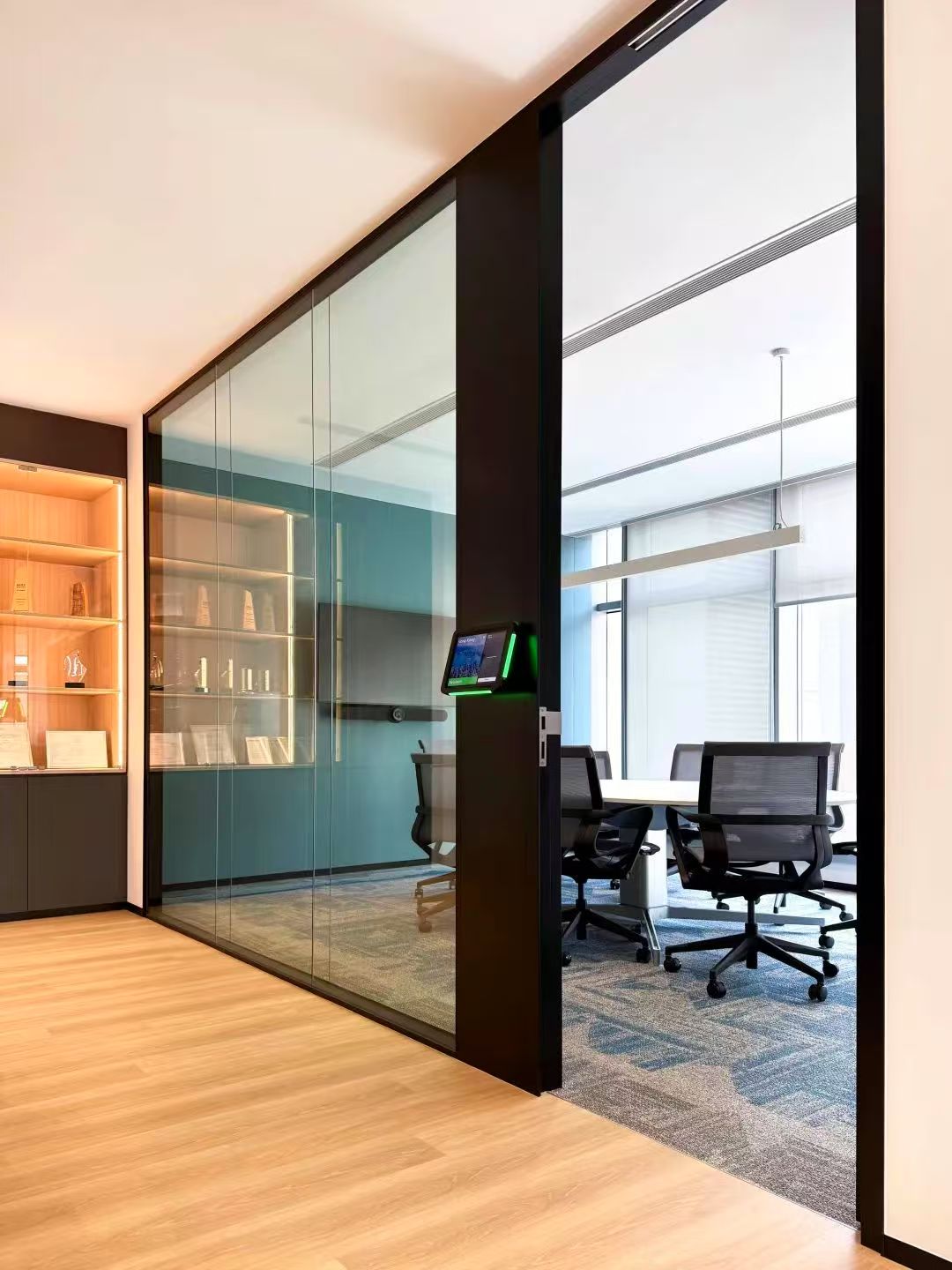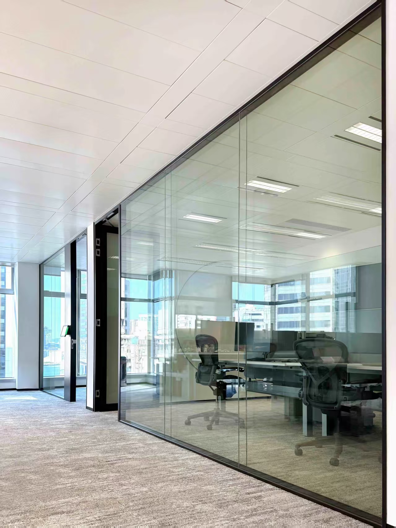 采用哑光黑L100双层超白玻璃系统相结合,玻璃与玻璃之间采用无缝拼接工艺,提供了极佳的透光性和隔音效果,让自然光线在室内自由流动,营造出明亮舒适的办公环境。