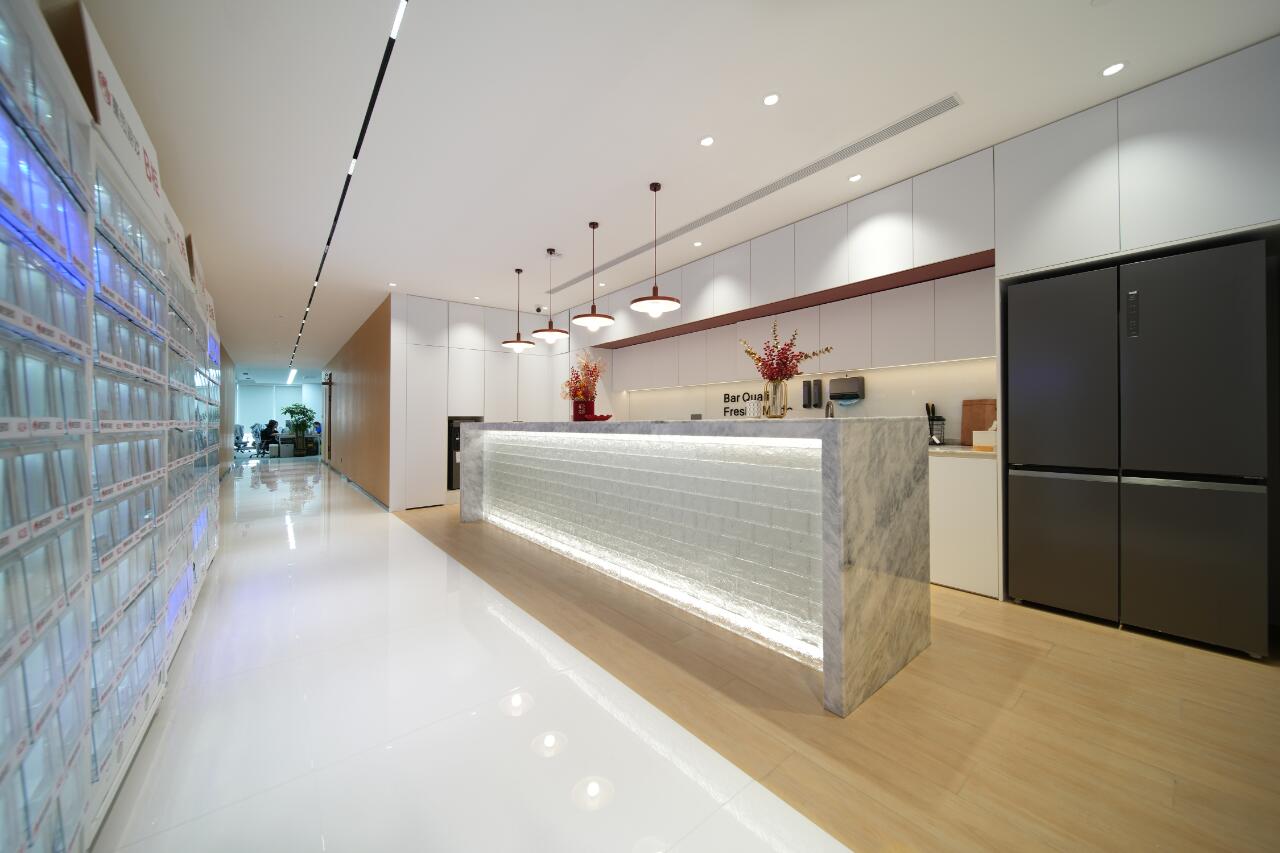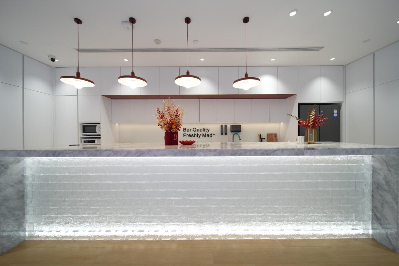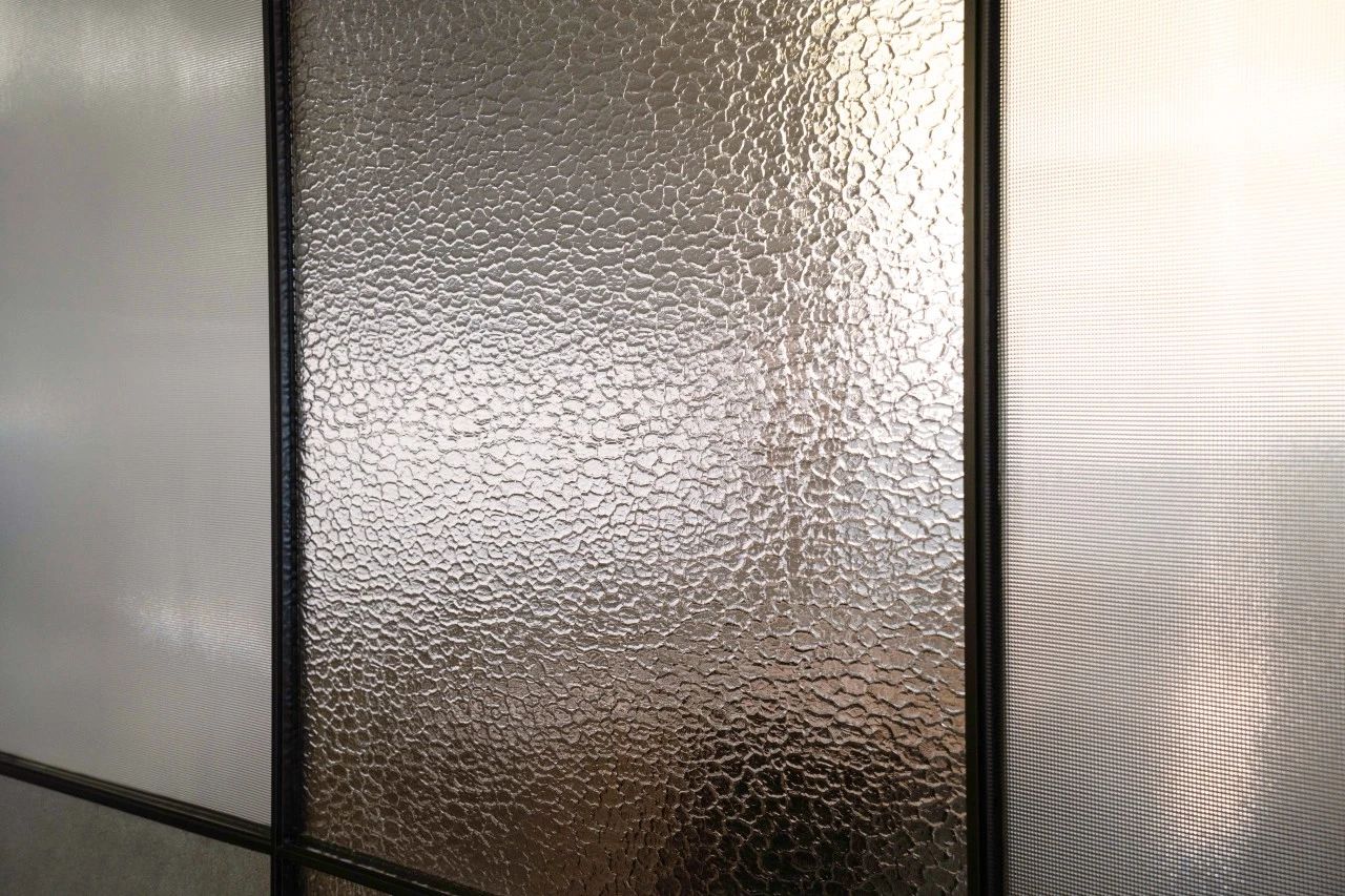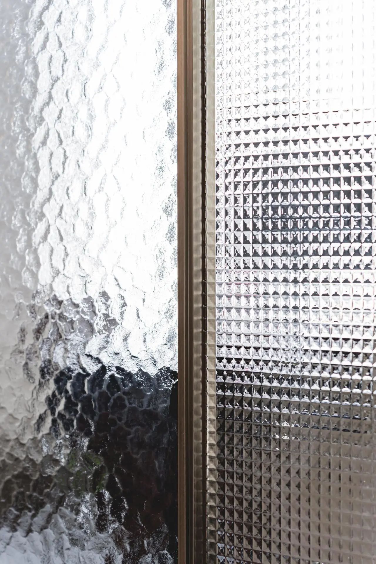 定制铝框玻璃屏风隔断 —— 将磨砂、格纹、锤纹、冰花四种图案玻璃以现代几何构成的设计手法拼构、穿插于空间中,既满足了功能区域有效分隔的需要,也赋予空间视觉上的节奏感与精致感。被灯光点亮的玻璃图案元素,丰富了空间语言与颗粒度,很好地平衡了空间的虚与实,疏与密的关系。