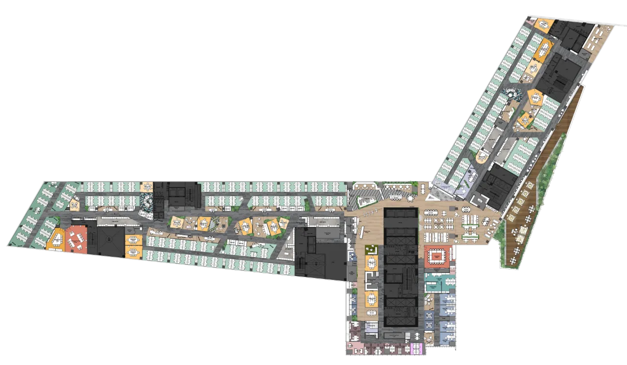 我们将碧点的新办公室构想为一座大都会(Metropolis),一座充满活力、前瞻性且洋溢着乐观主义的城市。这一灵感源自都市的空间设计,旨在激发创意与潜能。它拥有清晰的区域划分,包括邻里(Neighbourhood)、公园(Park)和各项便利设施,以增强社区感与互联性。