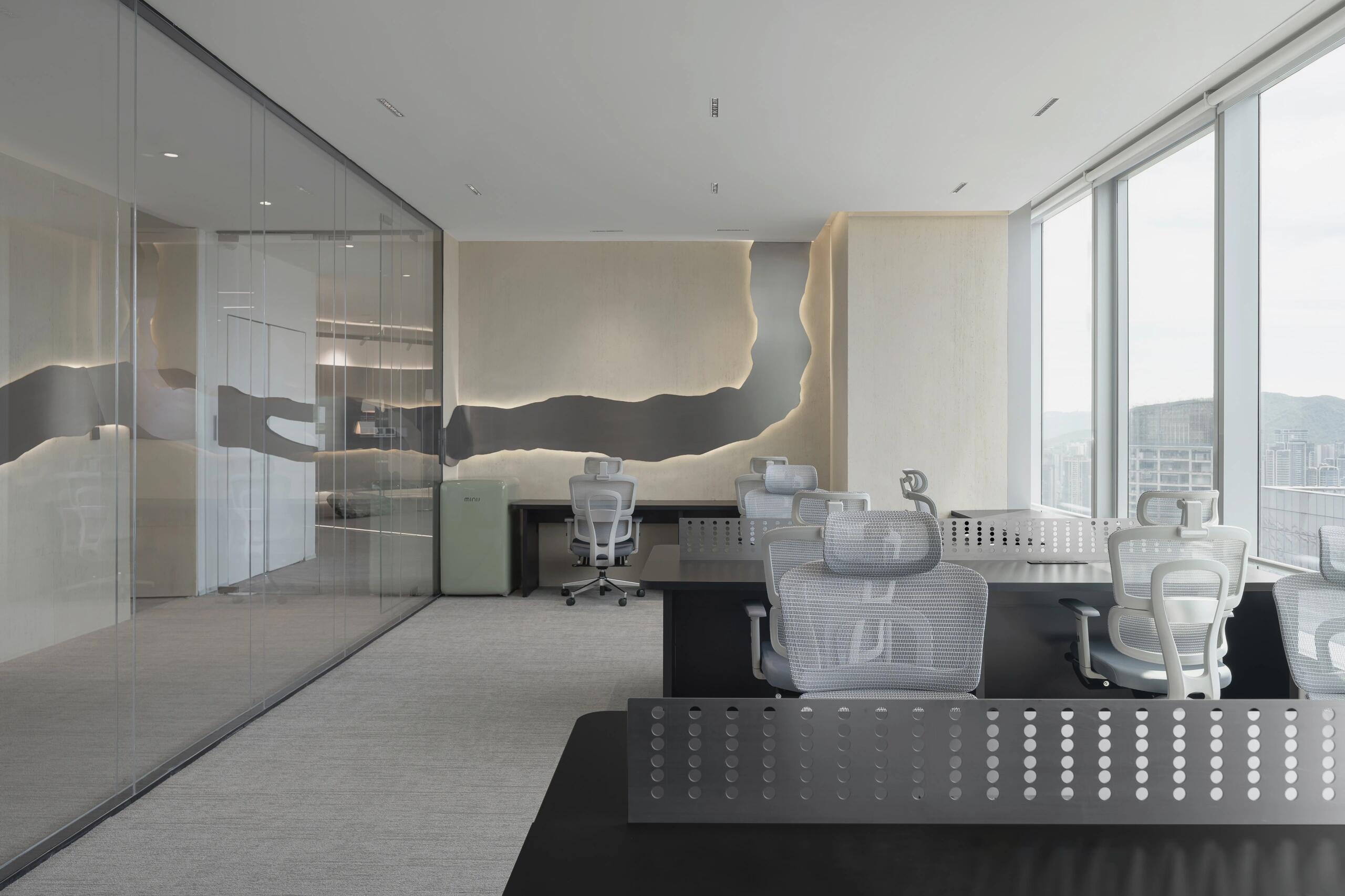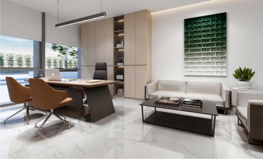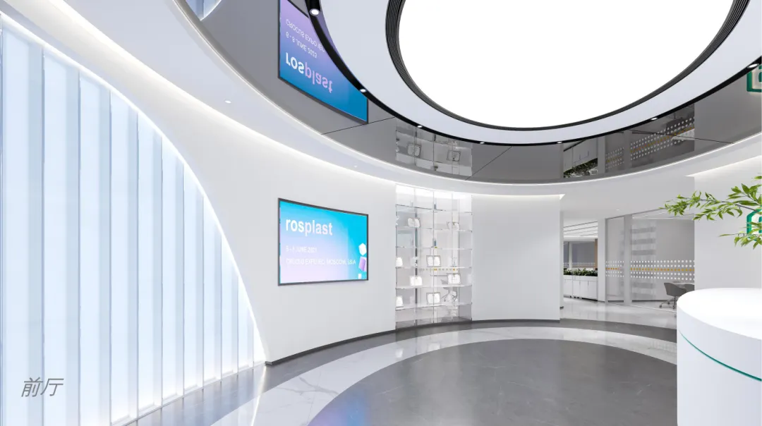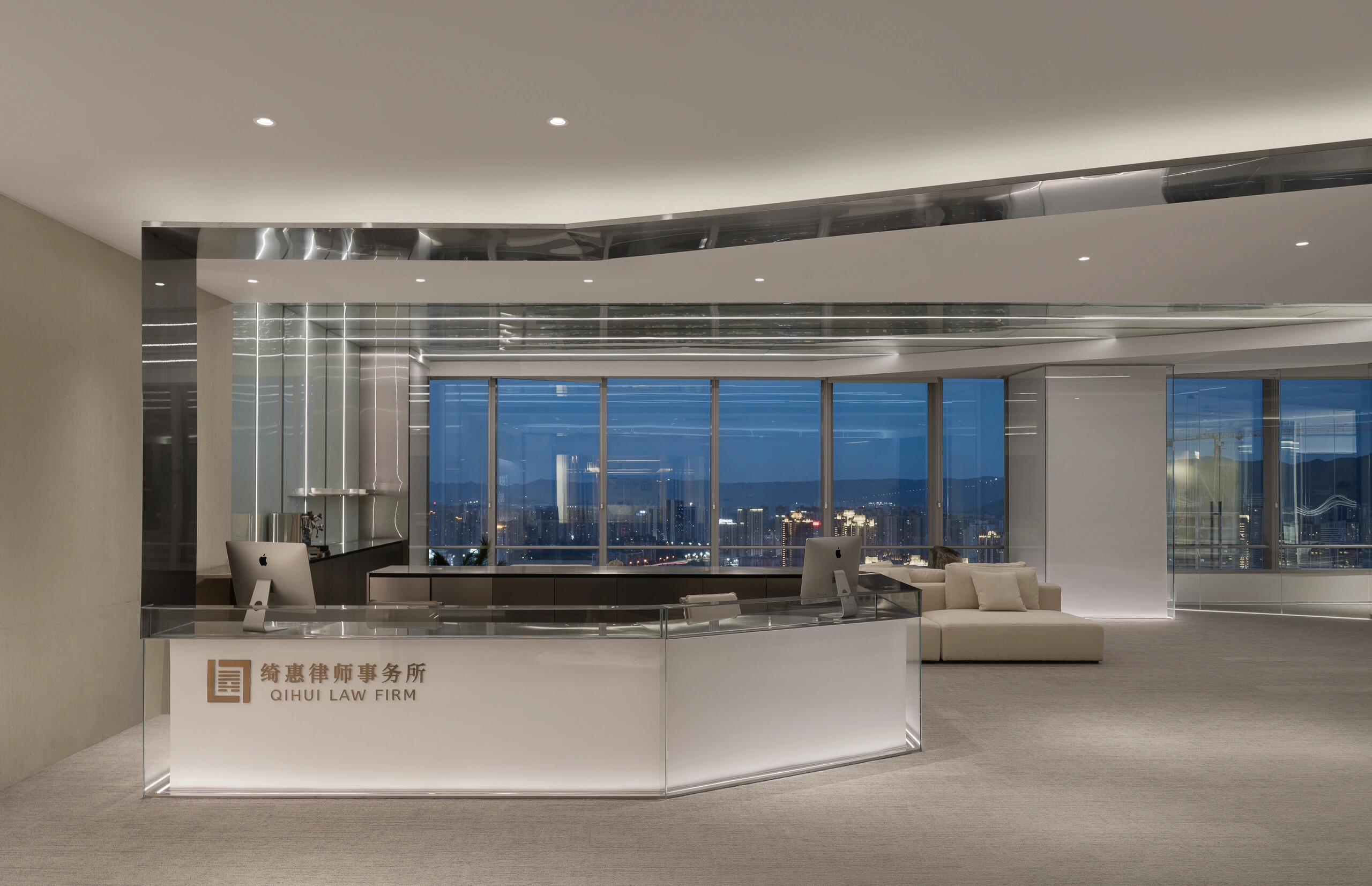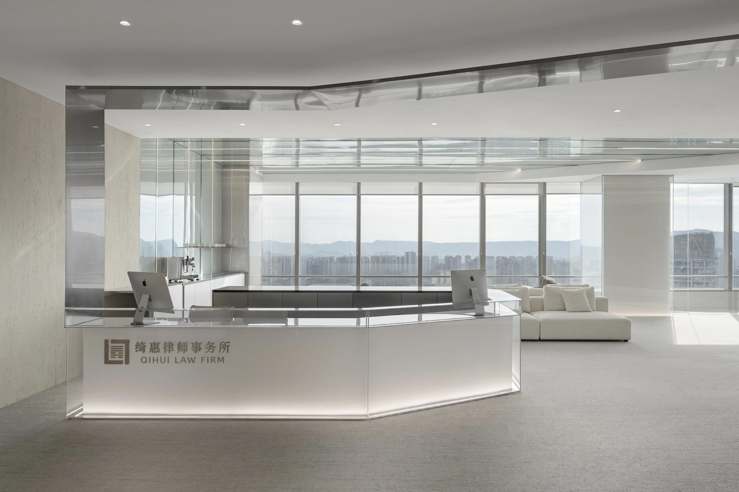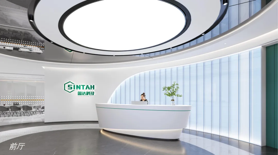 前台位于办公室入口的中心位置,采用白色为主色调,配以绿色的线条装饰,显得非常干净整洁。前台上方有一个大型的圆形灯具,为整个空间增添了现代感。前台旁边摆放了一盆绿植,增加了自然的元素。