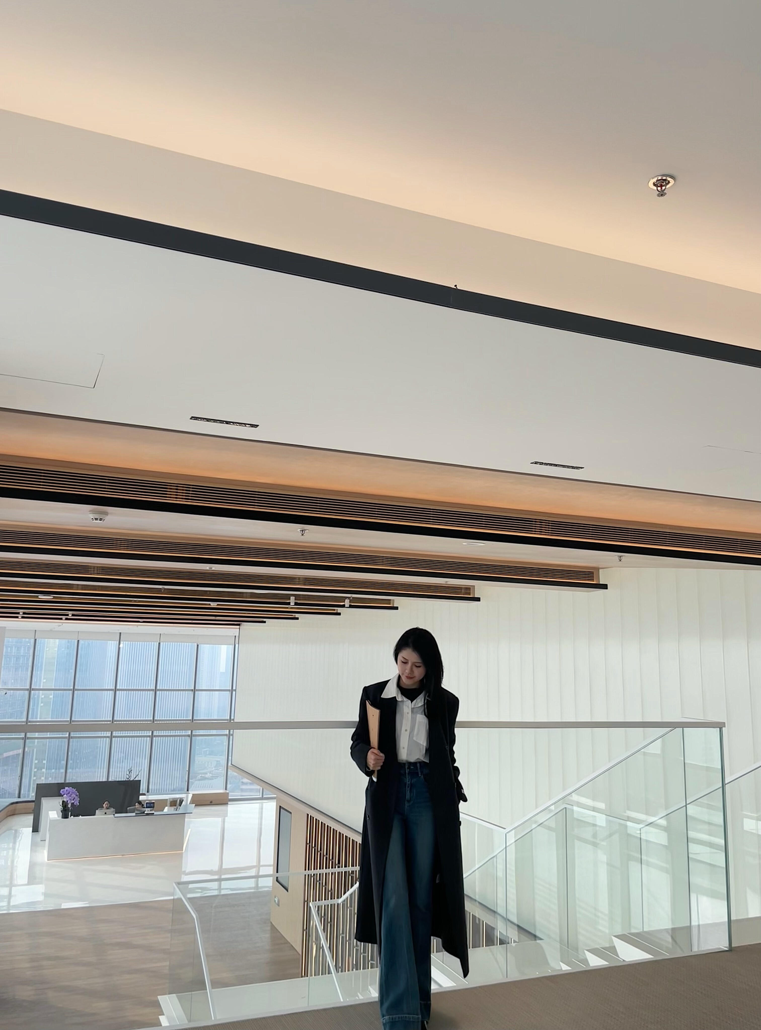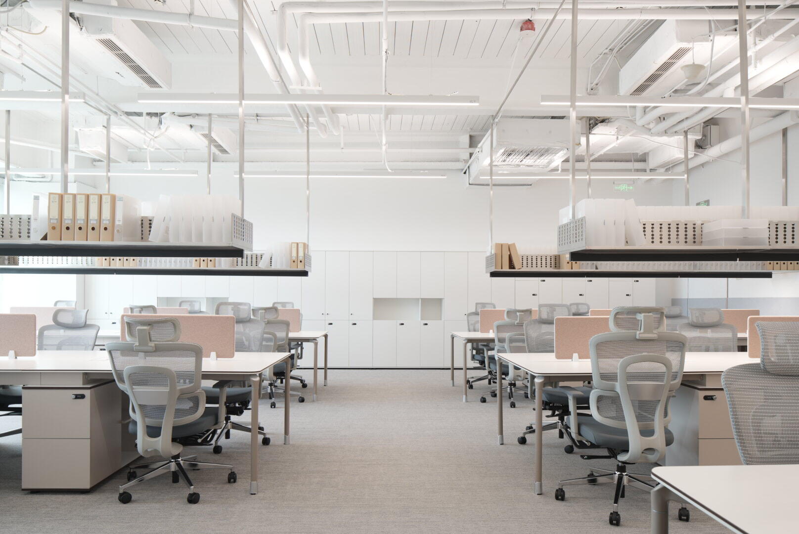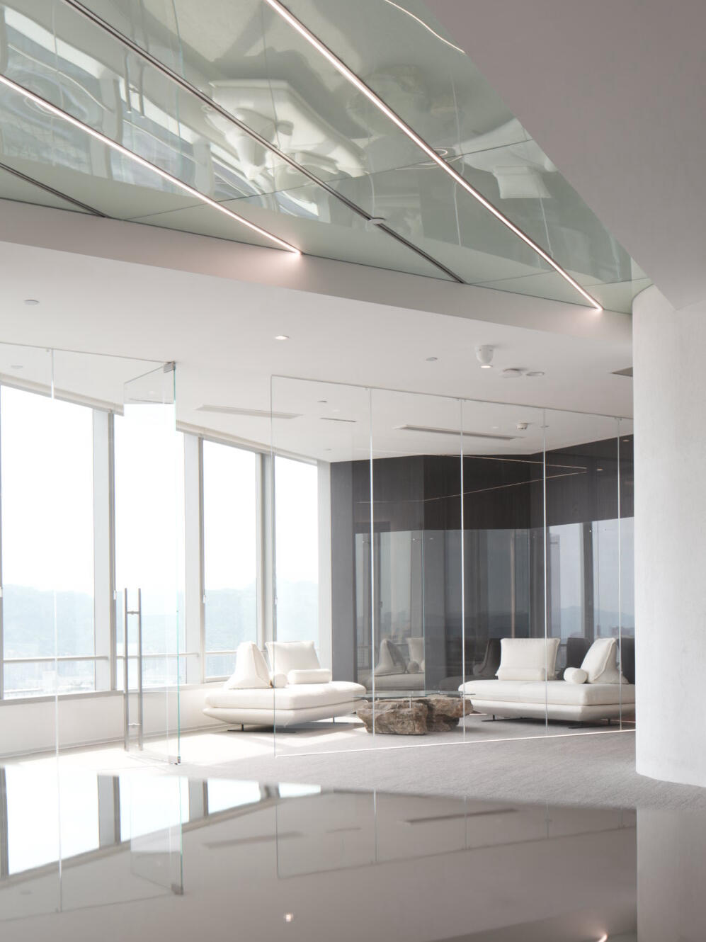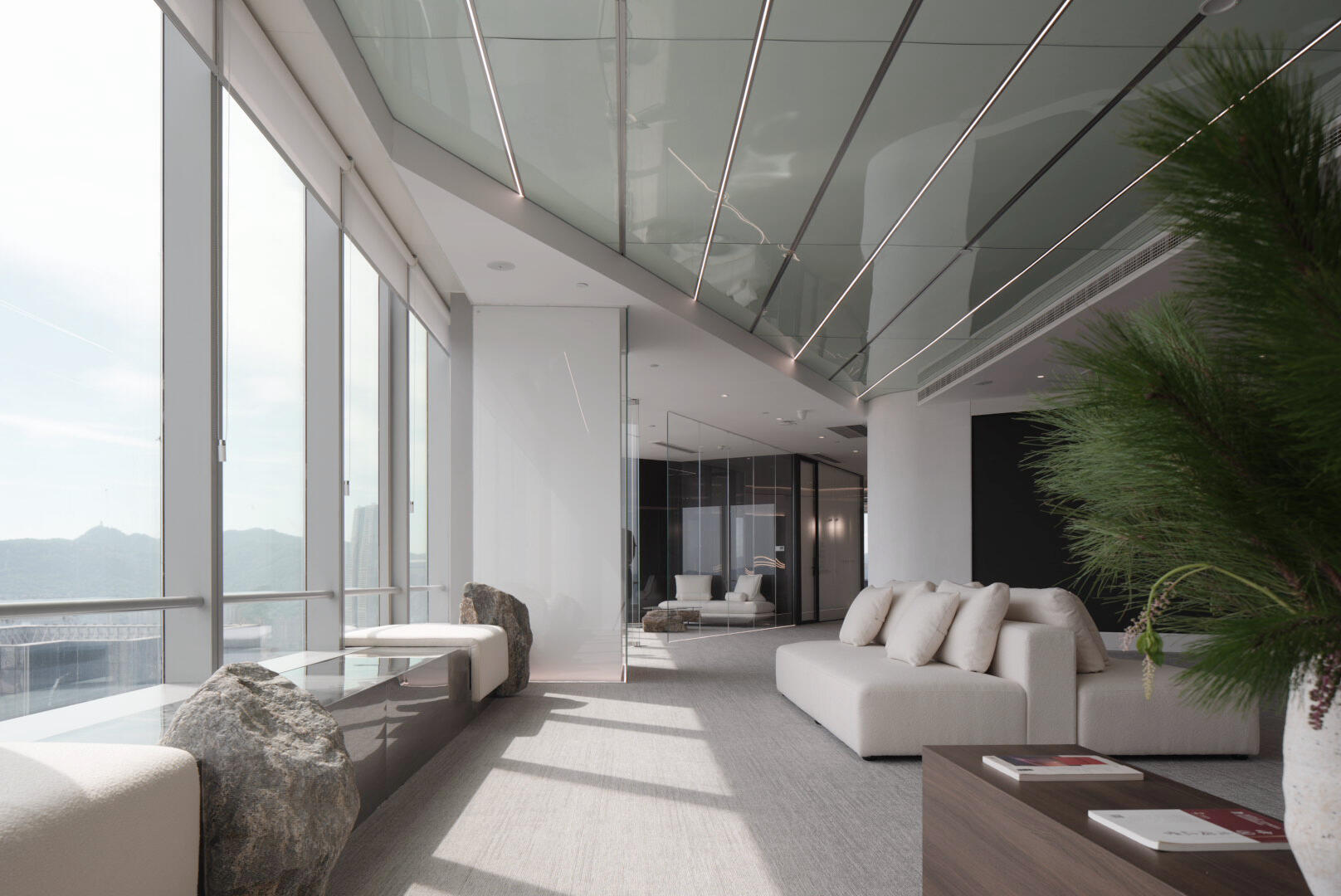 前台位于办公室入口的中心位置,采用白色为主色调,配以绿色的线条装饰,显得非常干净整洁。前台上方有一个大型的圆形灯具,为整个空间增添了现代感。前台旁边摆放了一盆绿植,增加了自然的元素。