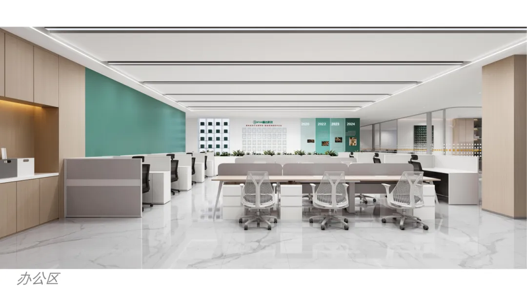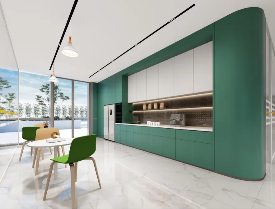 左侧墙面采用了木质材料,右侧墙面则使用了浅绿色调,营造出一种温馨且富有活力的氛围。茶水间采用绿色为主色调,配以白色的吊柜,显得非常干净整洁。茶水间内配备了冰箱、微波炉、咖啡机等设备,方便员工随时享用热饮和小吃。