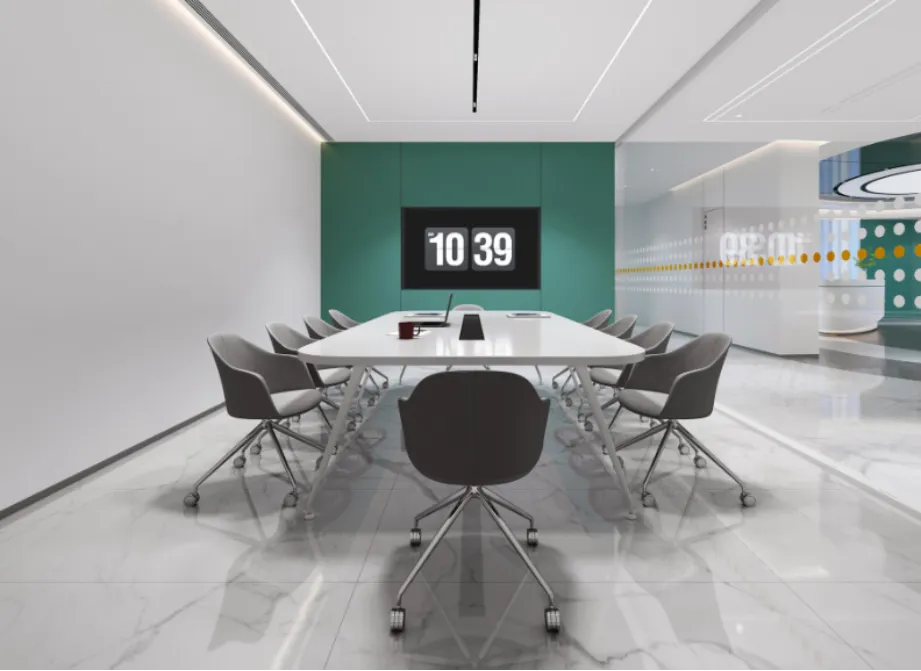 会议室整个空间采用了简洁而时尚的设计元素,给人一种清新和专业的感觉。会议室的一面墙壁被涂成了绿色,上面挂着一个大屏幕,这种设计不仅具有视觉冲击力,还能提醒参会者注意时间管理。