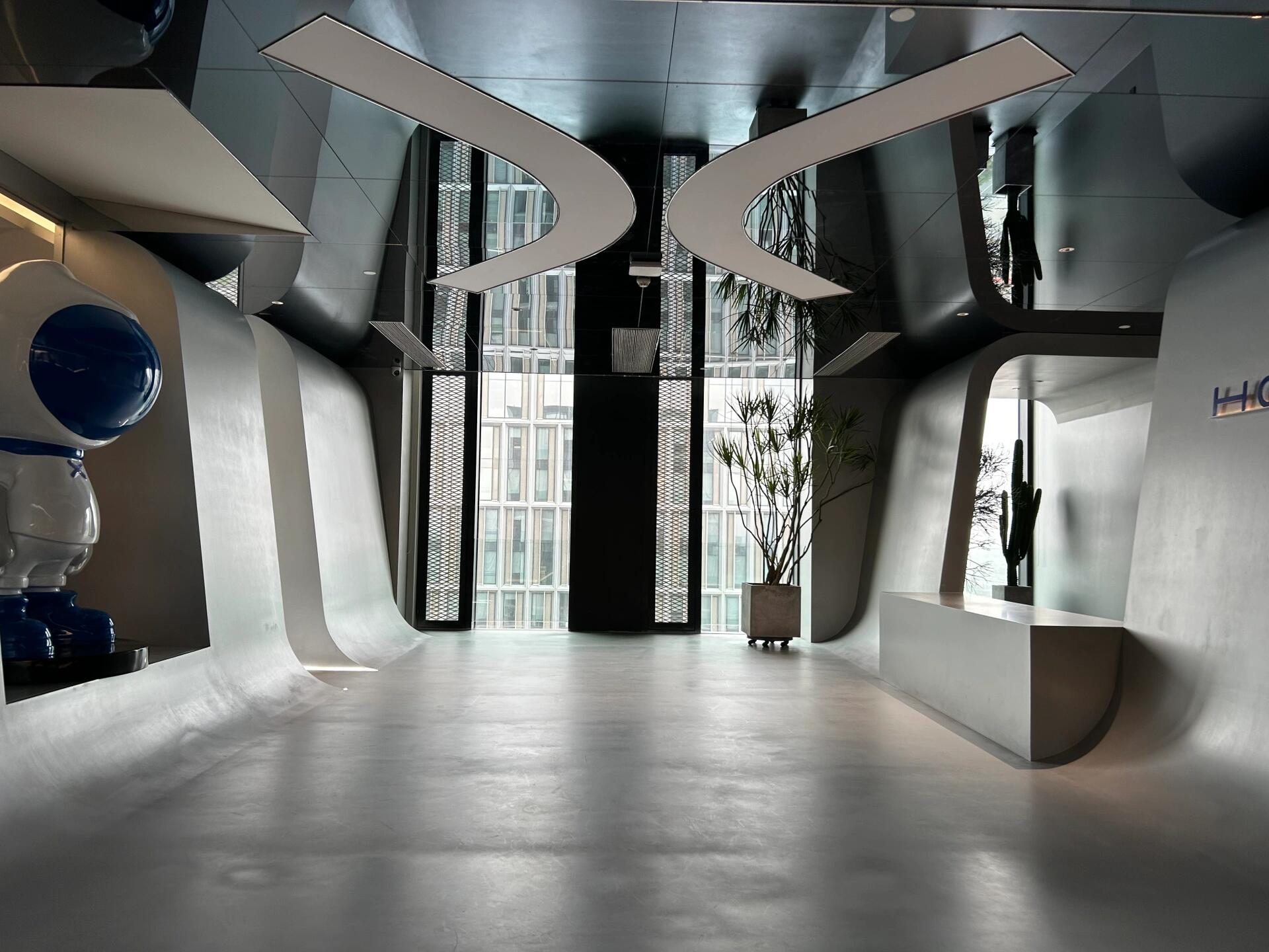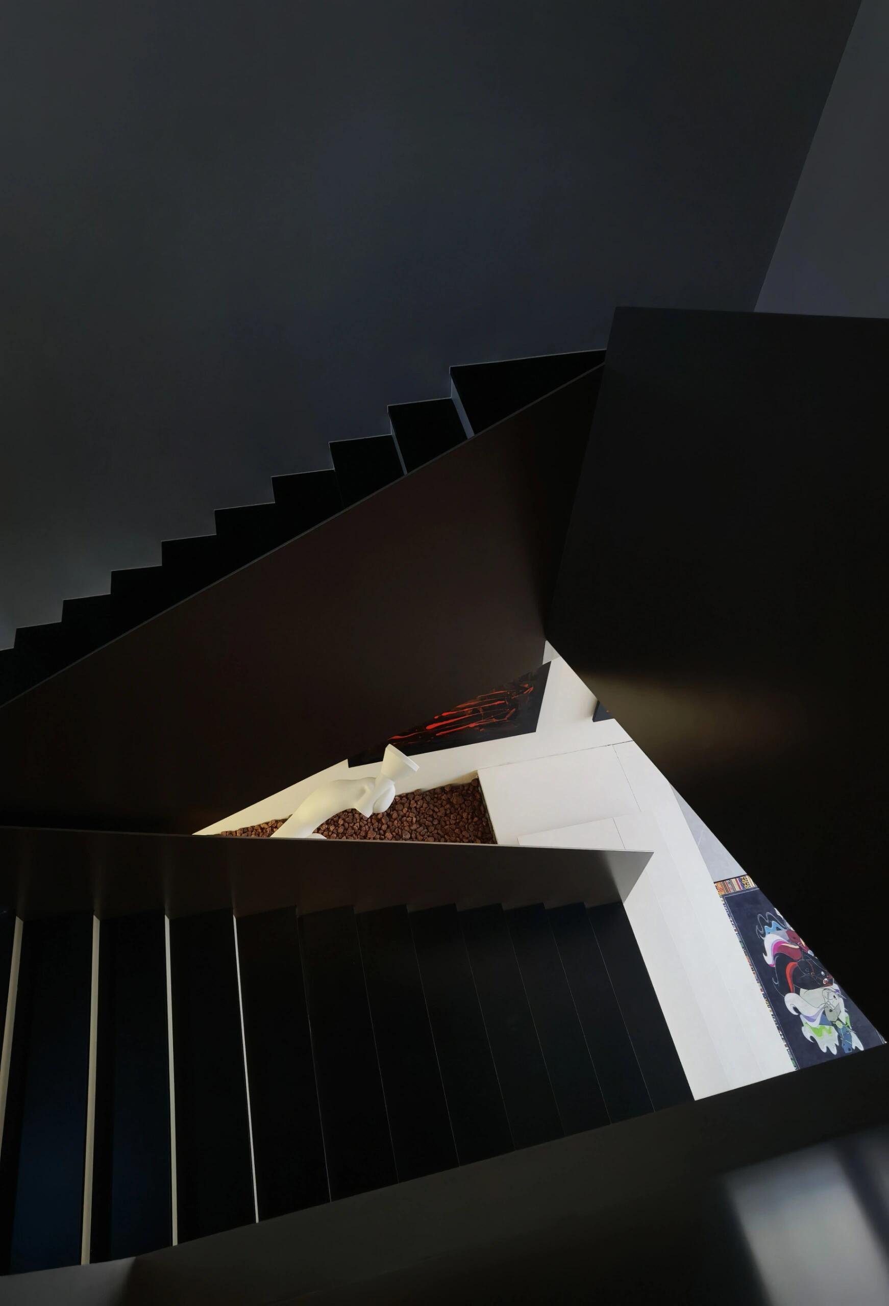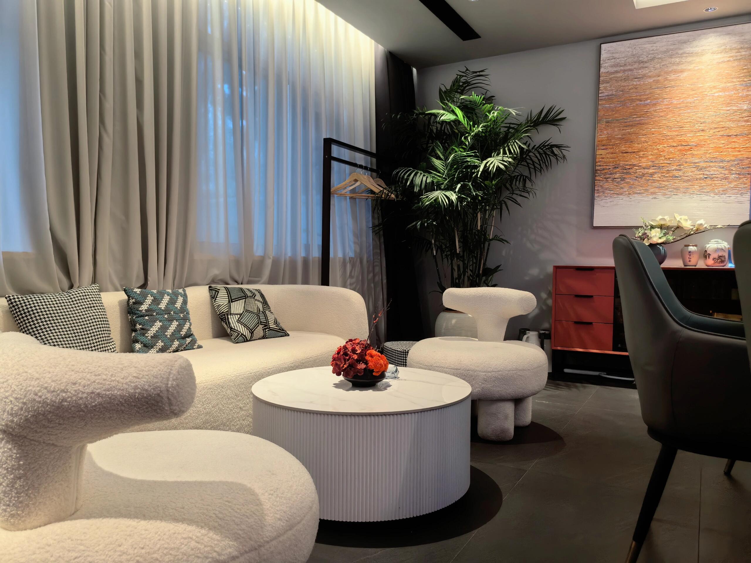 软装搭配:使用简洁流线型的沙发、金属与木材质结合的家具,增强空间层次感。