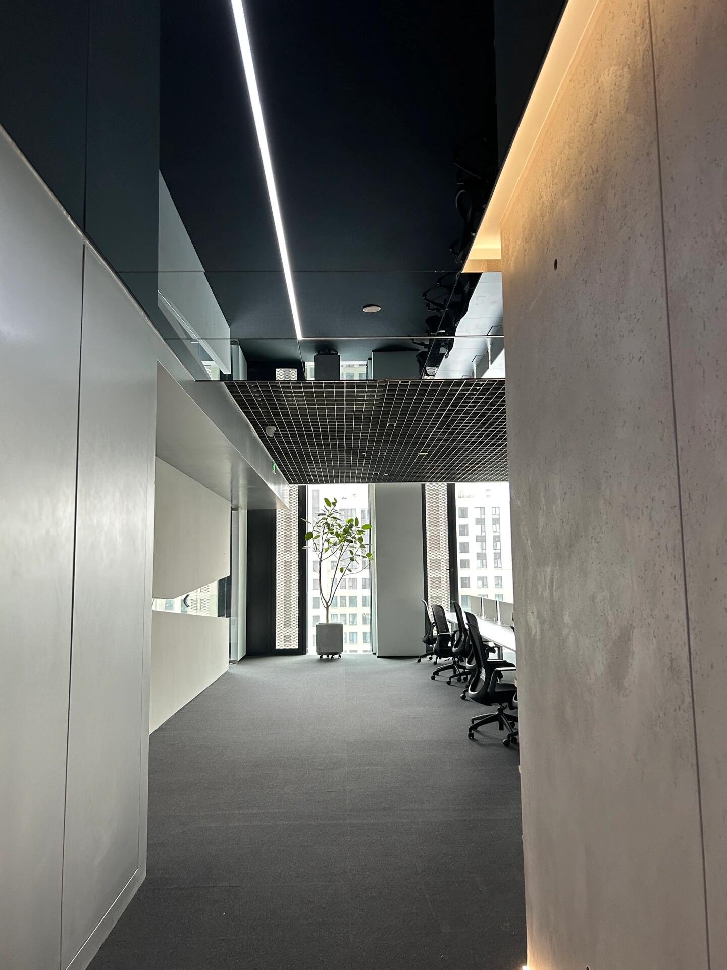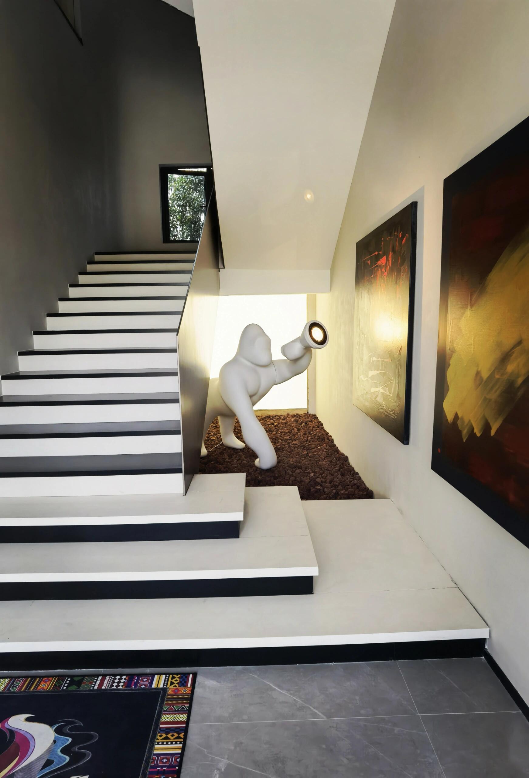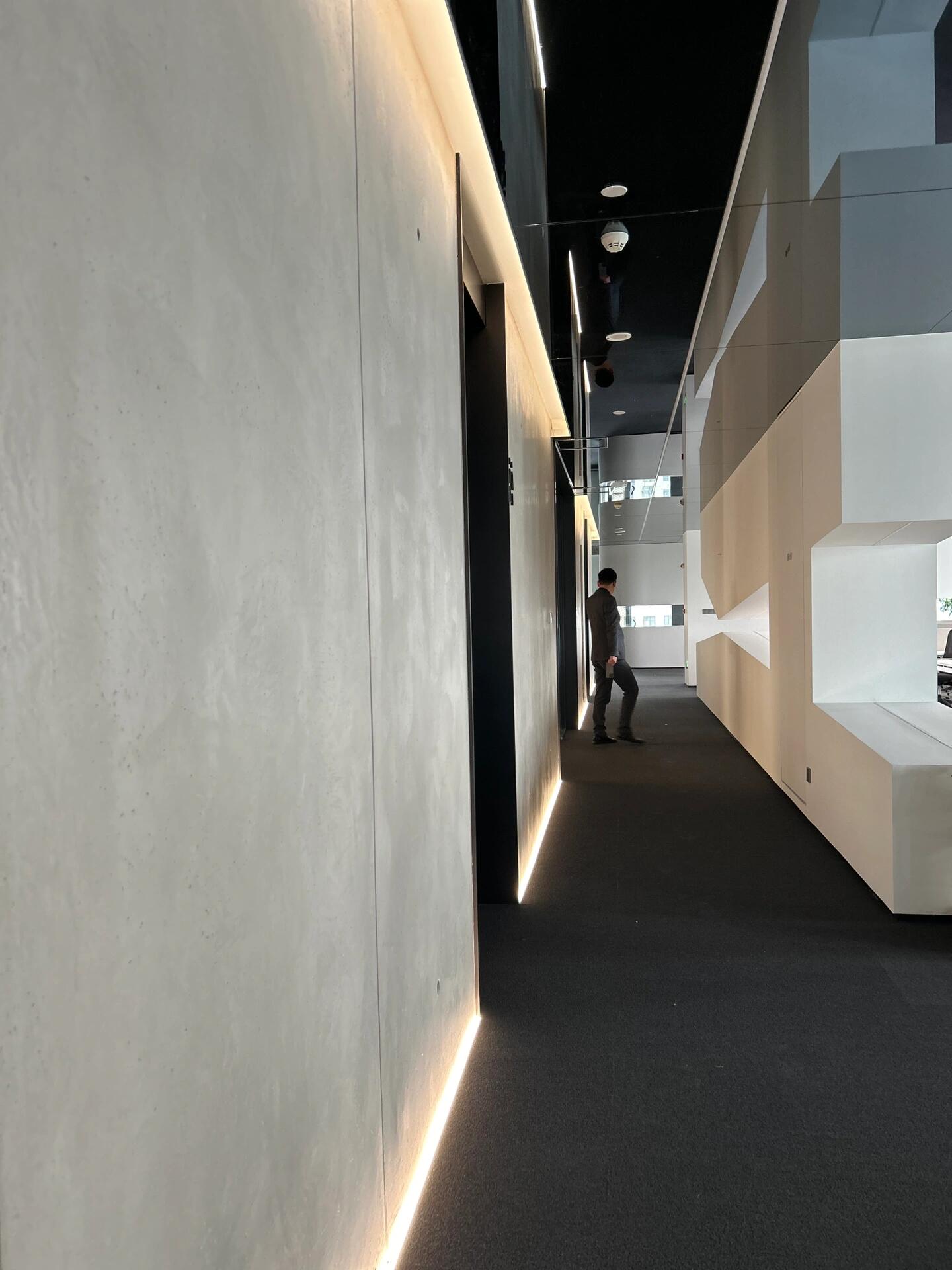 软装搭配:使用简洁流线型的沙发、金属与木材质结合的家具,增强空间层次感。