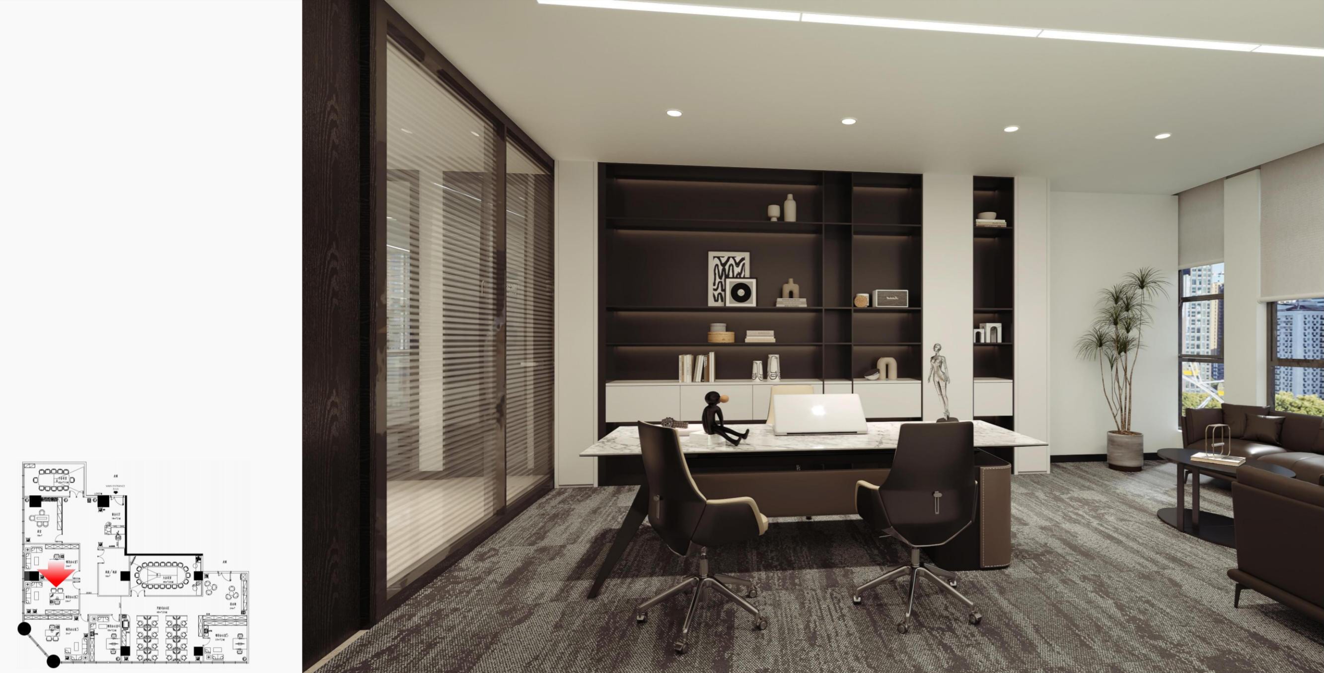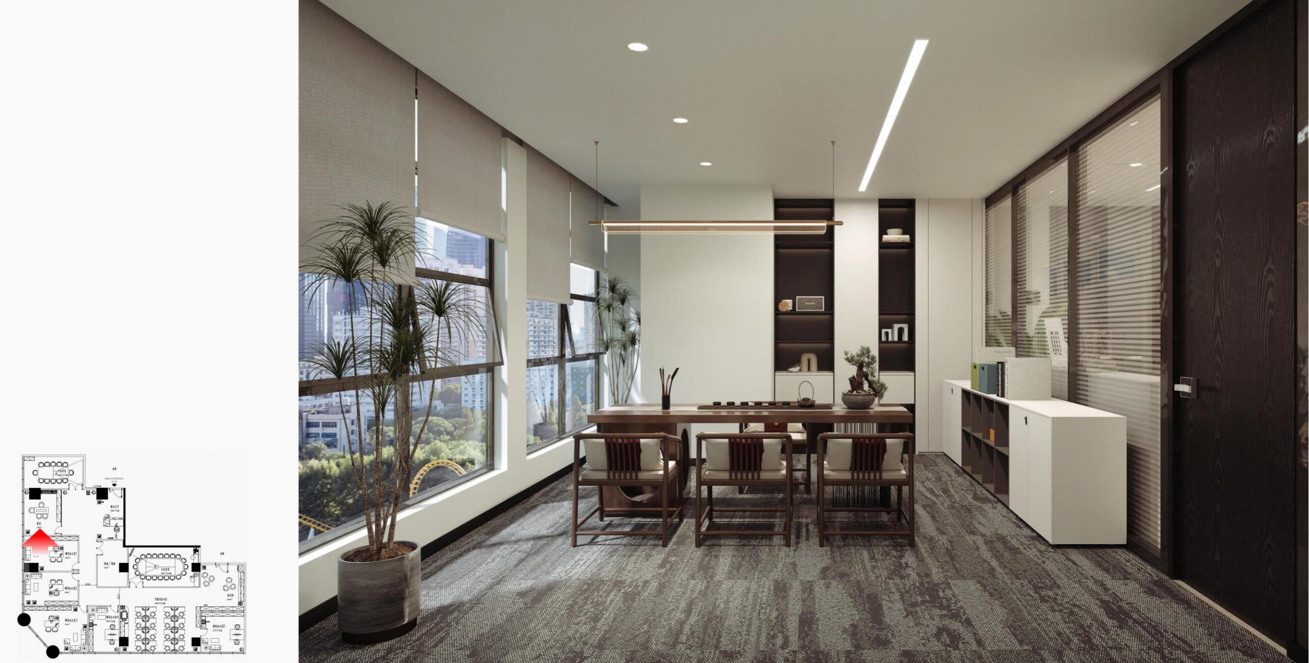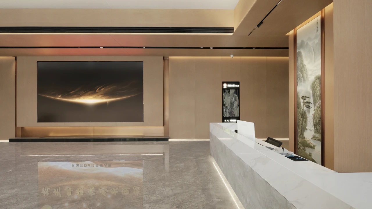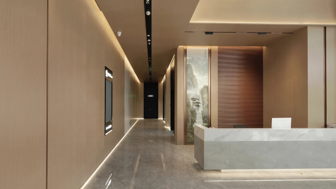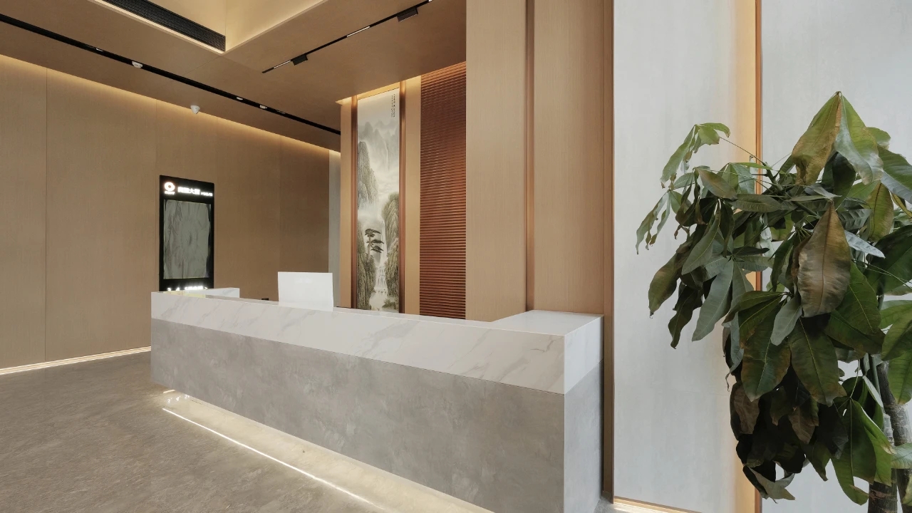 RECEPTION AREA接待区-选用天然岩板纹理,模拟山峦叠嶂的视觉效果,搭配竖向密拼工艺,强化空间纵向延伸感,隐喻“坚韧沉稳”的企业精神。通过热转印工艺还原木纹质感,与岩板形成冷暖对比,中和工业材料的冷硬感,传递自然亲和力。技术细节上,通过材料复合工艺与智能系统的深度整合,实现视觉表现与实用功能的双重突破。
