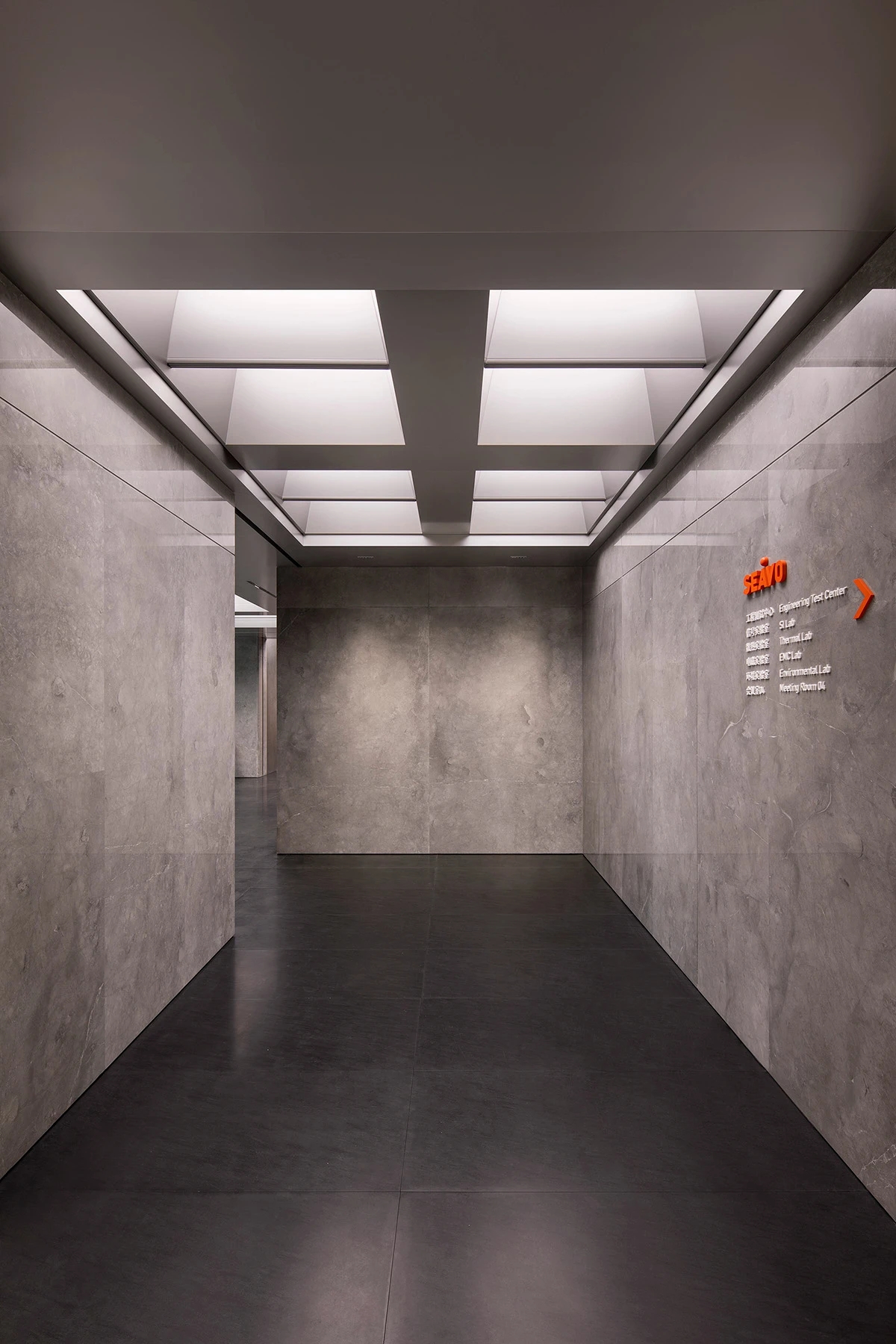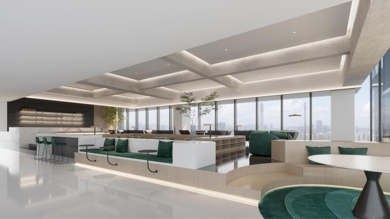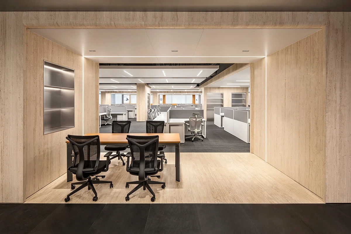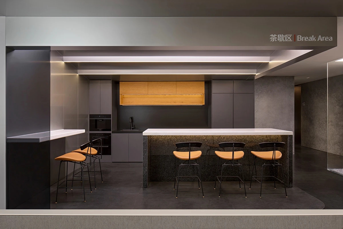 入口电梯前厅,作为空间的第一触点,被赋予“微型剧场”般的仪式感。在保留原始外立面样式的基础上,设计团队以中式横梁为灵感,结合工业风格重构传统建筑语言,通过形态整合消解原有横梁的杂乱感,达成空间调性的统一性。挑高的吊顶以极简的几何语言勾勒出空间的垂直维度,空间单元如诗般展开,摒弃冗余的软装介入,仅通过材质、比例与光线的精确控制构建“留白”的意境,创造出一个可供思绪流动的“负空间”(Negative Space)。访客置身其中,既能感受到工业美学的理性张力,又能在无物的纯粹中捕捉到时间的痕迹与空间的呼吸,从而获得一种超越物质层面的精神共鸣。“在相对老旧的工业建筑中,我们面临的最大挑战是如何合理规划功能区,故而摒弃了传统的隔墙划分方式,利用现有结构和中央体量之间的空间,创造出一种非线性的循环布局,这样避免了空间的拥挤并且最大化地利用了每一寸空间。”设计师如是说。
