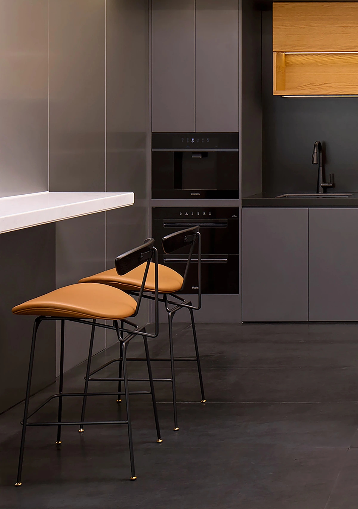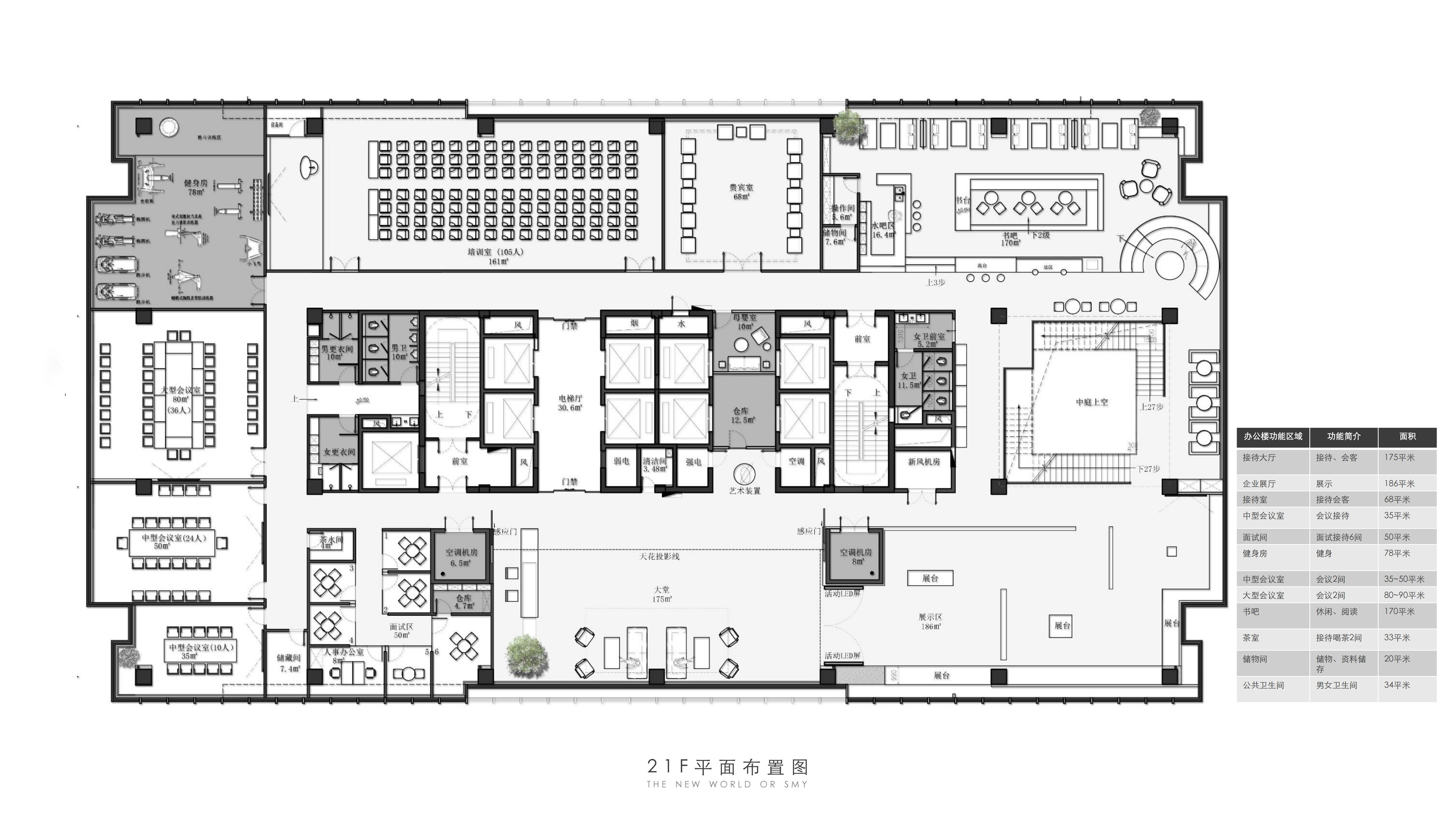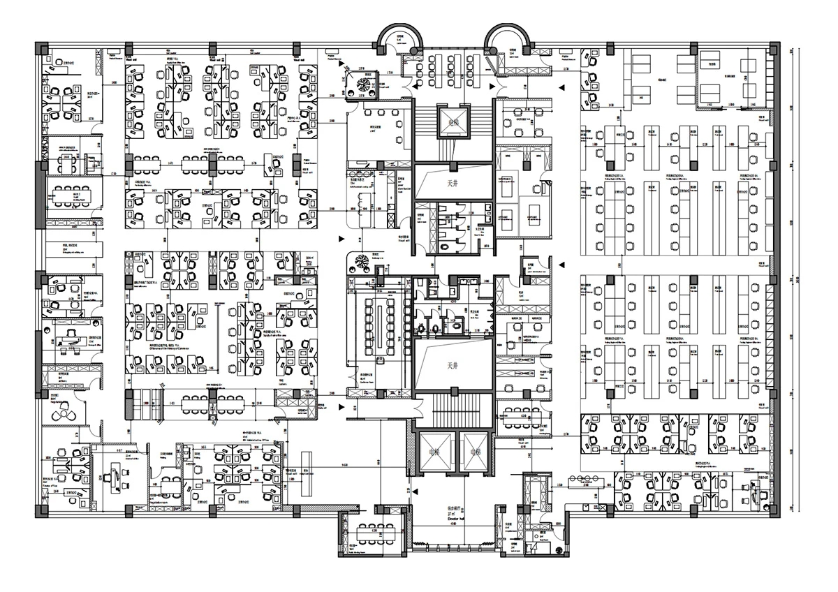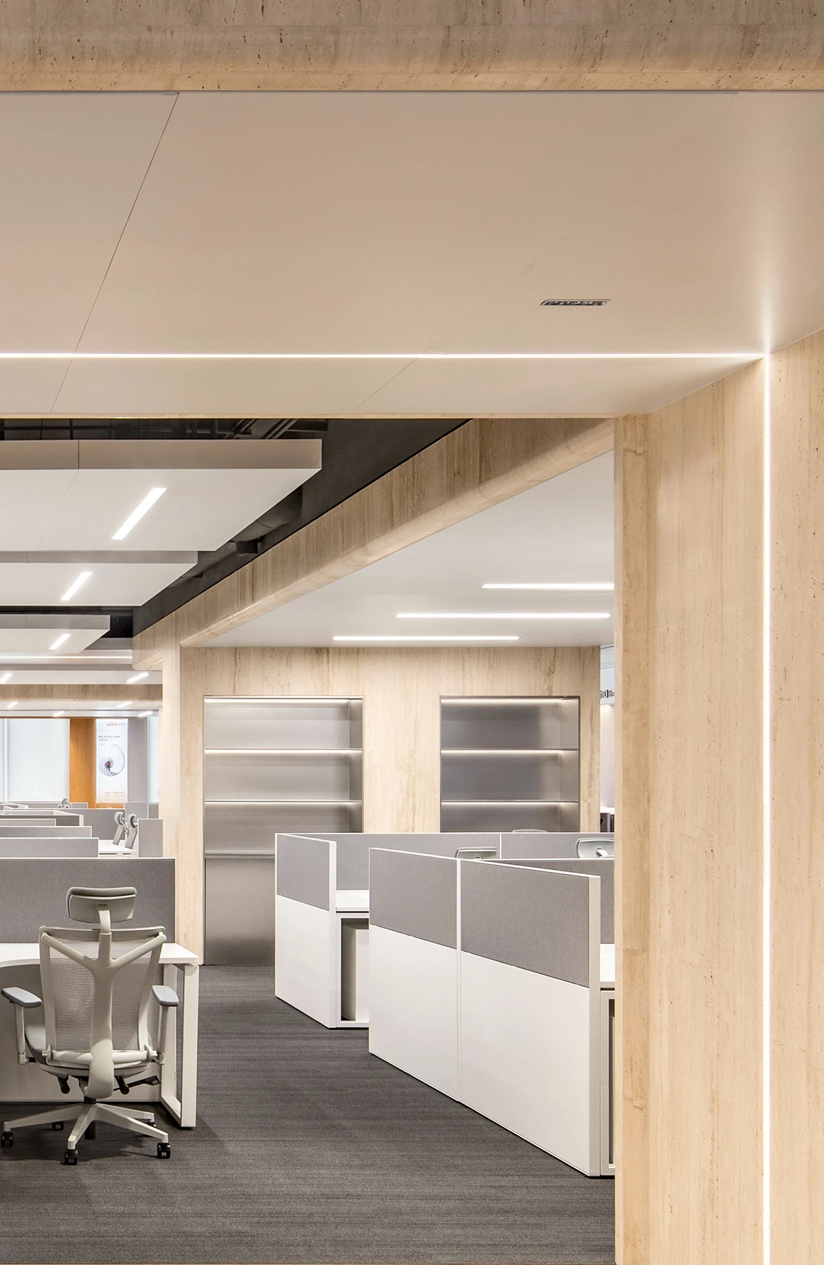 入口电梯前厅,作为空间的第一触点,被赋予“微型剧场”般的仪式感。在保留原始外立面样式的基础上,设计团队以中式横梁为灵感,结合工业风格重构传统建筑语言,通过形态整合消解原有横梁的杂乱感,达成空间调性的统一性。挑高的吊顶以极简的几何语言勾勒出空间的垂直维度,空间单元如诗般展开,摒弃冗余的软装介入,仅通过材质、比例与光线的精确控制构建“留白”的意境,创造出一个可供思绪流动的“负空间”(Negative Space)。访客置身其中,既能感受到工业美学的理性张力,又能在无物的纯粹中捕捉到时间的痕迹与空间的呼吸,从而获得一种超越物质层面的精神共鸣。“在相对老旧的工业建筑中,我们面临的最大挑战是如何合理规划功能区,故而摒弃了传统的隔墙划分方式,利用现有结构和中央体量之间的空间,创造出一种非线性的循环布局,这样避免了空间的拥挤并且最大化地利用了每一寸空间。”设计师如是说。