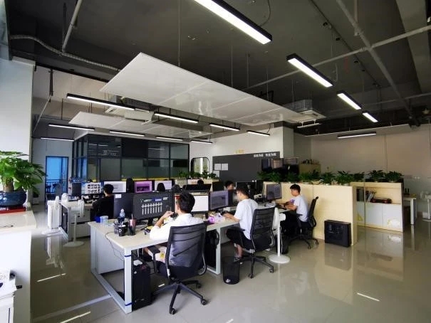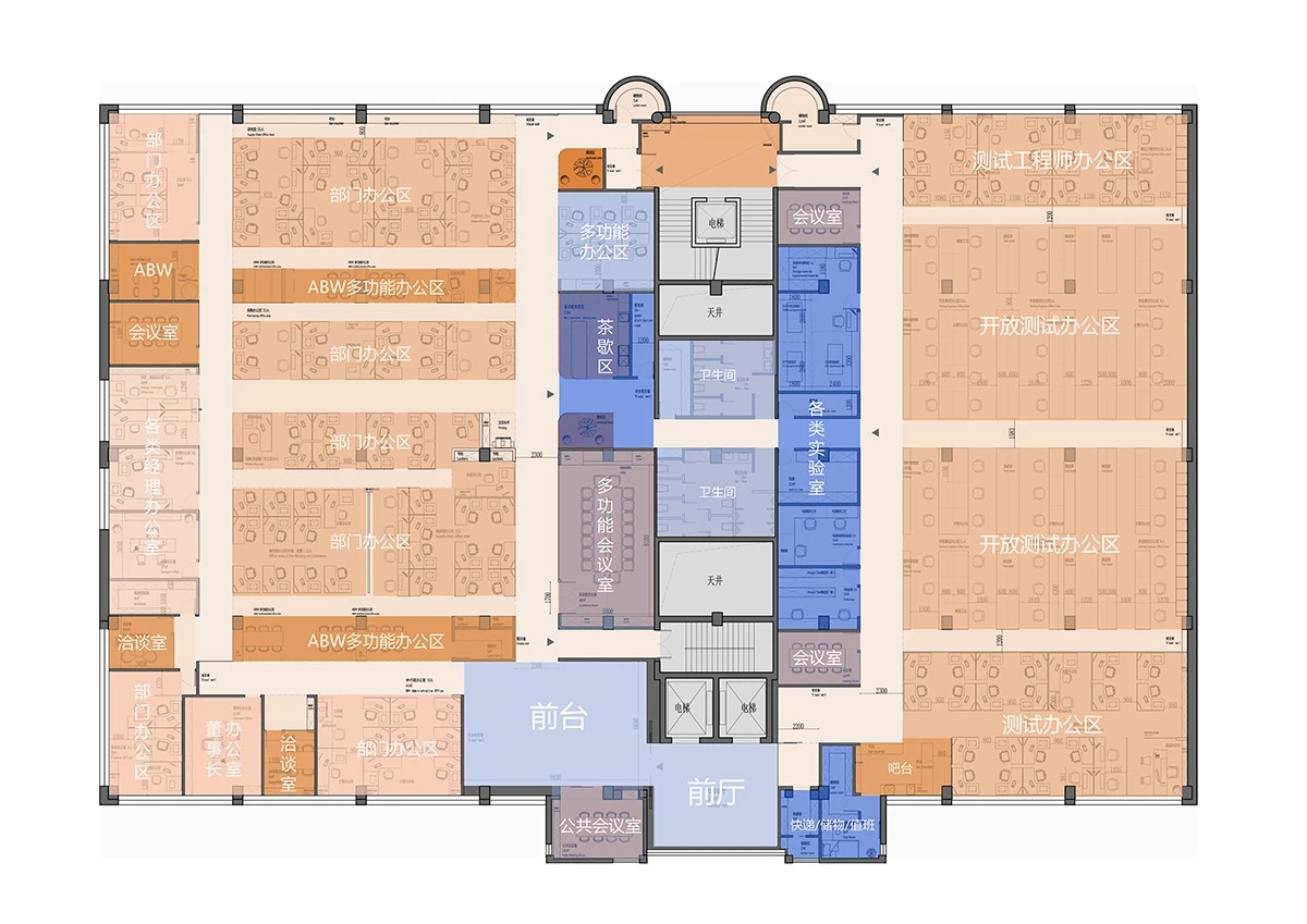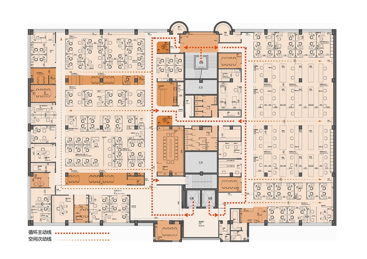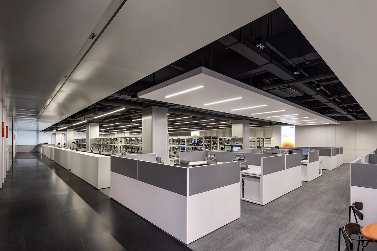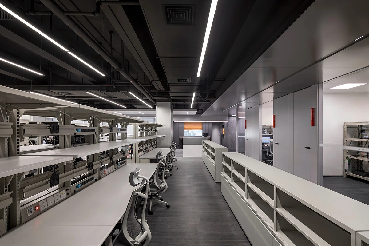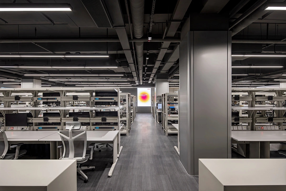 办公区围绕中央核心区展开,东侧办公区为测试产线和实验室,西侧为办公室和工位,形成多个开放式协作空间,同时通过灵活的半开放式隔断设计,确保每个区域既能独立运作,又能相互连接。一条环形走廊构成了循环主动线,会议室和休息区被巧妙嵌入动线的关键节点上,实现了工作与休息模式的无缝切换。私密工作区则被设置于相对安静的角落,通过独立通道与主循环动线相连,在保障私密性的同时,维系了空间的流动性,为员工提供了高效且舒适的工作环境。