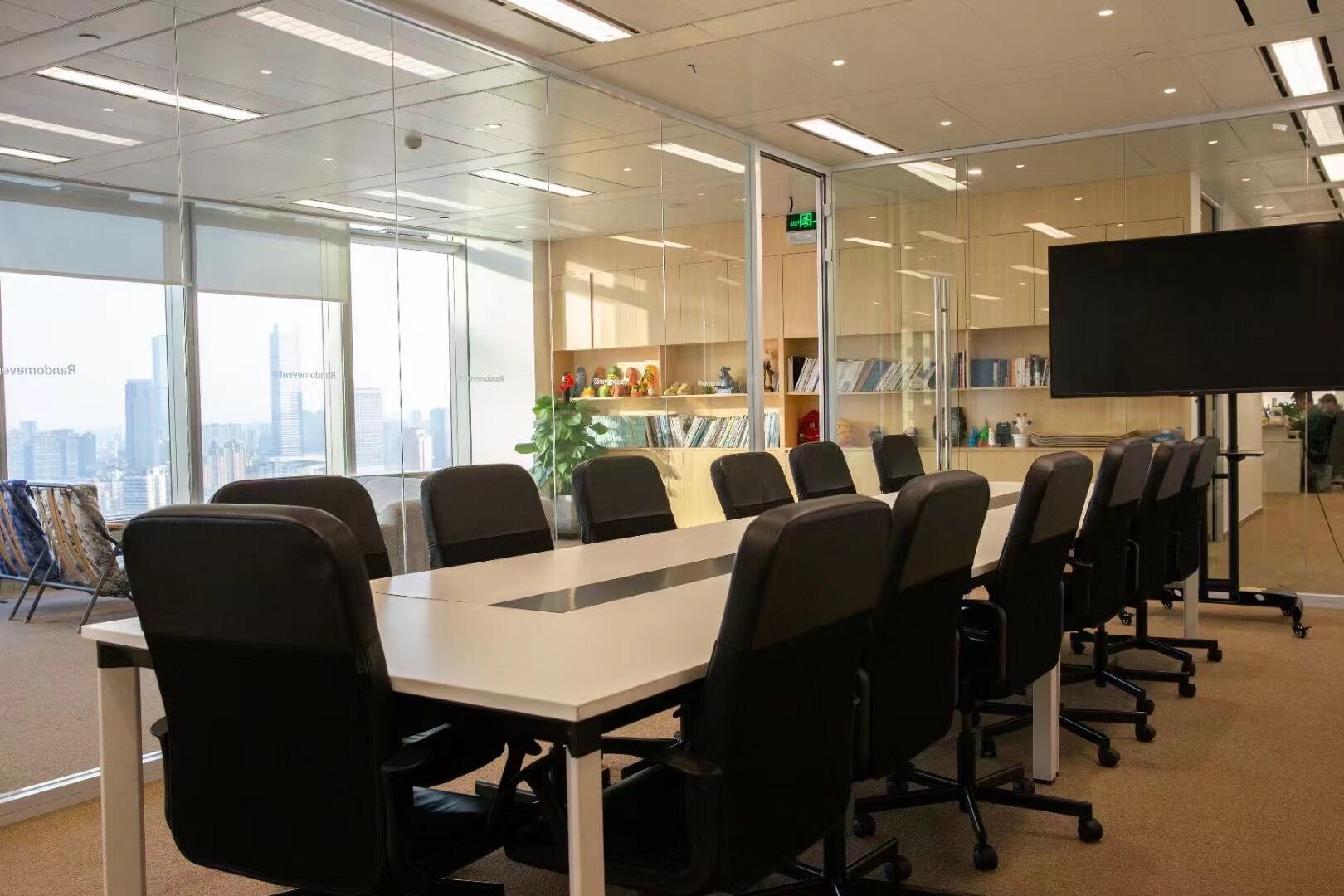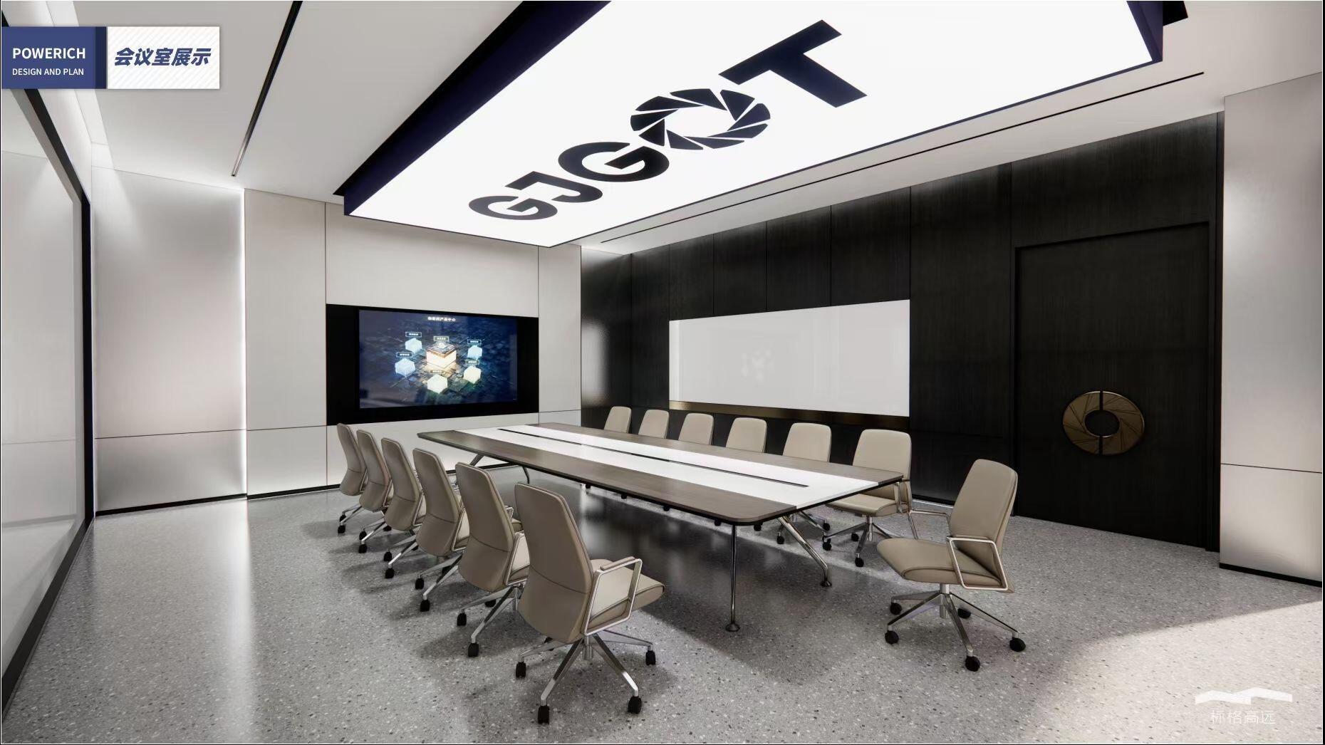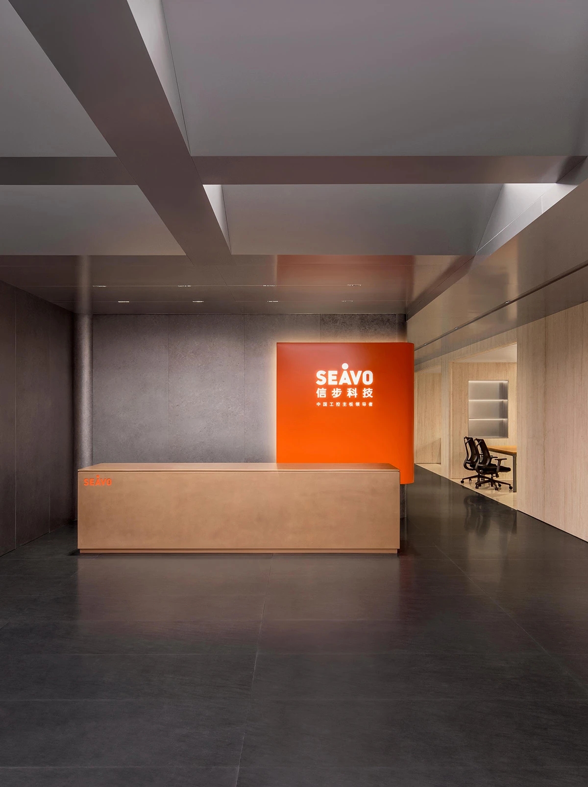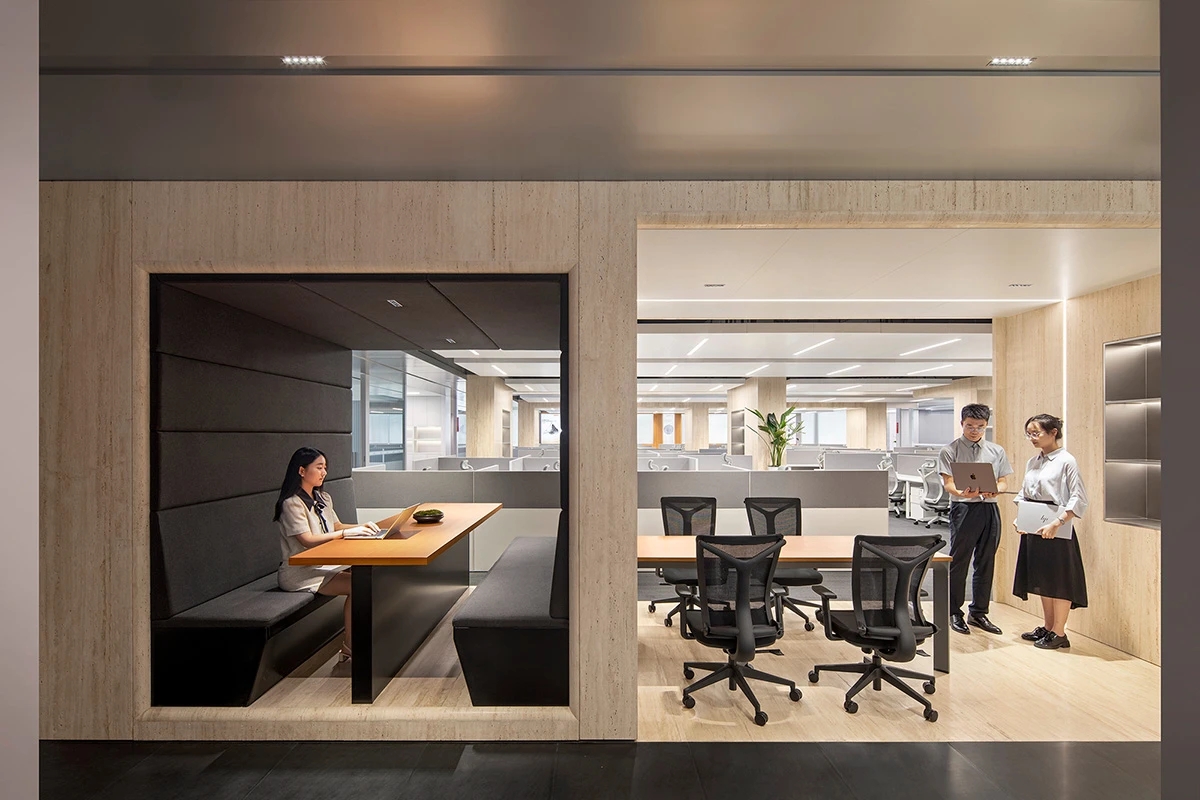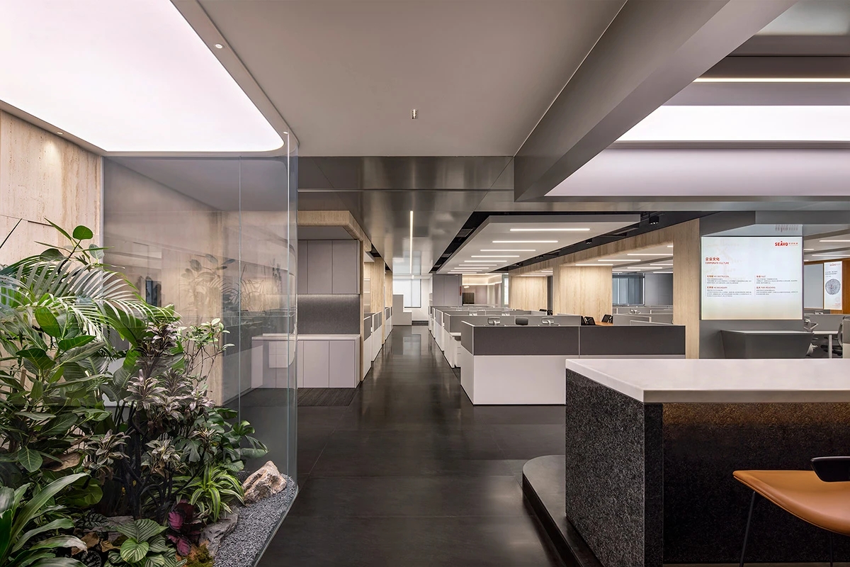 办公空间借鉴包豪斯的设计理念,以“形式追随功能”为核心,结合科技感的元素,营造出简洁、高效且富有未来感的氛围。设计师通过挑高吊顶、软膜顶灯和橙色背景墙的巧妙搭配,创造出视觉上的延伸感与层次感,使空间既开放又富有张力。大尺度走廊与橡木转角隔断构筑半围合空间,在赋予工位独立性的同时,借由全透明会议室与开放办公区的错落分布,形成‘对景’视觉轴线——从人资部穿透ABW区域延伸至商务、产品部门,设计师通过建筑布局和空间规划塑造出南北贯通的空气流动通道,即南北“风道”,利用自然风力实现温度调节和空气循环,构建人与空间共生的动态图景。临窗区域通过开放式工位与玻璃房间的进退组合,营造出虚实相生的光影层次,将中国传统建筑美学的光影智慧转译为现代语言。主会议室以未来主义美学为基调,顶部连续软膜光源与舰艇造型铝制吊顶构建动态光影界面,其形态逻辑与下方橡木会议桌形成拓扑学对话,隐喻“刚柔辩证”的空间叙事。智能光控系统将功能性照明升维为空间交互界面,满足高效会议、能耗管控与人性化体验的多重需求。墙面高性能聚酯纤维吸声模块,在保障会议私密性的同时,通过材质肌理的温度差,消解了工业美学的视觉压迫。