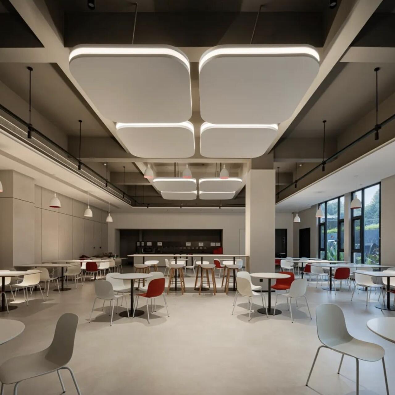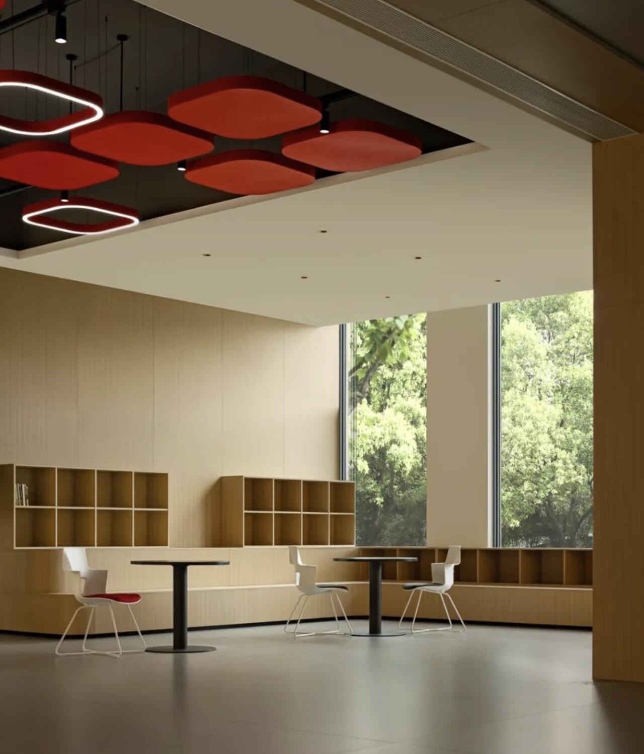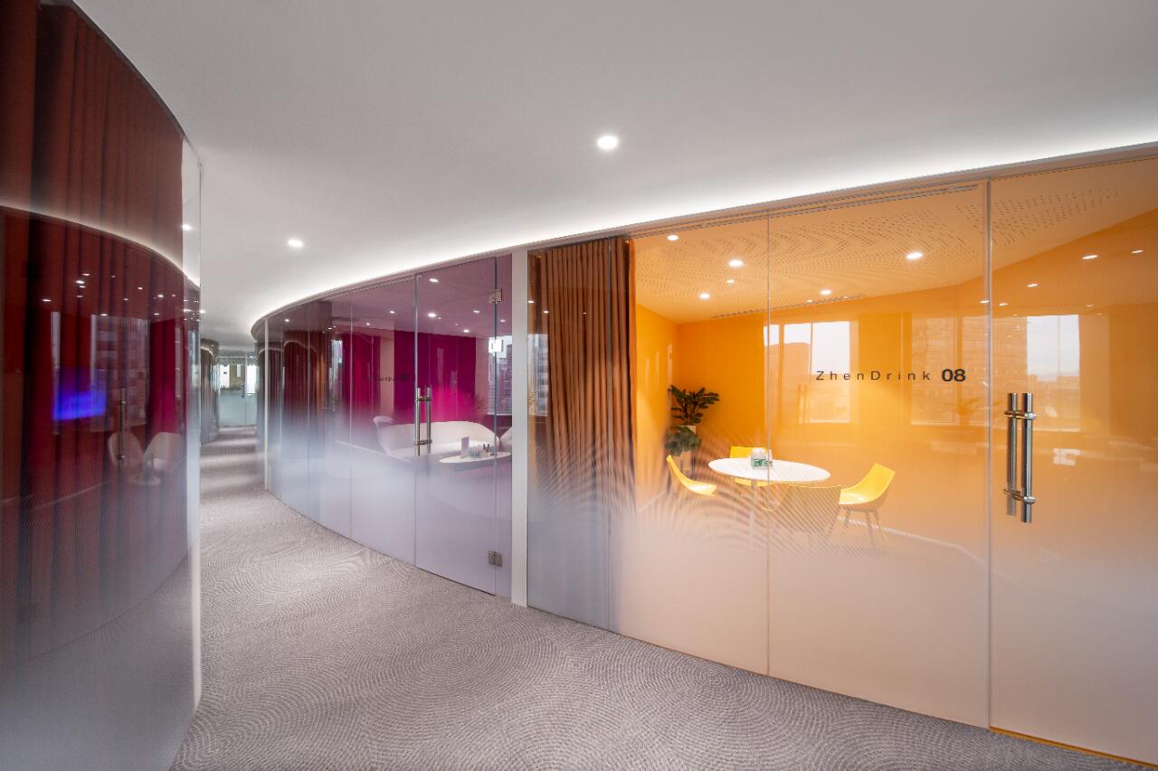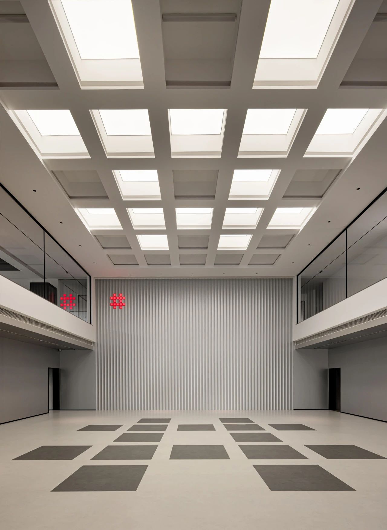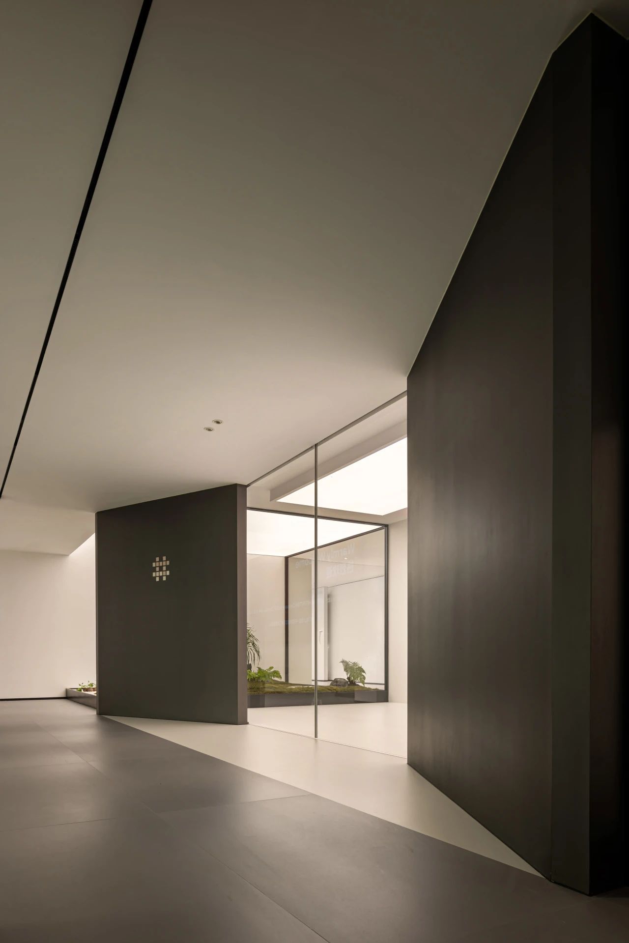 3-4楼则被定义为企业的研发和管理办公空间。3楼的空间环绕一个精致的瓦砖小花园展开,蜿蜒的连廊实现了室内与室外空间的最大化连通,为员工提供了一个绿意盎然的休息和思考空间,使自然之美与办公空间相融合。