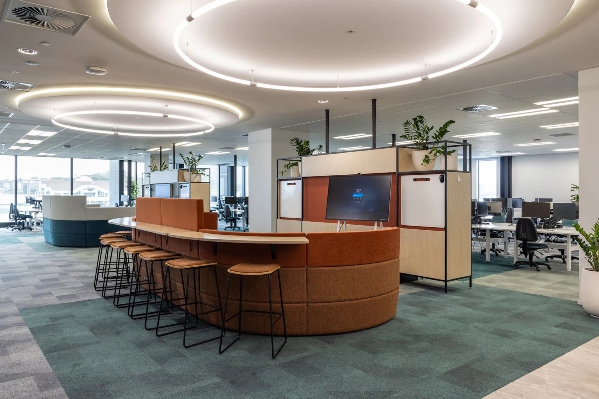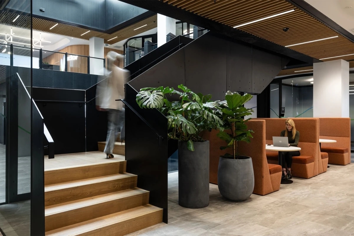 从设计的初期阶段起,Vector就将可持续性作为空间布局和功能的核心原则。整个办公环境采用绿色网格系统,促进了建筑内部的能源效率和资源利用的最大化。这种绿色网格系统不仅有助于降低能耗,还通过高效的空间布局提升了工作场所的整体效率。宽敞的办公区域支持灵活的工作方式,包括灵活工作站和可预订的办公桌。这种空间设计鼓励了团队协作与创新,并通过不同类型的工作站为员工提供了个性化的选择,满足他们在不同工作情境下的需求。办公空间的咖啡馆和阳台设计同样体现了对员工福祉的高度关注。宽敞的咖啡馆提供了一个让员工可以休息、放松并与同事交流的环境。而阳台的可操作屋顶更是加强了与周围自然景观的连接,让员工能够在舒适的空间中享受奥克兰的美丽景色。