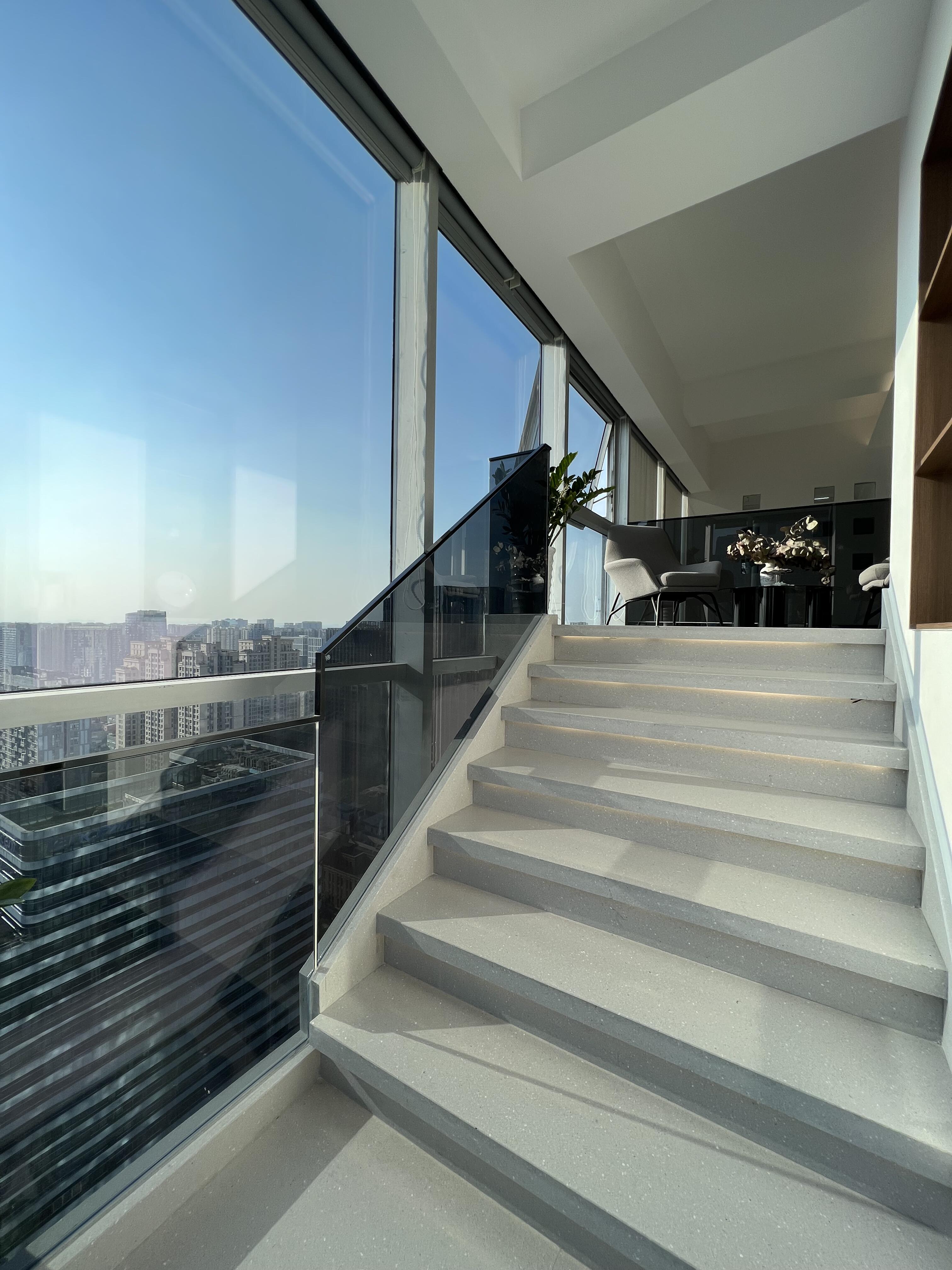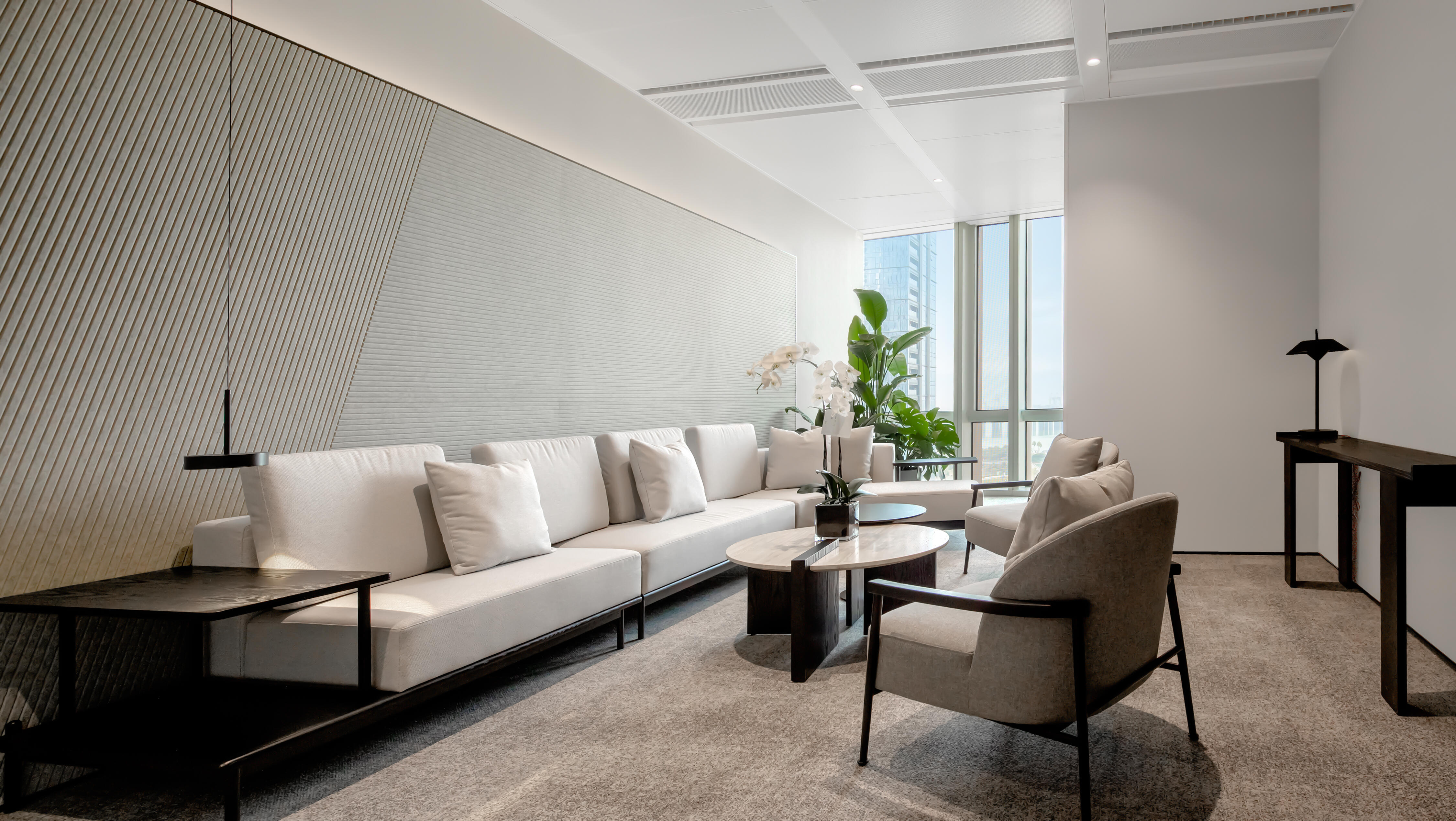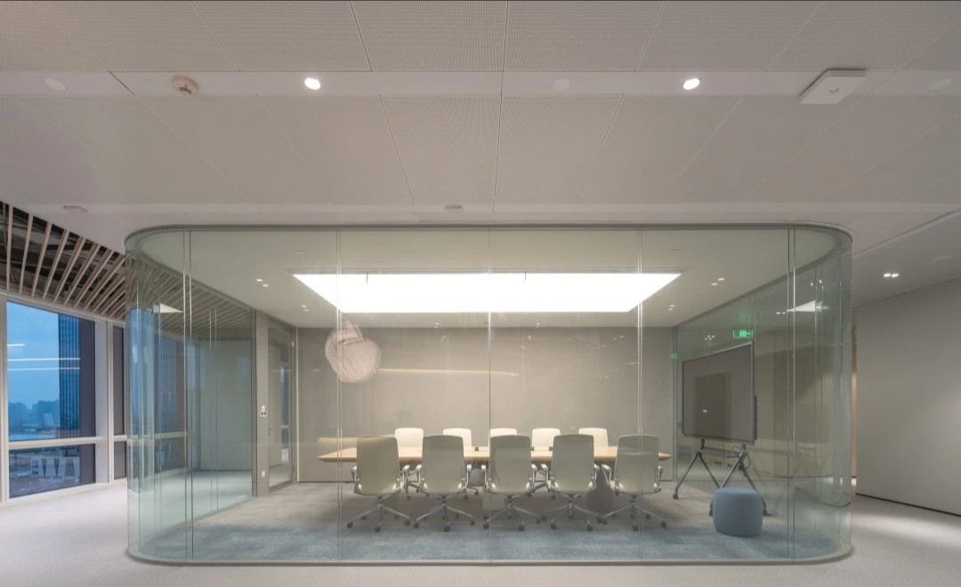 走进前厅大堂,首先映入我们眼帘的就是我们的独特玻璃房子,渐变的地毯如海水一般,映射在玻璃墙,搭配浅色会议家具,犹如在海水中轻盈,自在。