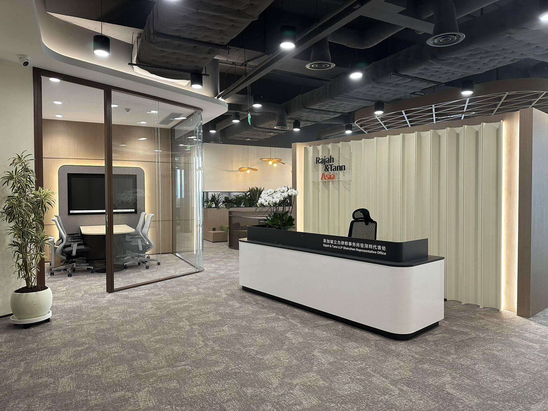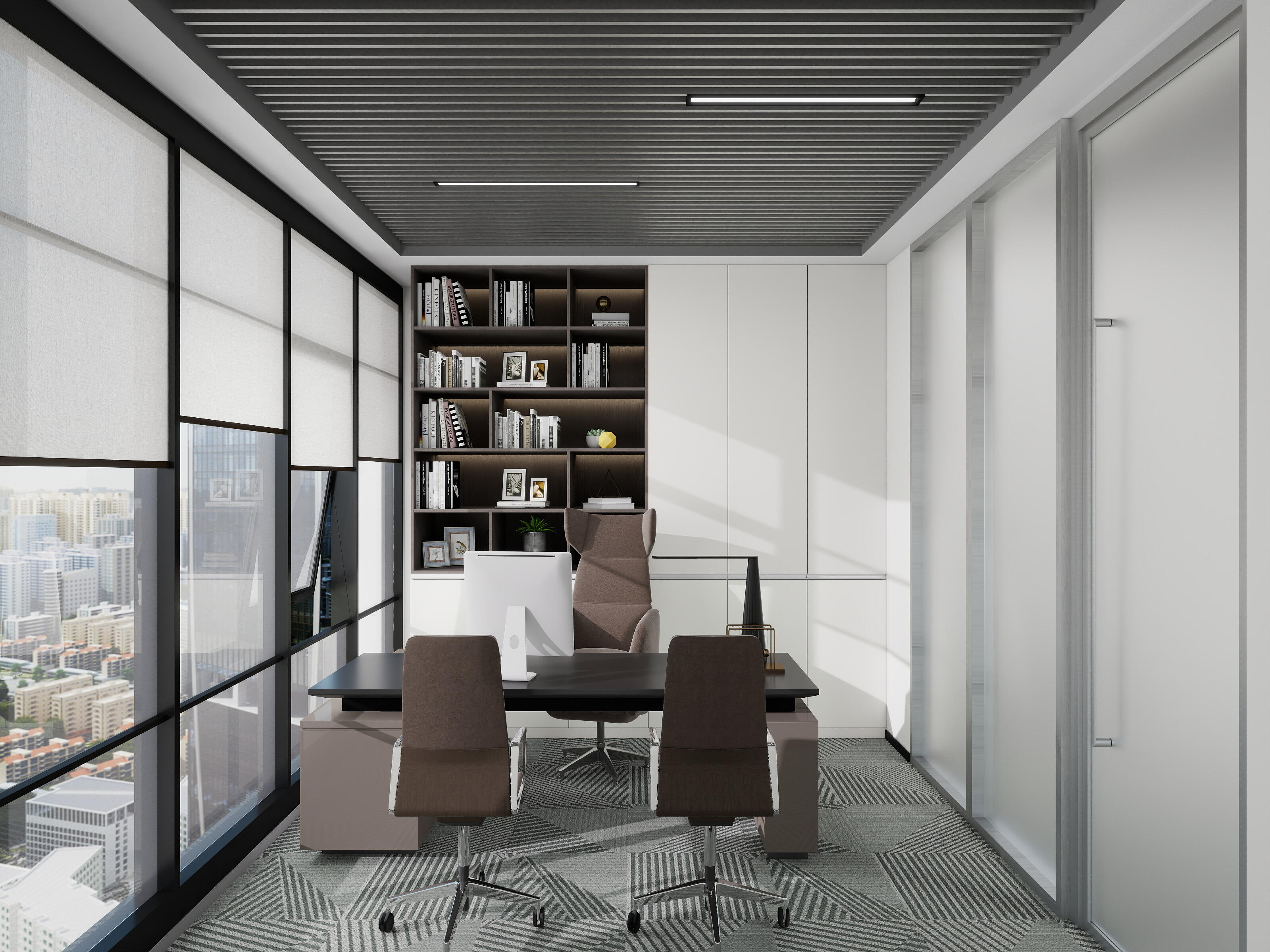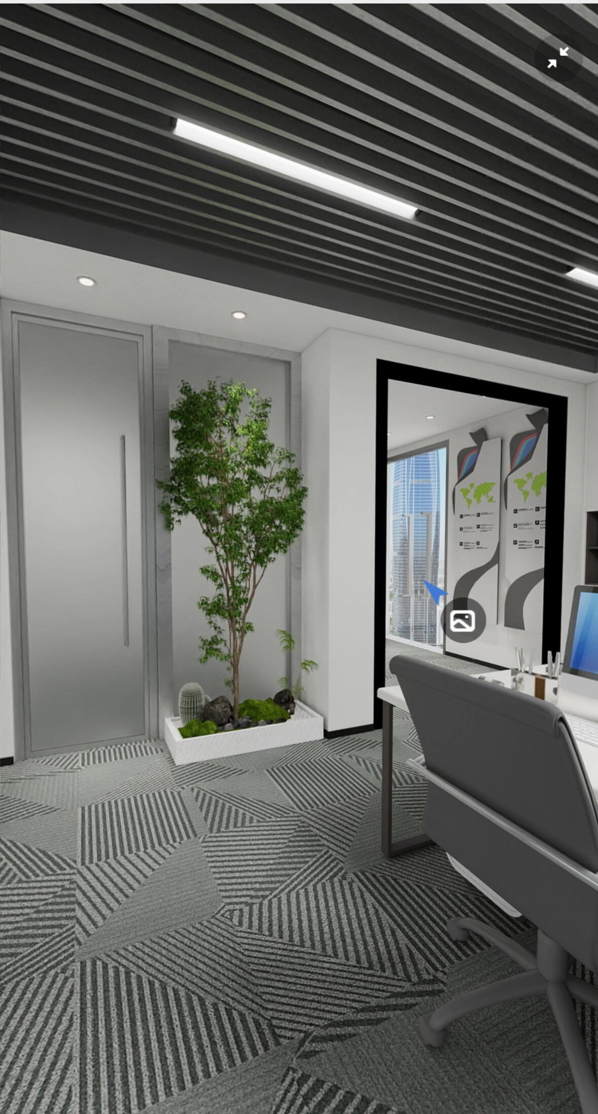 接待室的整体布局采用对称设计,给人一种平衡和稳定的感觉。宽敞的空间和简洁的线条使整个环境显得大气而不失温馨。设计中主要使用了中性色调,如白色、灰色和米色,搭配木质元素,营造一种宁静而高雅的氛围。局部点缀的绿色植物和装饰画,为空间增添了一丝生机和艺术感。