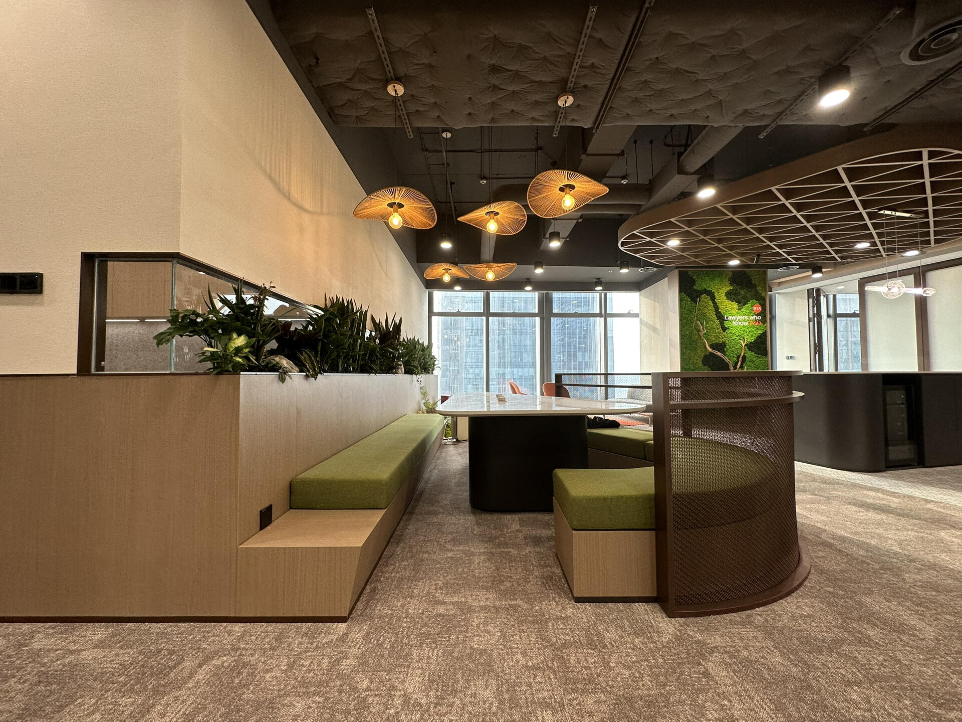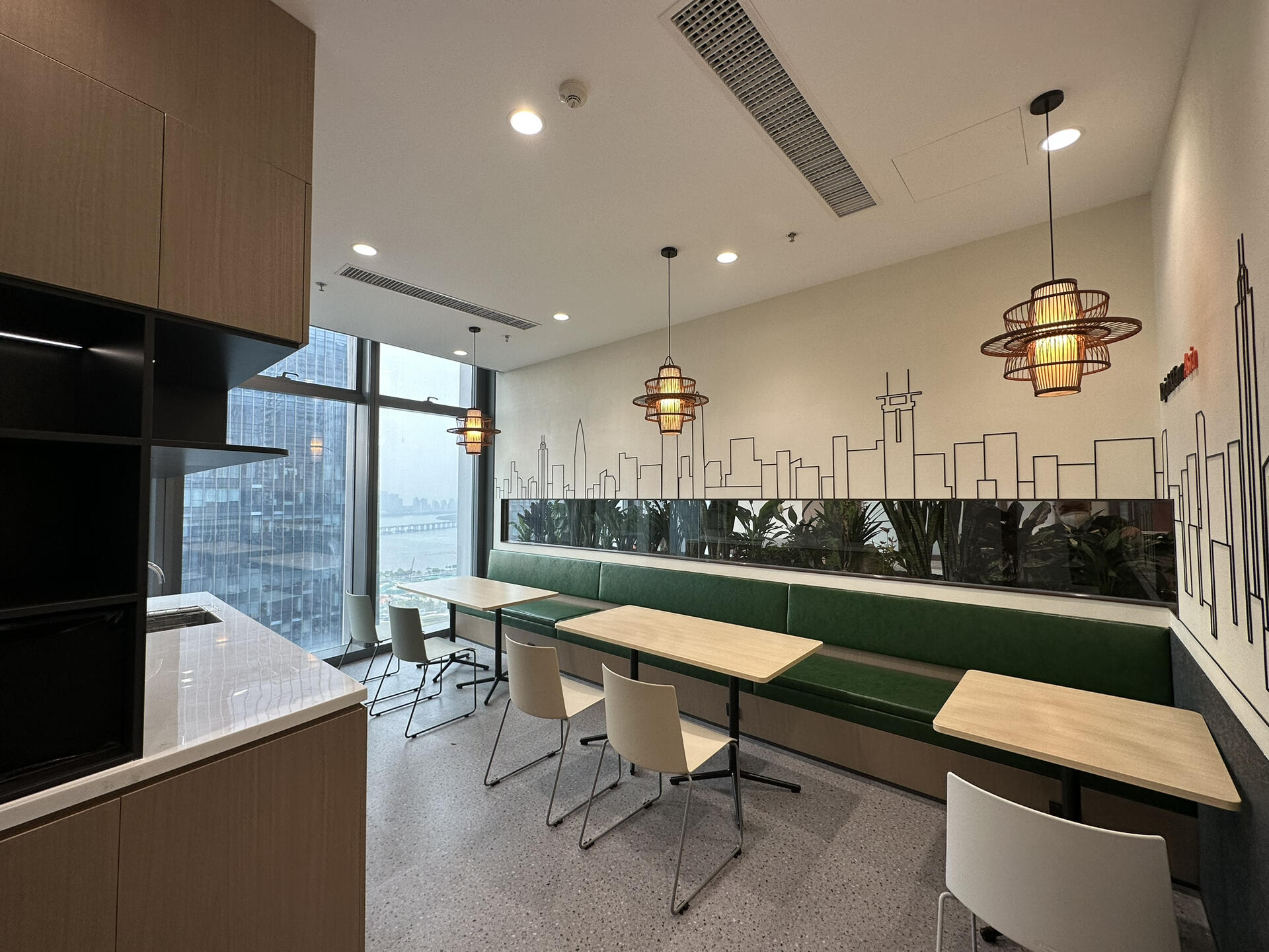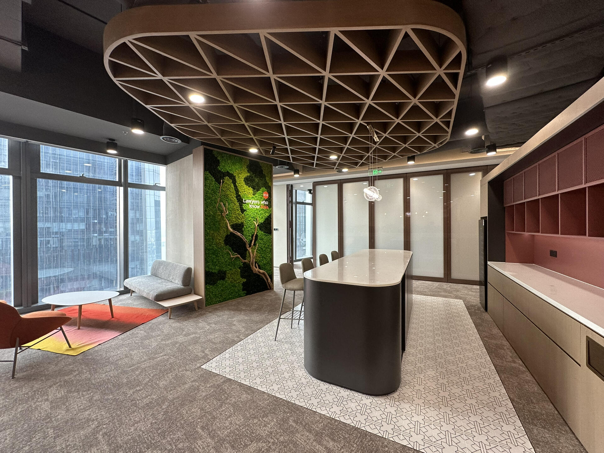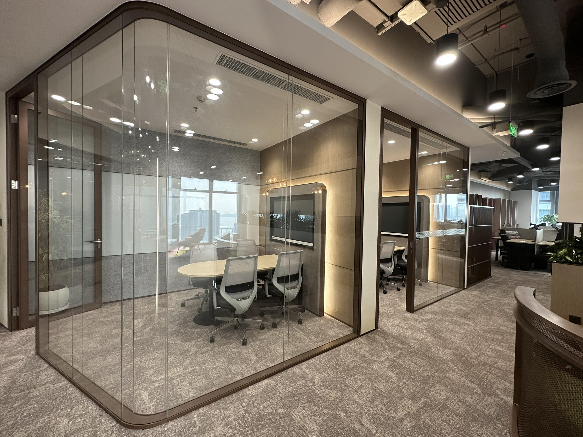 极简的办公室空间,用奶油白色系为基调,赋予空间明亮和舒适。通透的大面积玻璃,把“光”植入在视野当中,增添了空间的开阔性和张力。自然光的导入,使室内与室外“无界”的空间概念。