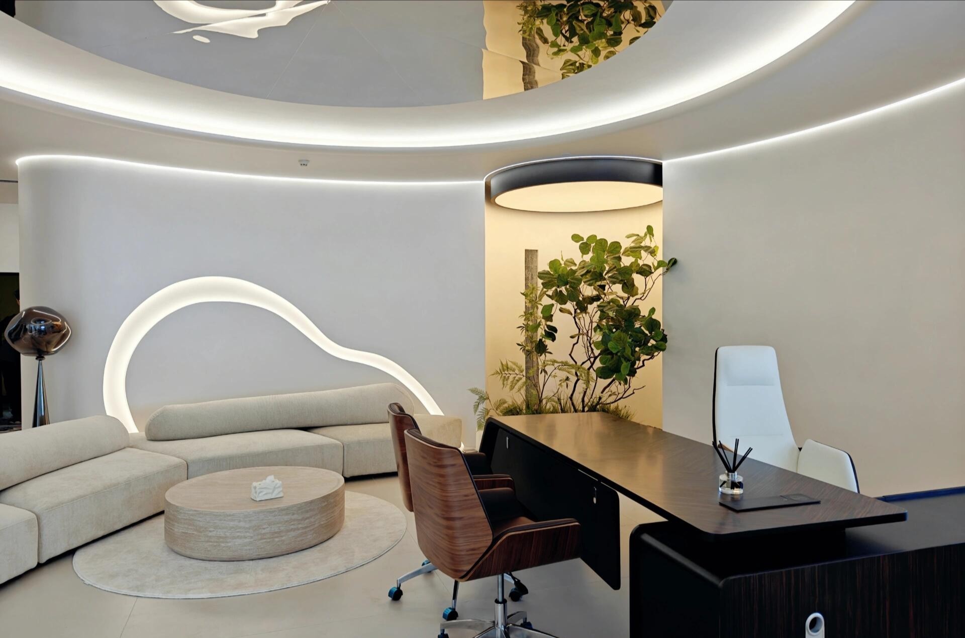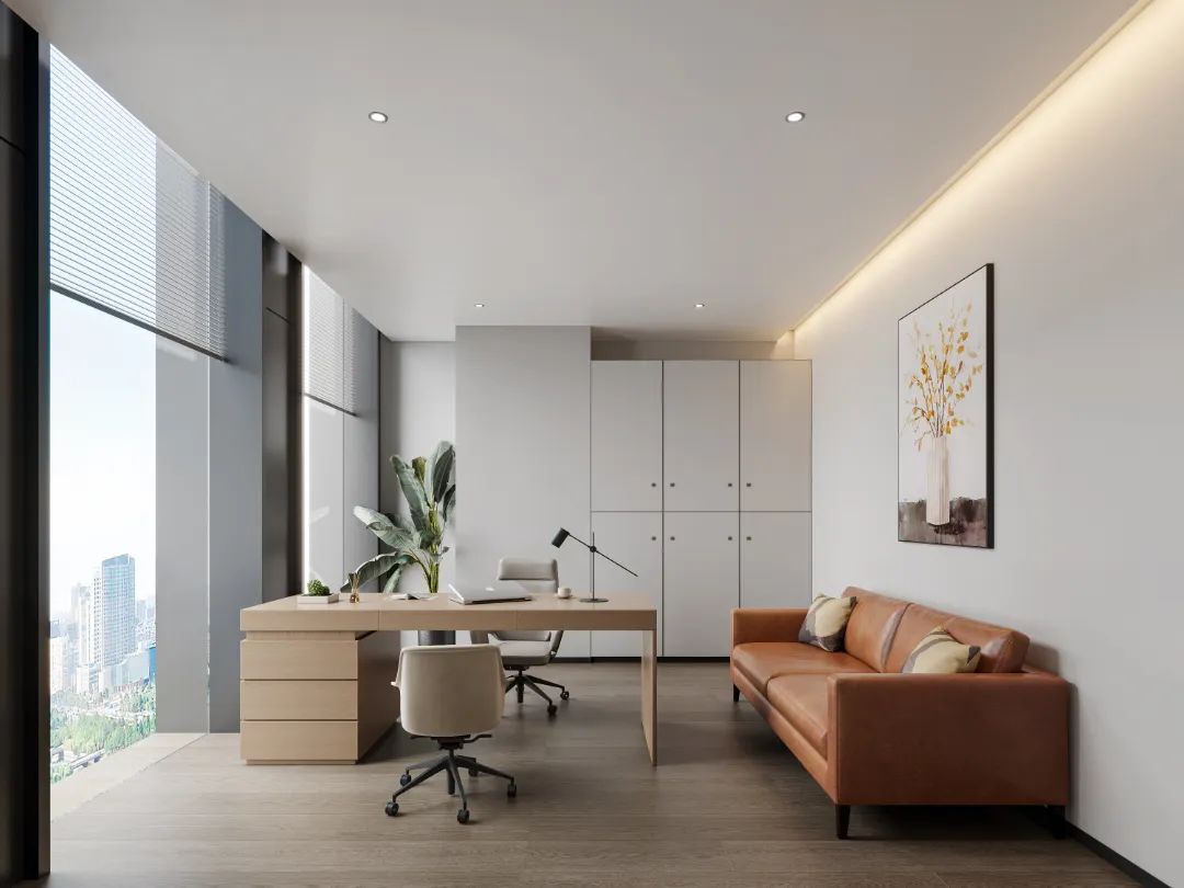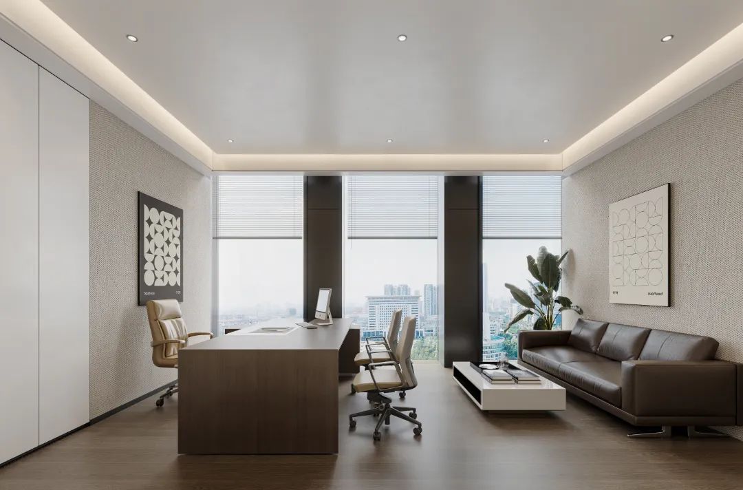 董事长办公室空间以中性色调为主,纯净的白、沉稳的棕,再搭配上一抹明亮的绿色作为点缀,既显得宁静雅致,又不失活力与朝气。沉稳的色调和简洁的布局相得益彰,营造出一种庄重而不失现代感的氛围。