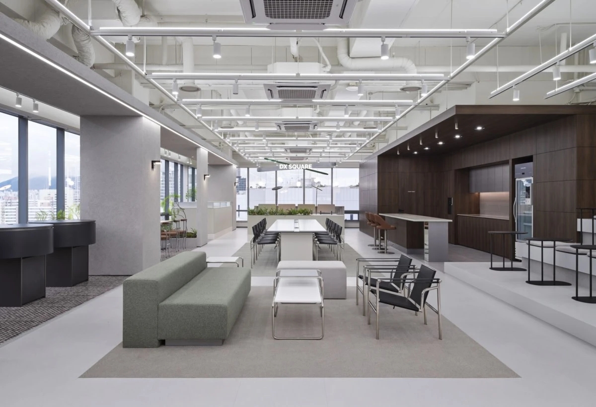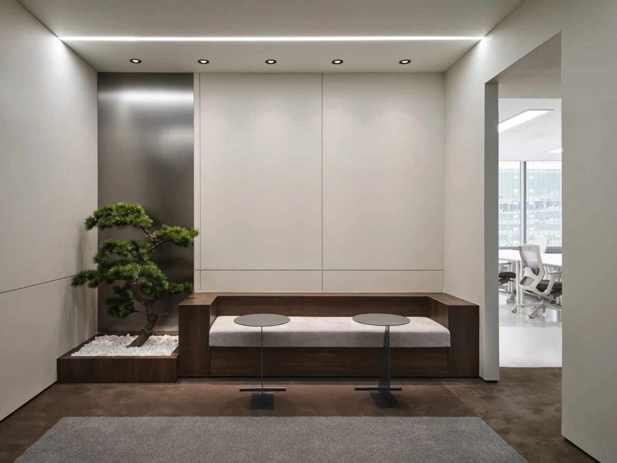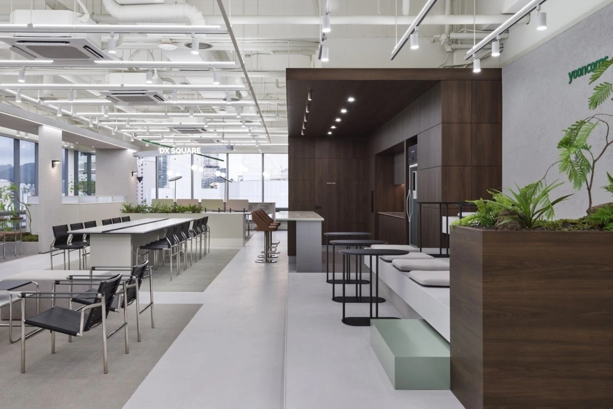 在当今快速发展的IT行业中,企业的办公空间设计已不再仅仅是提供工作场所,它也承载着公司的文化、愿景和价值观。作为国内领先的DX(数字化转型)公司,YOONCOMS深知空间不仅是员工日常工作的场所,更是企业理念和创新精神的物理体现。在为YOONCOMS设计办公空间时,设计团队以“新传统”作为指导思想,巧妙地融合了传统与未来这两个看似截然不同的概念,创造出一个既展现公司历史成就,又面向未来科技的多功能工作环境。在空间设计中,对比的元素是这一项目的核心。设计团队通过精心挑选的材料和色彩组合,塑造出一种视觉上的深度与张力。木材的温暖感与冷硬的钢材、光滑金属与粗糙石材纹理的对比,赋予了空间一种独特的动感与层次感。浅色与深色木材的搭配,不仅为空间增添了视觉上的丰富性,还营造出一种温暖、舒适的氛围。微妙的灰调和融入绿色暗示——YOONCOMS的品牌色彩——应用于墙壁和天花板,使品牌标识在空间中柔和地回响,同时为空间注入了一种精致与现代感。YOONCOMS的工作空间布局不仅注重美学,还对空间的功能进行了精心规划和优化。设计师将办公区域划分为多个独立的功能区,包括DX广场、会议室、研讨室和办公区,以确保每个区域的使用效率与隐私保护。特别是在研讨室的设计上,考虑到噪音控制,专门设置了外部入口,并采取了隔音和吸声措施,以防止会议室的声音影响到其他区域。为了进一步增强隐私和安静感,研讨室还配有前厅以及90度走廊设计,使空间更具独立性和私密性。