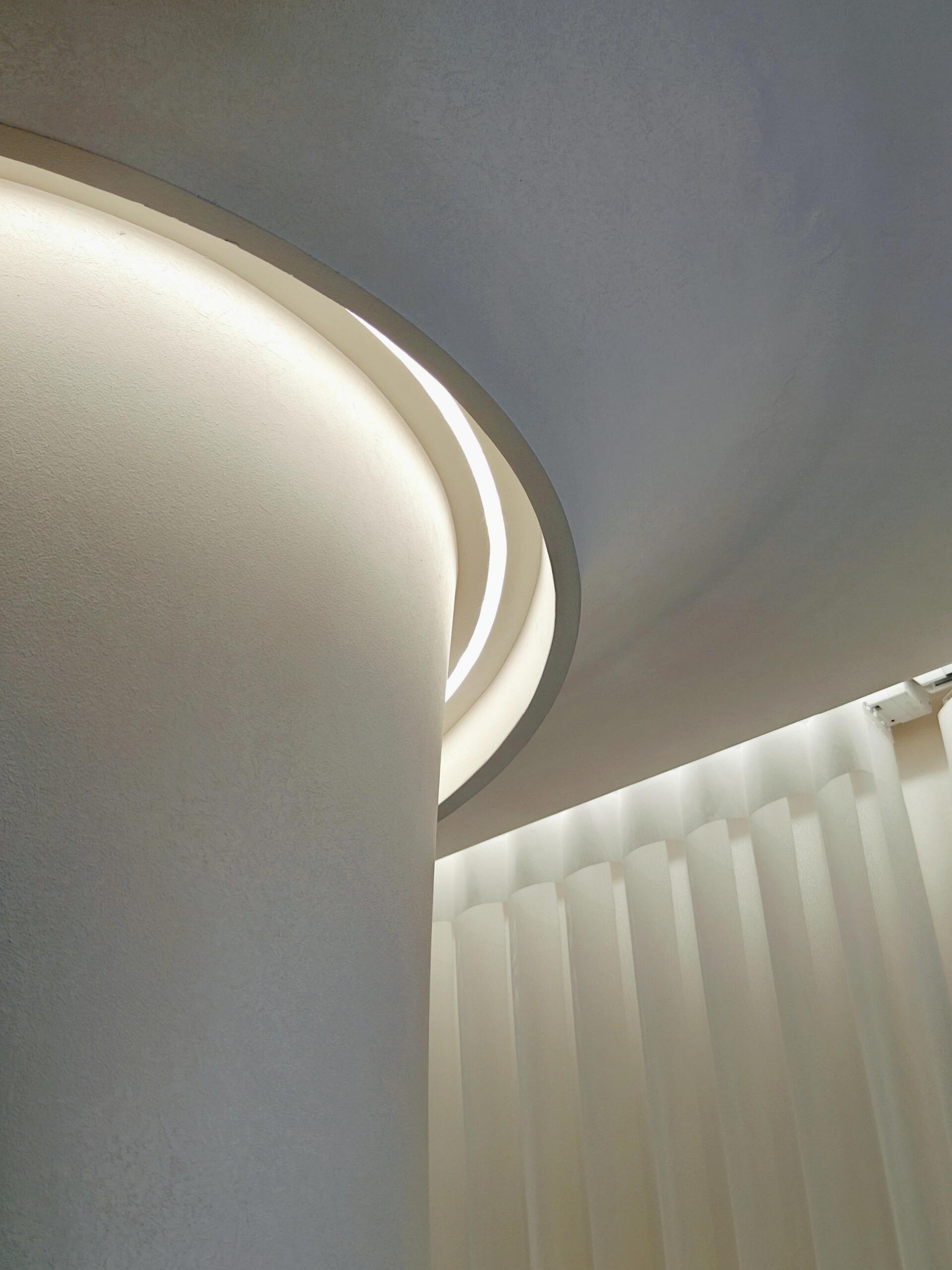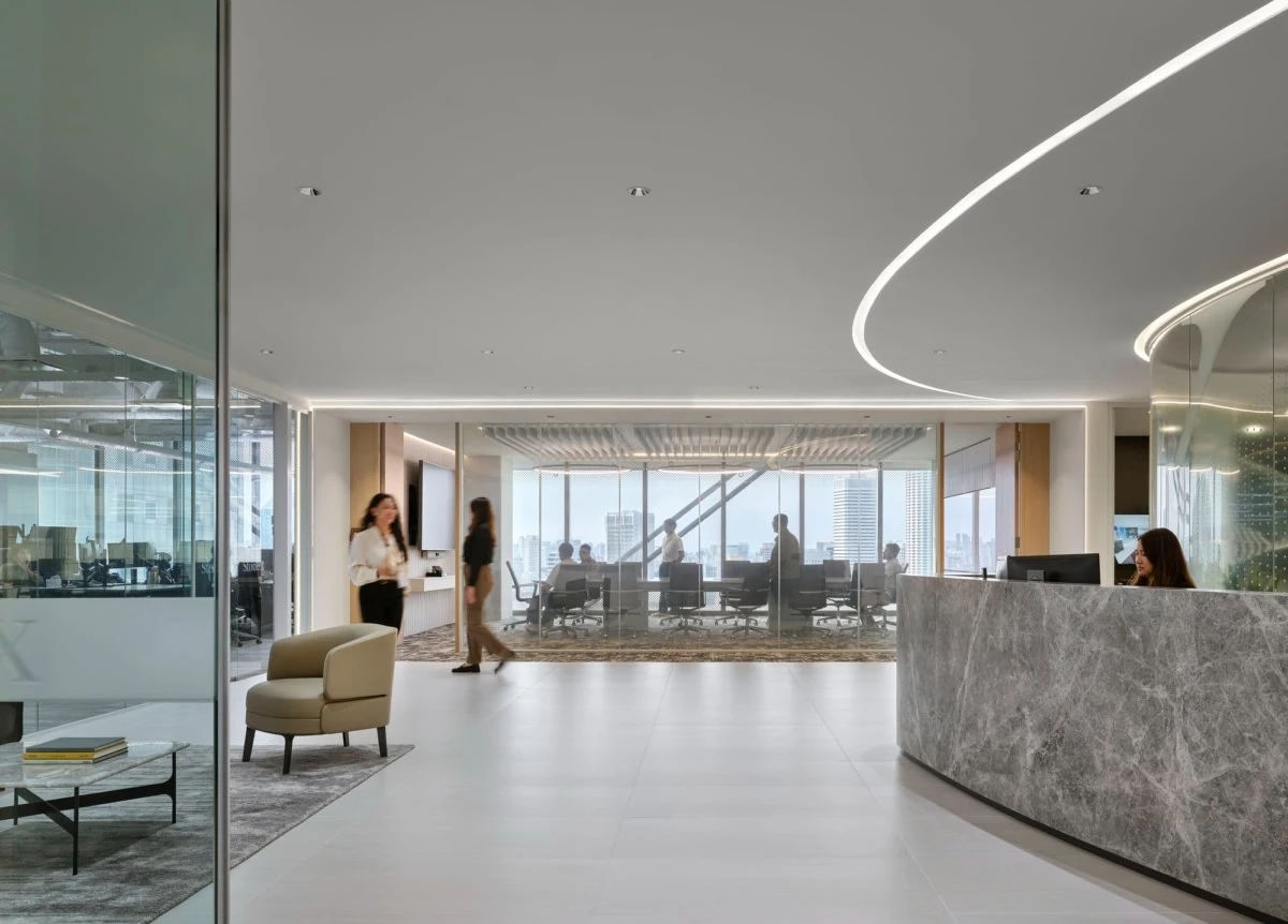 为了进一步软化空间的最小化美学,并增添空间的温暖感和舒适感,设计团队引入了弯曲的几何形状和丰富的材料纹理。这些元素不仅令整个空间更具亲和力,也为员工创造了一个既有活力又能舒适工作的环境。这些细节的设计让空间不再冰冷、单调,而是充满了现代感和人文关怀,激发员工的自豪感和归属感。在整个办公室布局中,重点放在了前台和后台区域的合理分割,确保了员工和客户的不同需求得到平衡。开放式的空间布局不仅促进了员工之间的合作,也让员工能够轻松地感受到办公室的集体氛围和企业文化。
