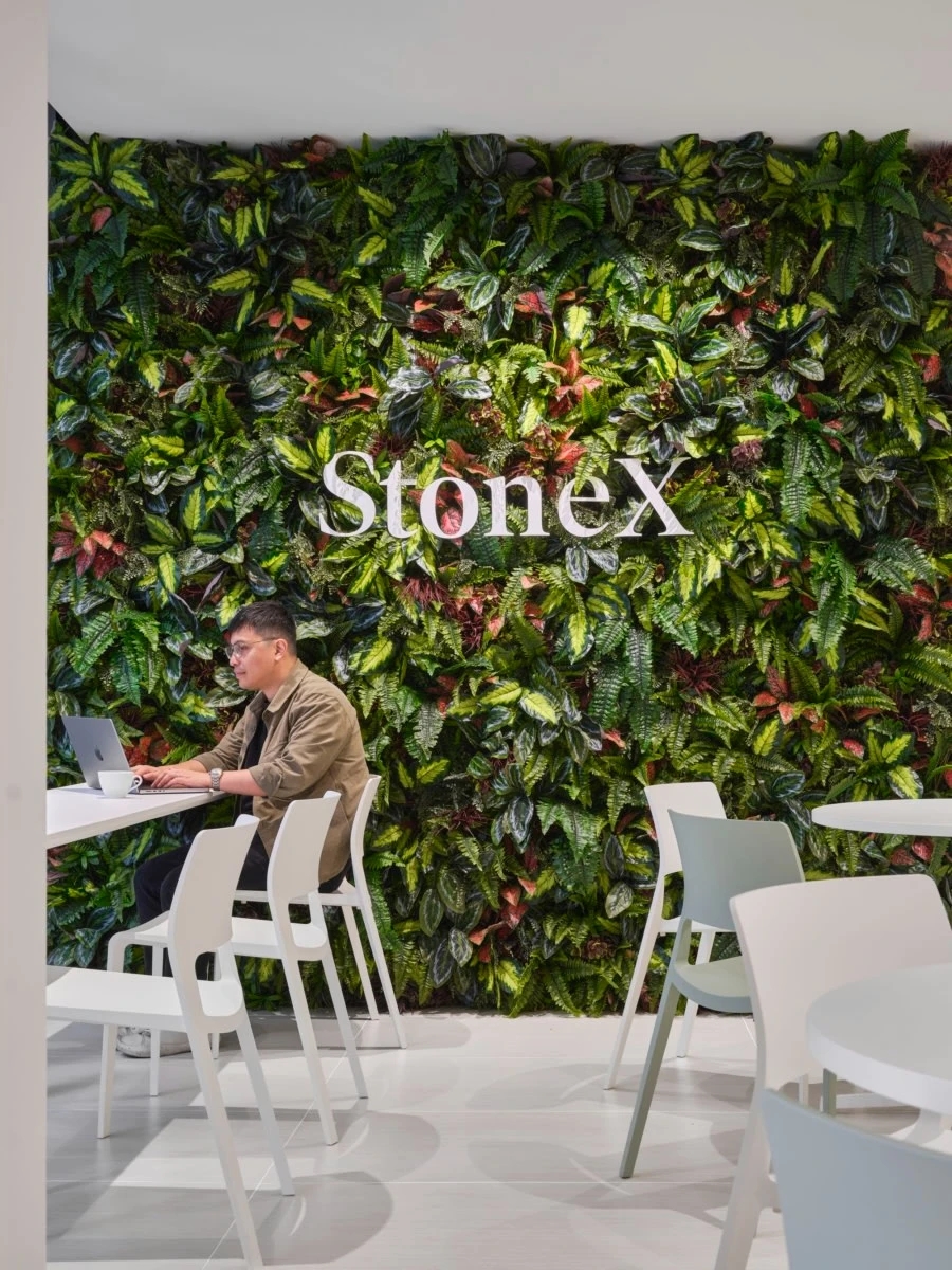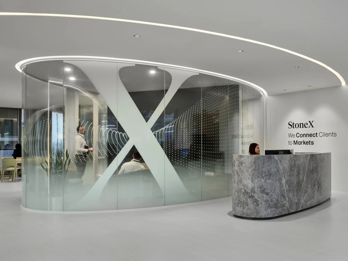 StoneX的办公室设计核心理念之一就是透明度,这一价值贯穿在整个空间布局中。如何在保持开放透明的同时,有效划分面向客户和员工的区域?设计团队通过巧妙运用玻璃作为分隔物,使空间保持视觉上的通透感,同时又能确保不同区域之间的功能性划分。玻璃的使用不仅突出了StoneX的透明文化,还能够强化客户和员工之间的视觉联系,增进彼此之间的互动。为了平衡开放性与隐私性,办公室设计采用了不同的天花板和墙体材质。后屋采用开放式天花板,提升空间的通透感和整体感。而前台区域则配备了隔音天花板和墙壁,以防止声音泄漏,确保客户区域的安静与舒适。这种设计既能够应对现代办公空间的声学需求,又不会妥协空间的开放性和流动性。