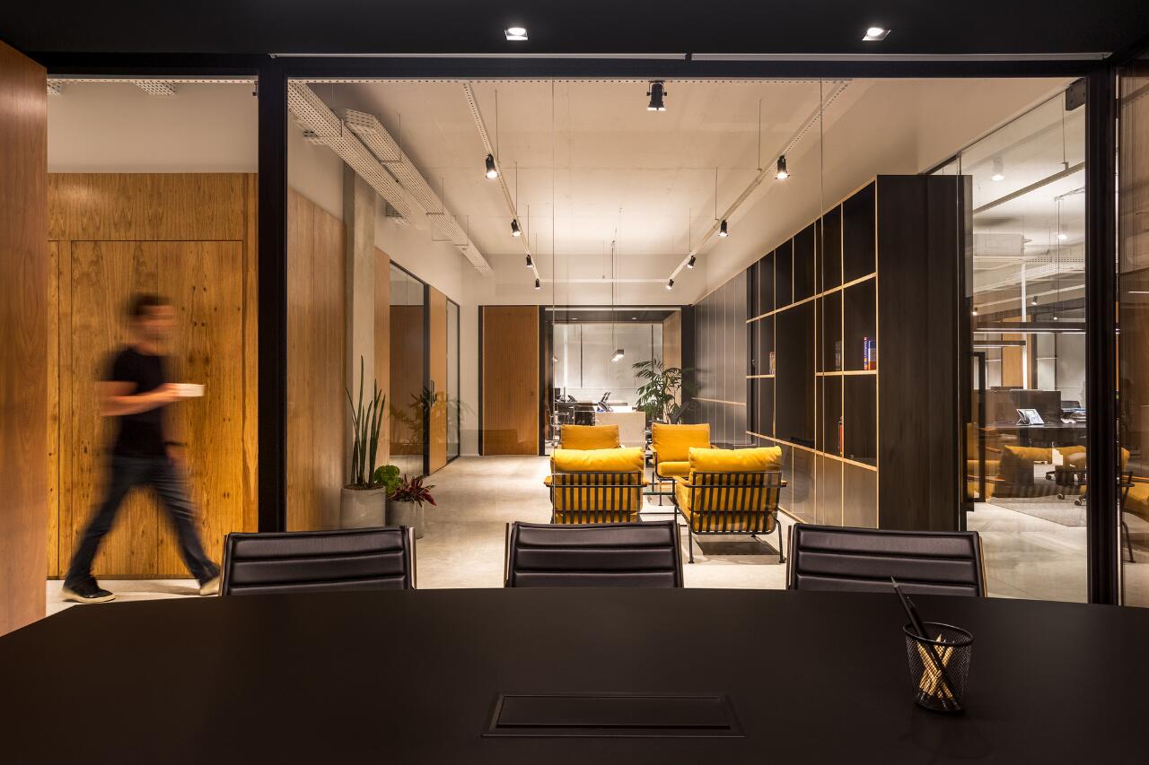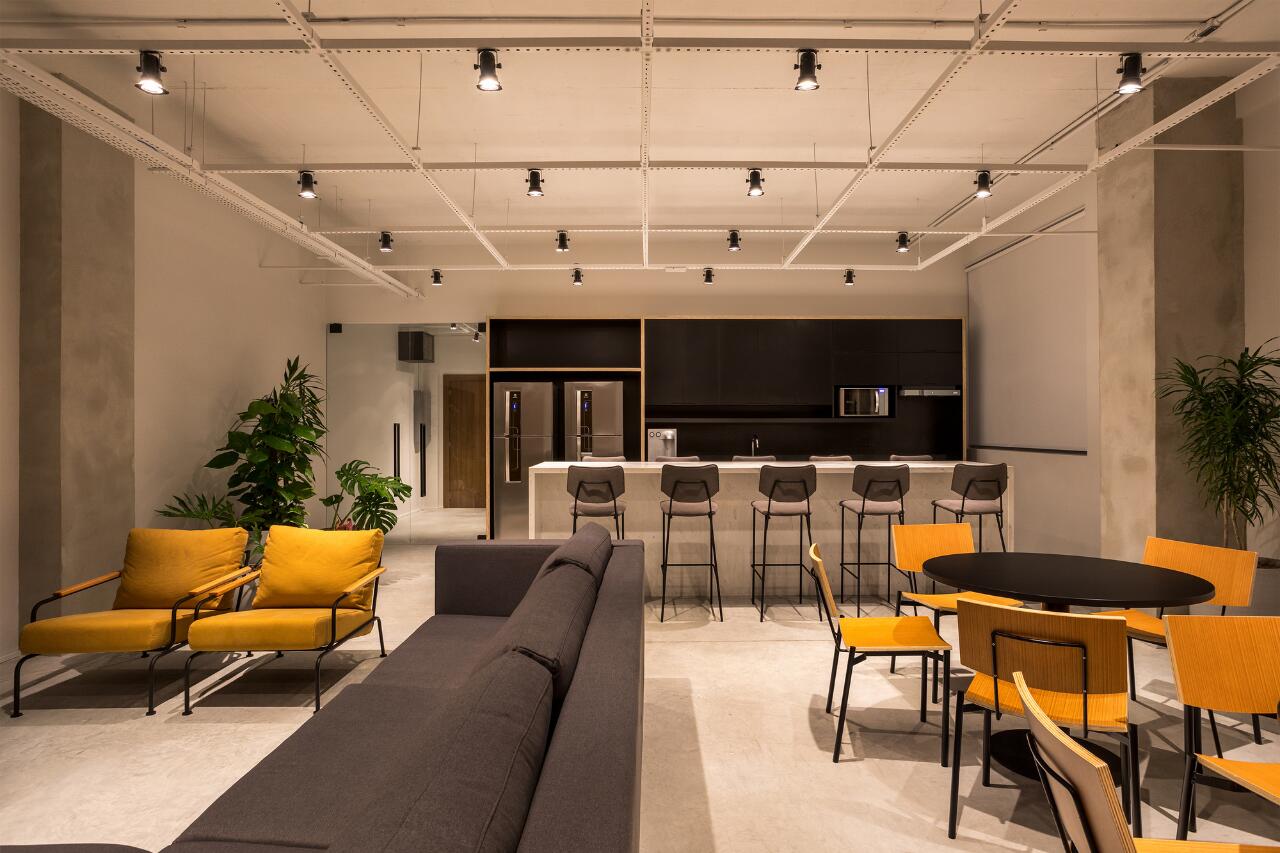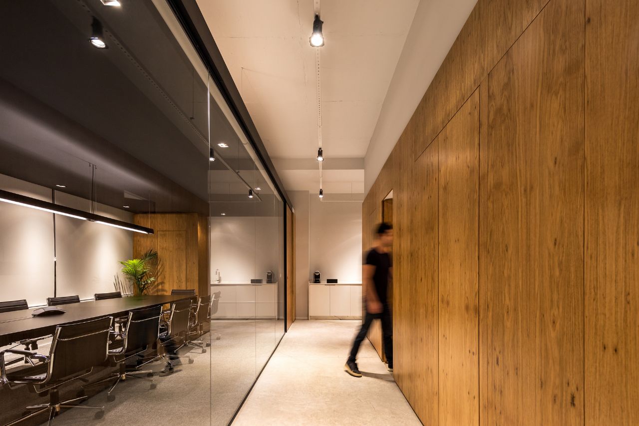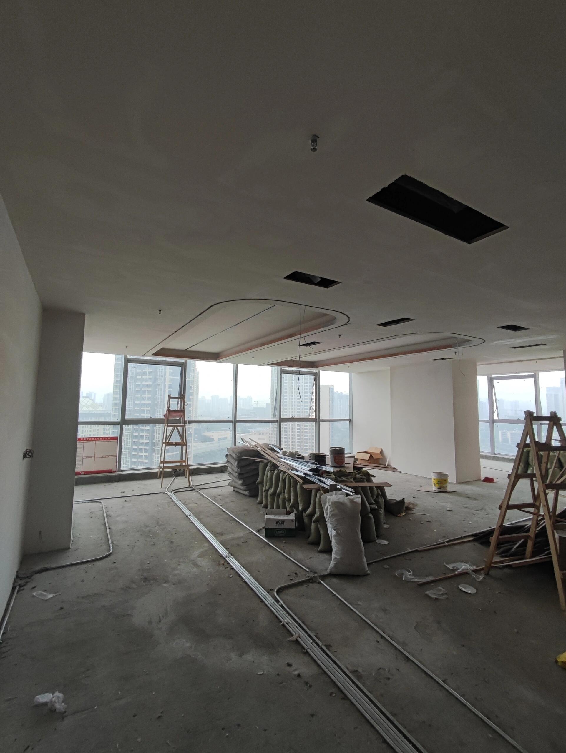 保留之前的平顶,找平后做微水泥与墙面同色,让空间显大,微水泥的斑驳纹理更有质感。 地面做微水泥与墙面同色,颜色可以比墙面略深,这样更有层次感。 公司形象墙用石膏板直线造型,定制铁艺发光字,记得预留灯线。 恰谈区用石膏板做隔墙,用造型做透景,引入光线。