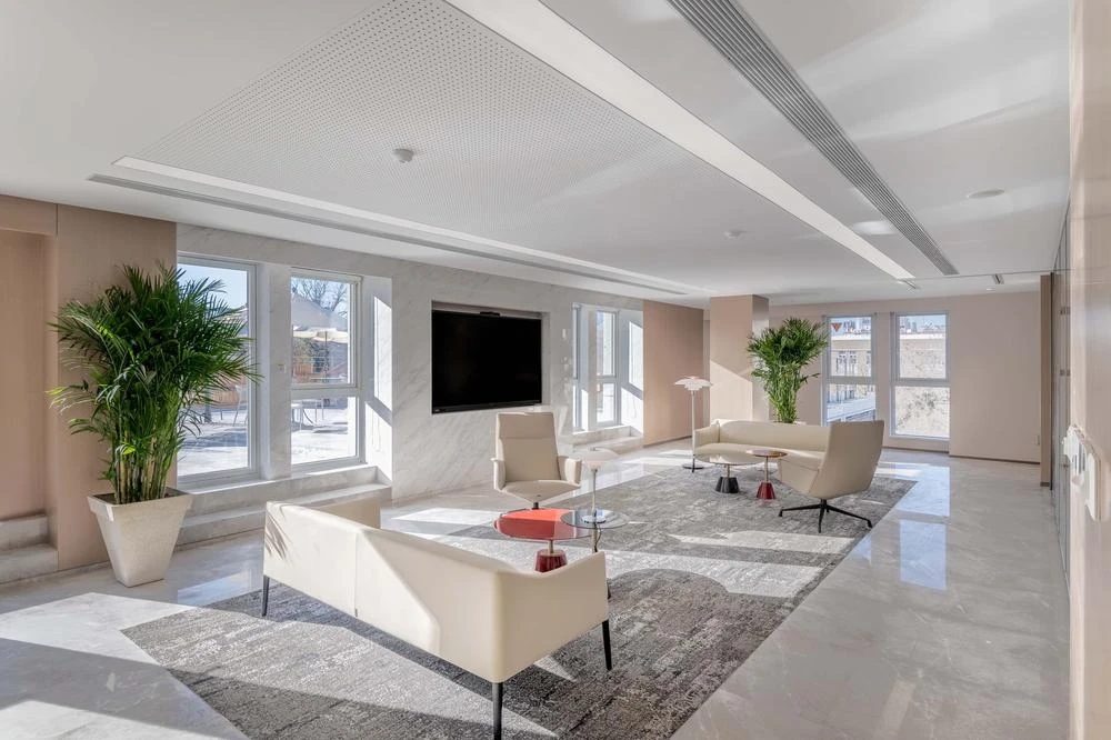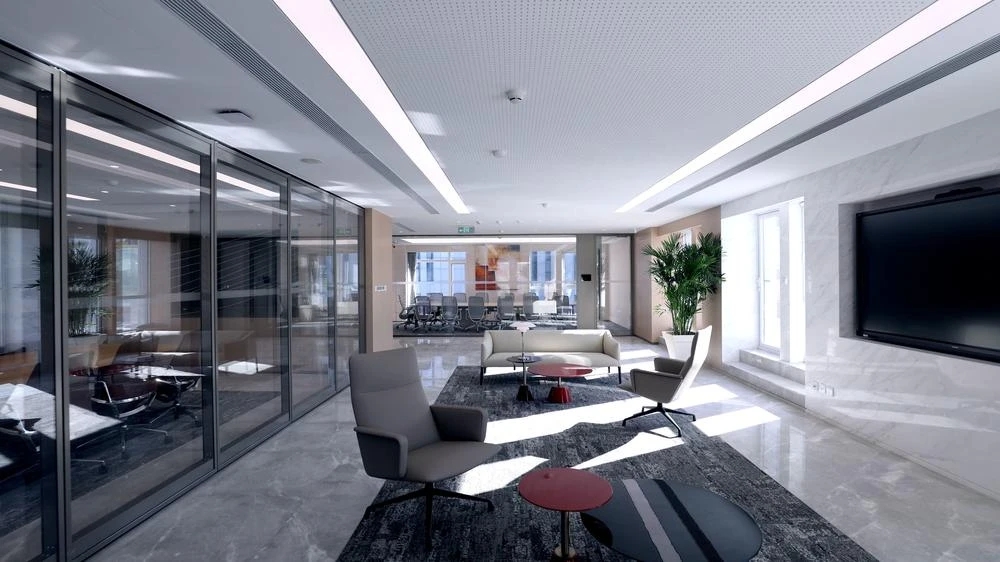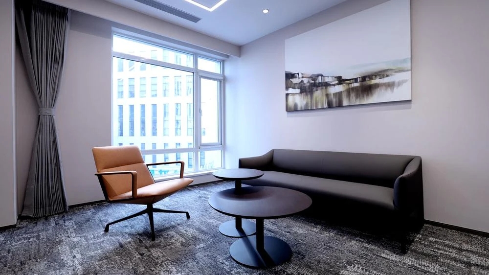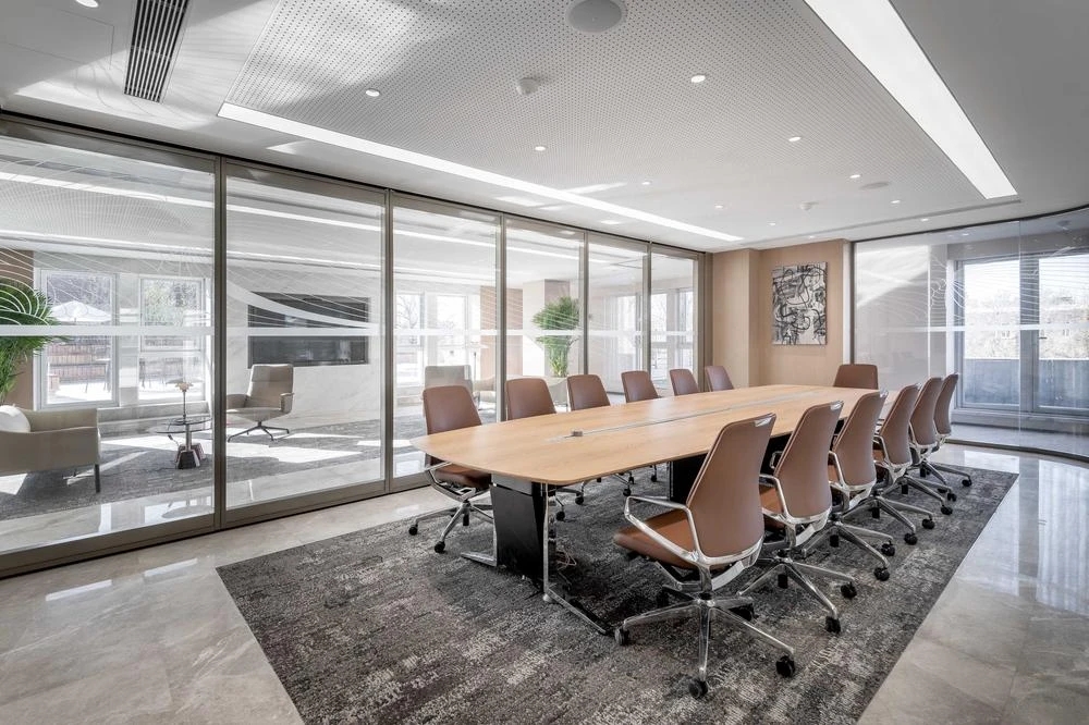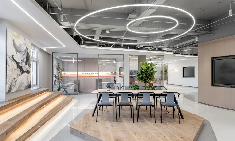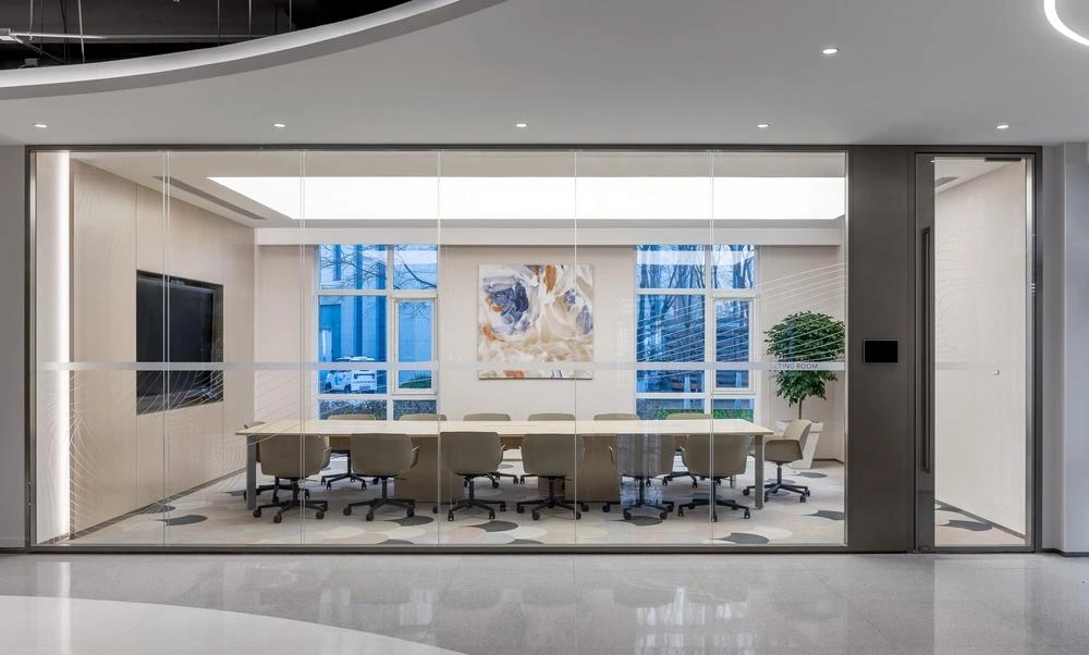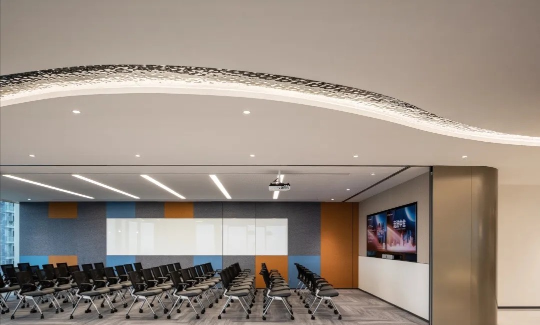 会议室更需一个综合多种灯光效果的照明系统来营造清透明澈的空间氛围,浅咖作为主要用色与营业厅内外呼应,更体现出企业干净舒适的议会环境。