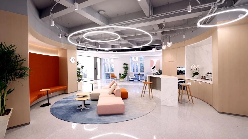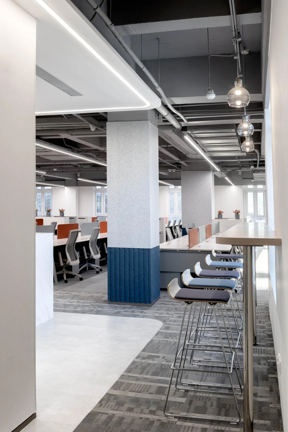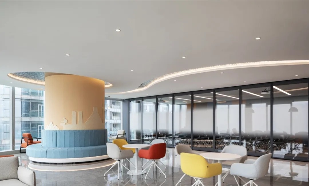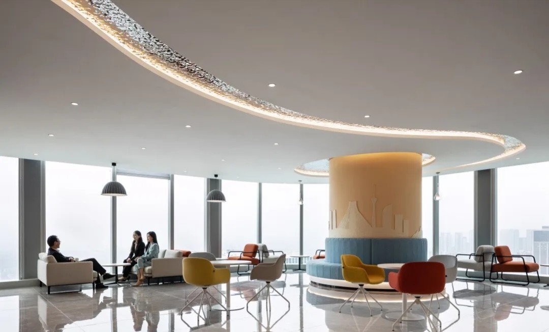 以“天空之城”为灵感,将流水的形态以灯光的形式赋予了办公空间灵动性和故事性。整个设计,结合企业倡导ABW空间策略,打造标杆智慧网点的理念,在满足现有办公需求的同时,引入并结合城市文化,以及艺术作品的融合,打造出符合企业精神独一无二的办公空间,使企业人始终富有充沛的高效和激情。在设计中,融入成都“雾都”的城市自然特点,作为贯穿空间的主题元素。