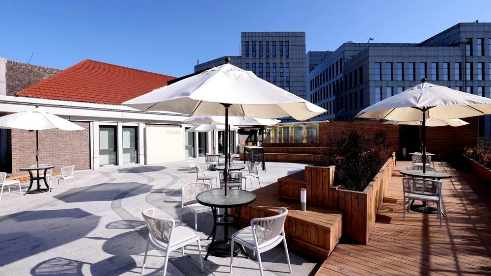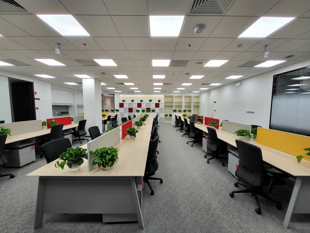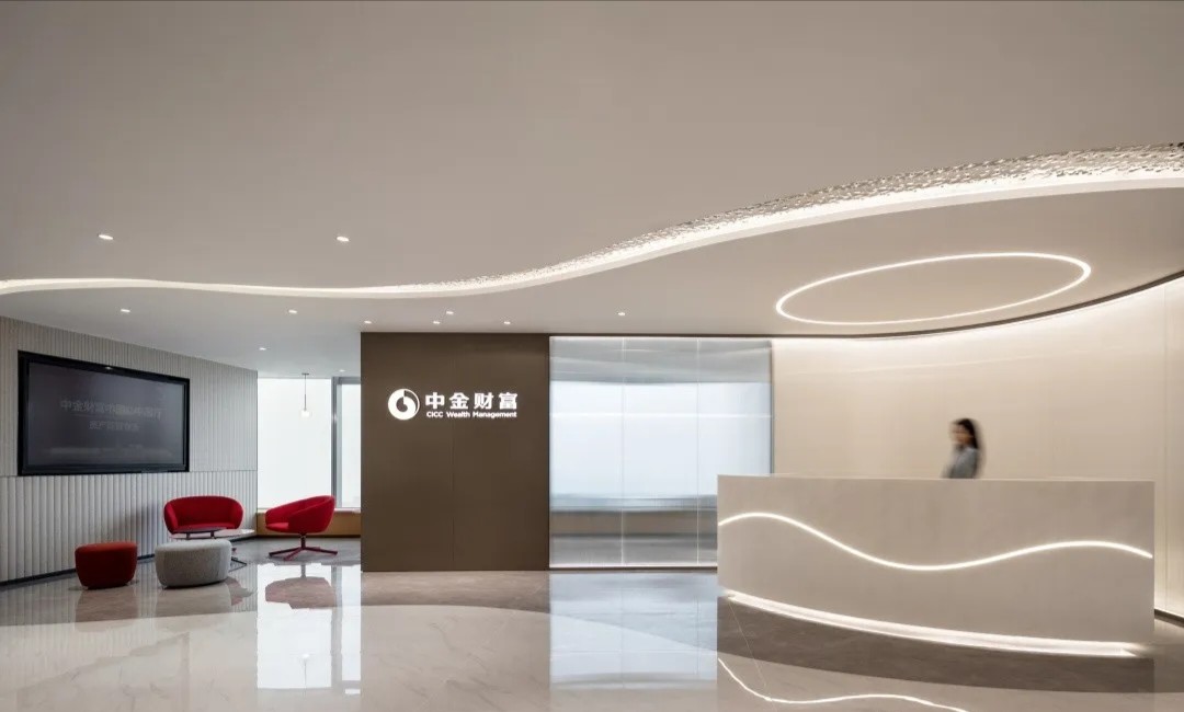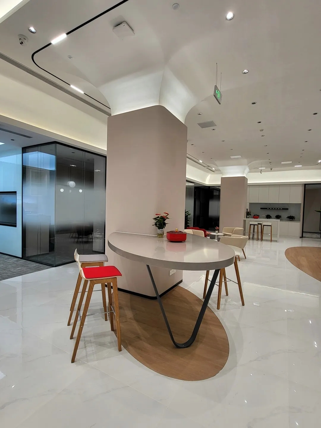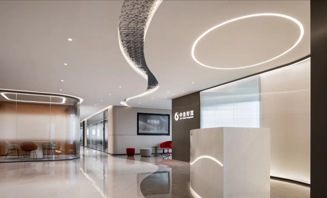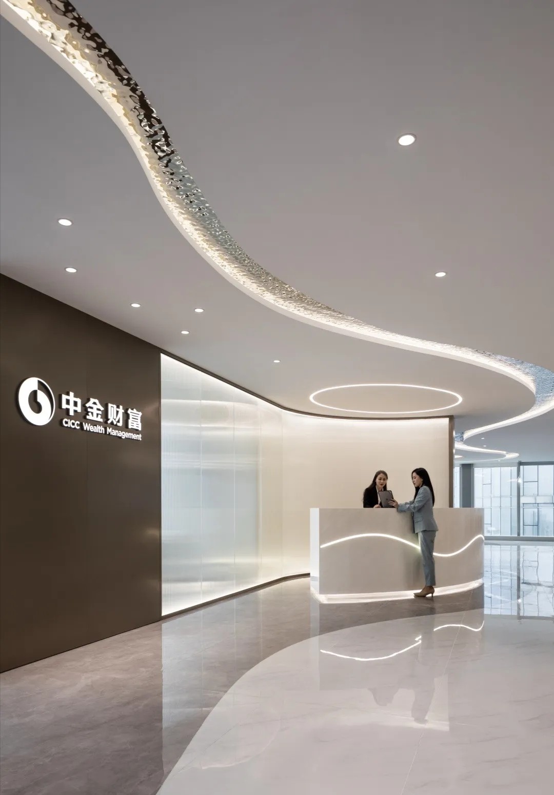 前台设计简洁明快,映入眼帘的暗红色背景墙与干净明丽的亮金LOGO对比鲜明,充分展现专业可靠的企业形象。色温、明度不一的灯光照明系统各司其职、有虚有实,将前台从整个营业厅中衬托出来,同时与接待大厅界限分明。多功能接待厅以浅咖色奠定明净羲和的主基调,红色的嵌入为空间添加了一丝热烈与奔放,让本就清朗的环境显得朝气明快、灵活舒适;弧形木质地板划分洽谈区与活动区,为空间增添几分动感,更让整个接待厅多了几分郁郁青葱,将人从高楼林立的都市中拉回自然边界,绿茵忽生、简洁灵动,凸显出另一种风度。填单台上下承接设计得十分巧妙,承重柱顶端四面平缓的过渡处理在灯带的加持下如叶片一般延展,柱旁连接台桌营造树下问学的氛围,极具时尚感、科技感、几何美和动态美。
