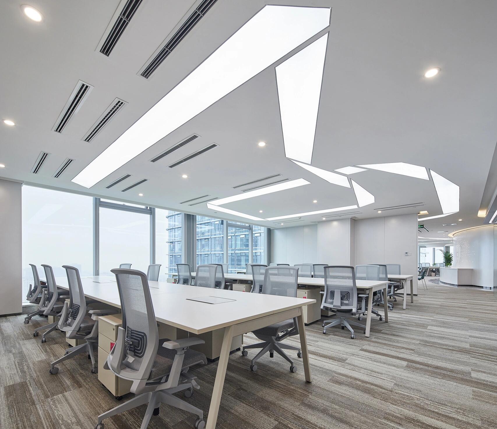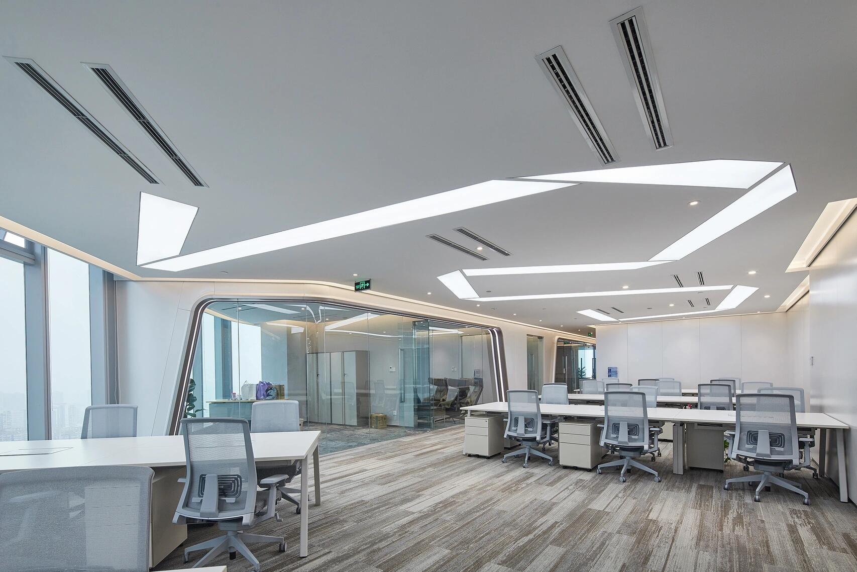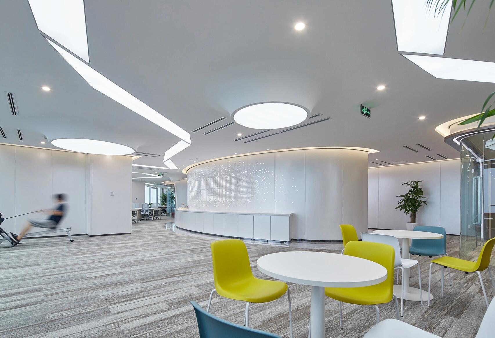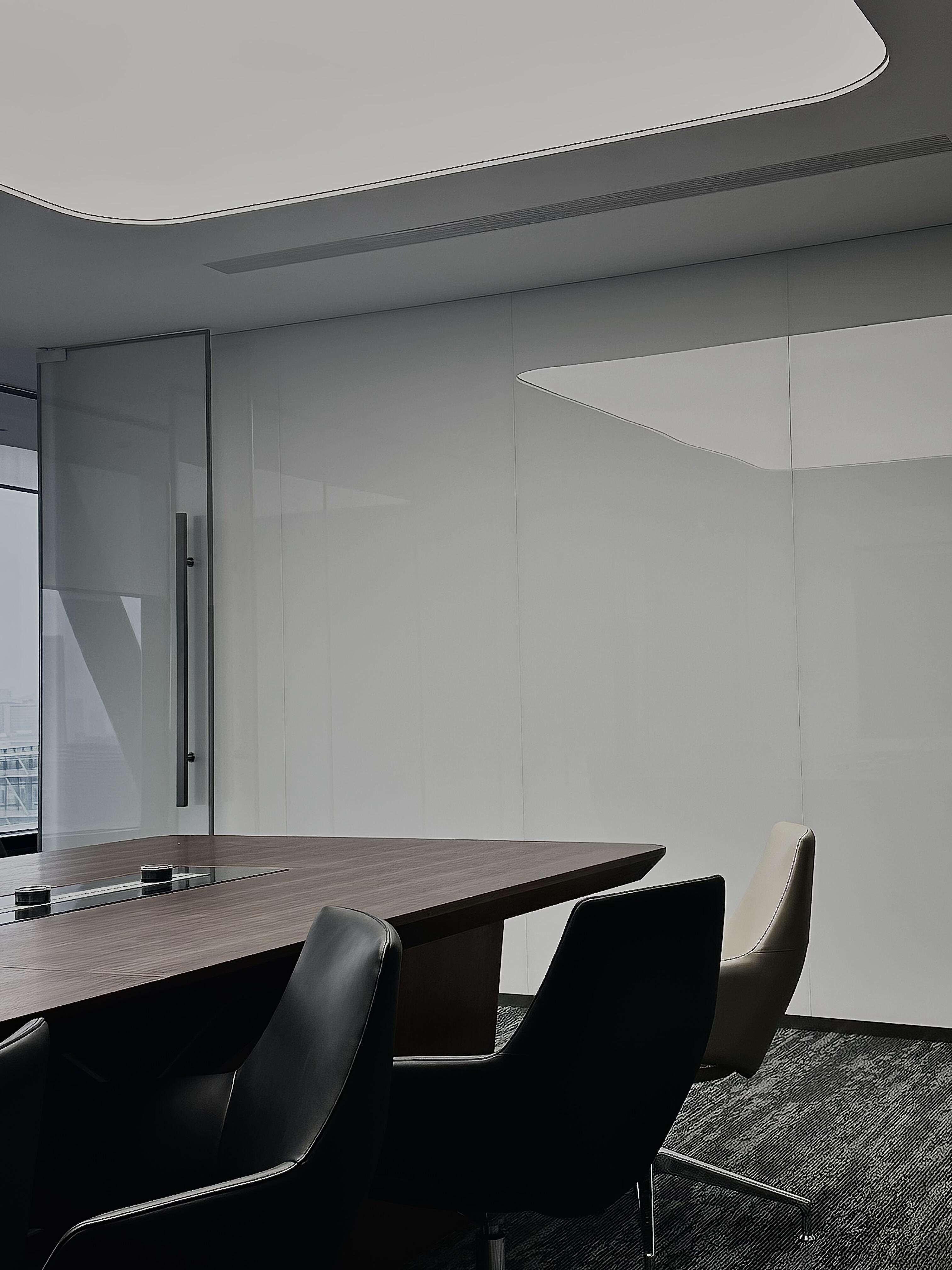 会议室及办公室外面的香槟色铝板与银色铝板搭配构成的弧形双曲金属板造型好似飞船太空舱的一部分;天花上的下凸造型好似星球火山口,折纸概念的发光膜条带连贯着每个空间,一切都散发浓浓的星际与未来。墙面冲孔的点阵Starteos.io英文和圆孔+小条的世界地图再一次强调了科技公司的属性,流线型的墙体及光带,让思绪在数字空间飞翔。