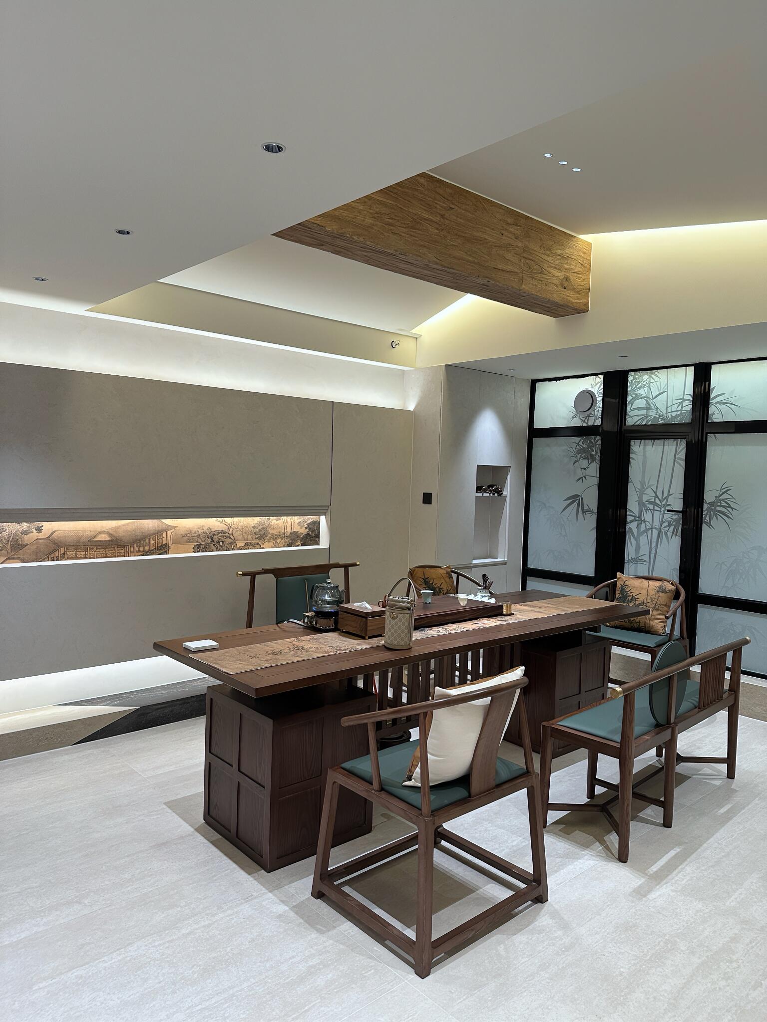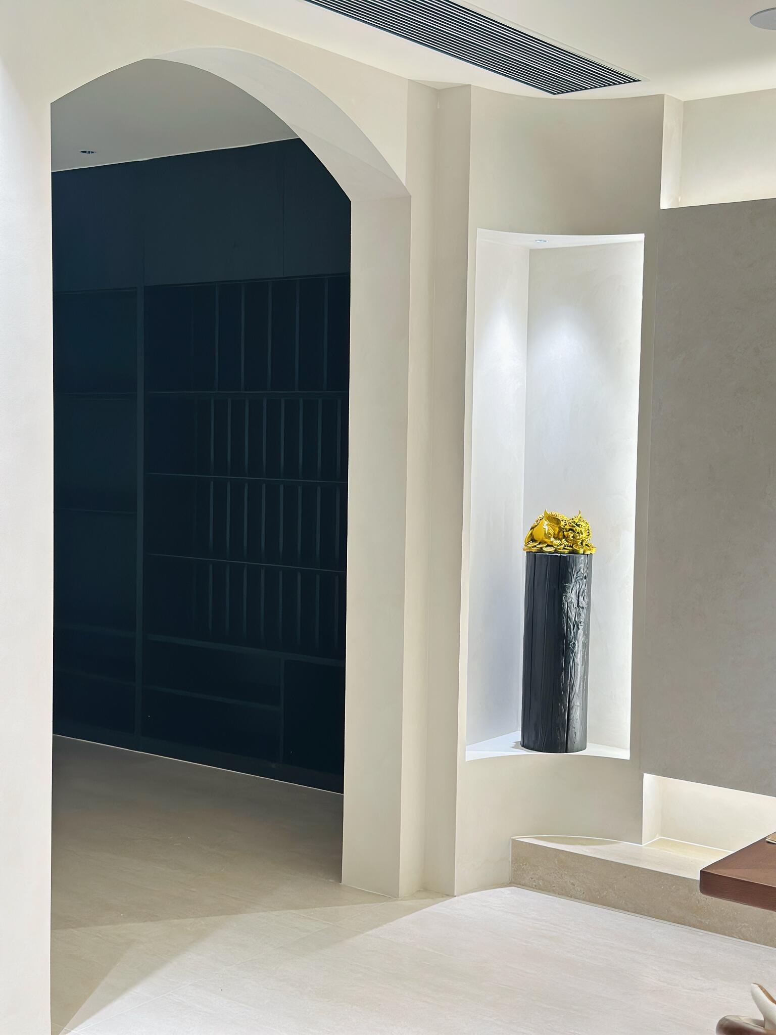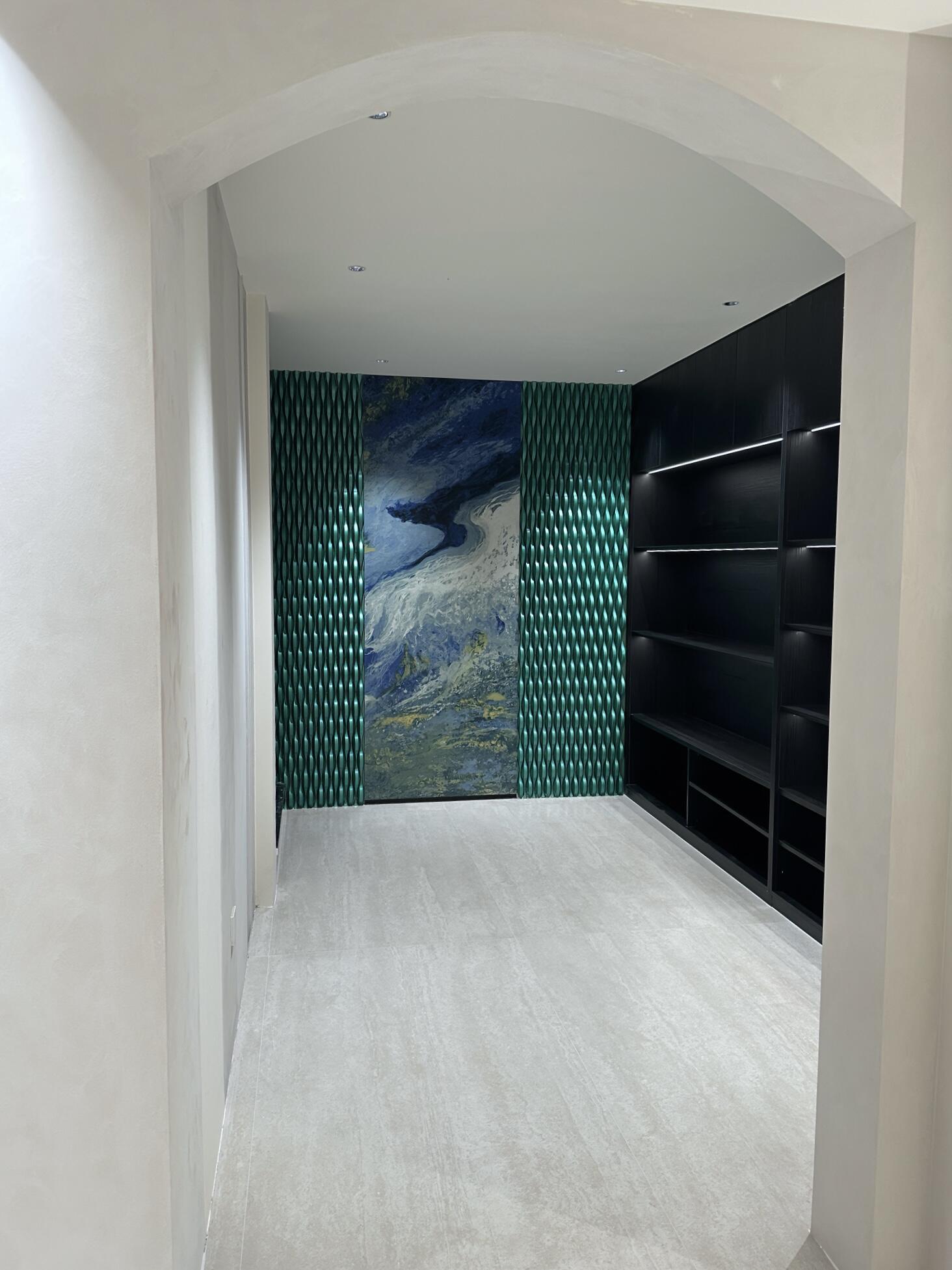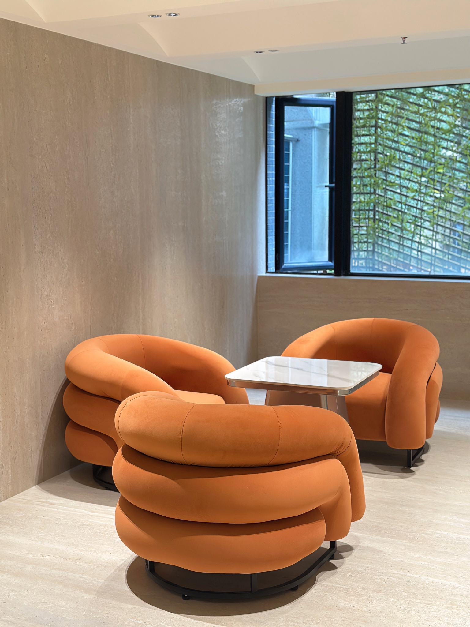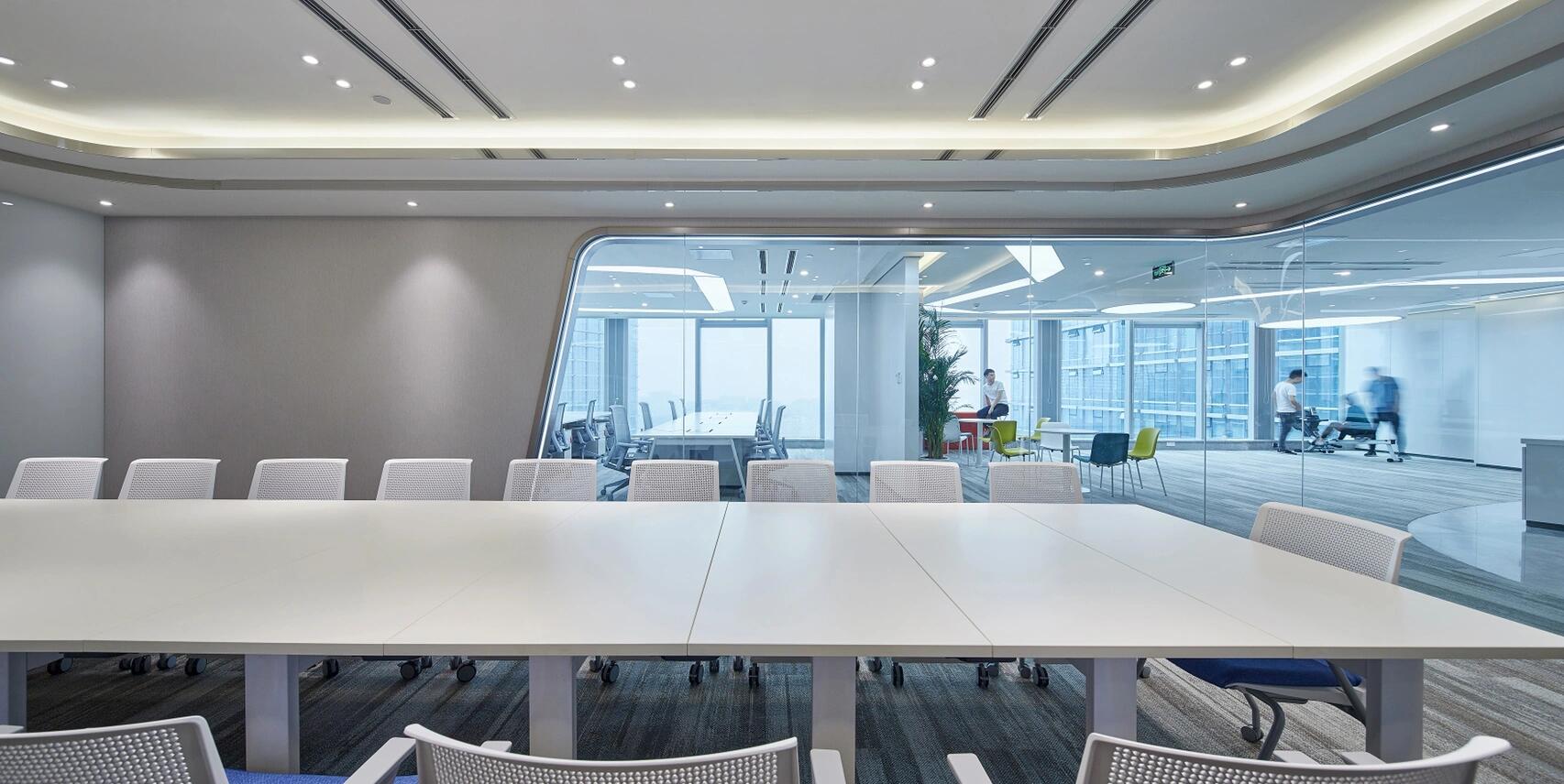 会议室及办公室外面的香槟色铝板与银色铝板搭配构成的弧形双曲金属板造型好似飞船太空舱的一部分;天花上的下凸造型好似星球火山口,折纸概念的发光膜条带连贯着每个空间,一切都散发浓浓的星际与未来。墙面冲孔的点阵Starteos.io英文和圆孔+小条的世界地图再一次强调了科技公司的属性,流线型的墙体及光带,让思绪在数字空间飞翔。