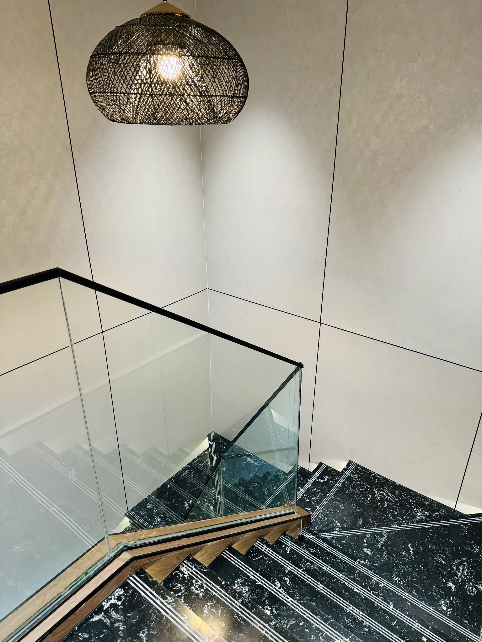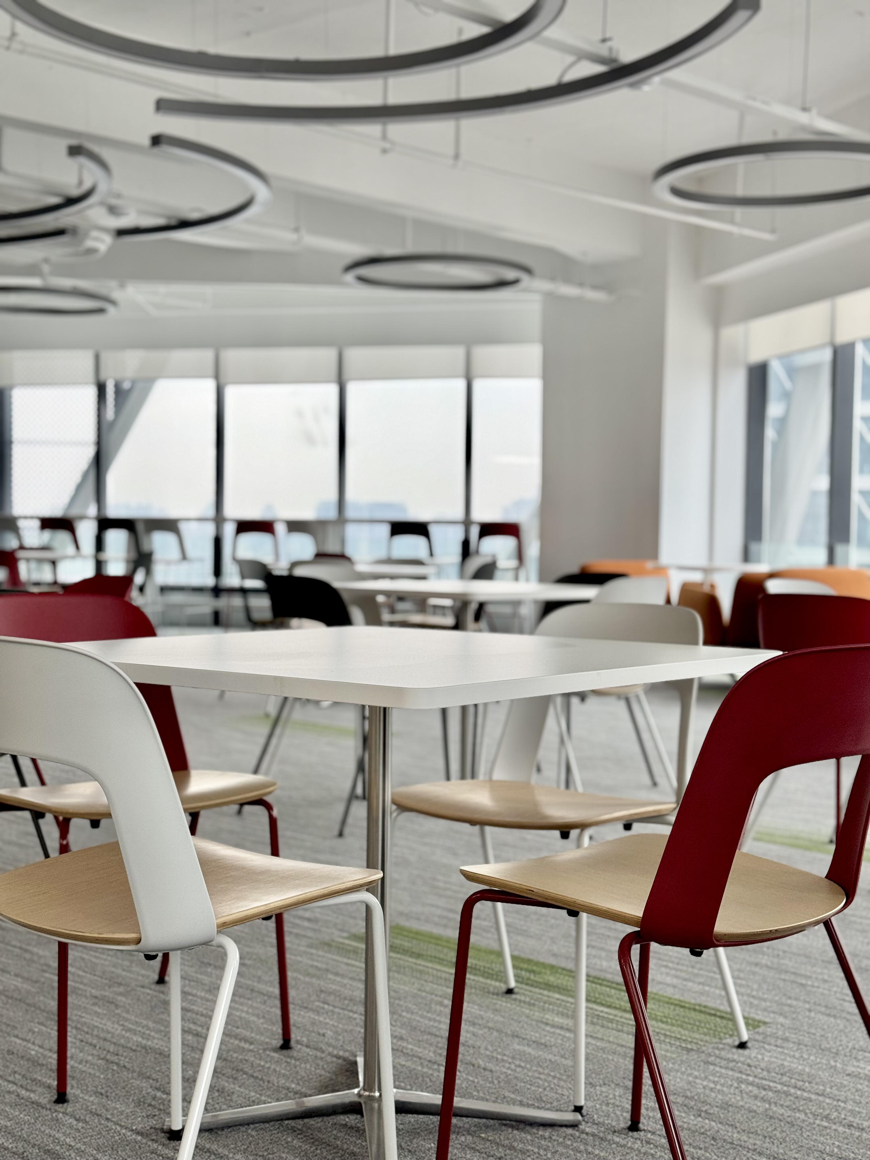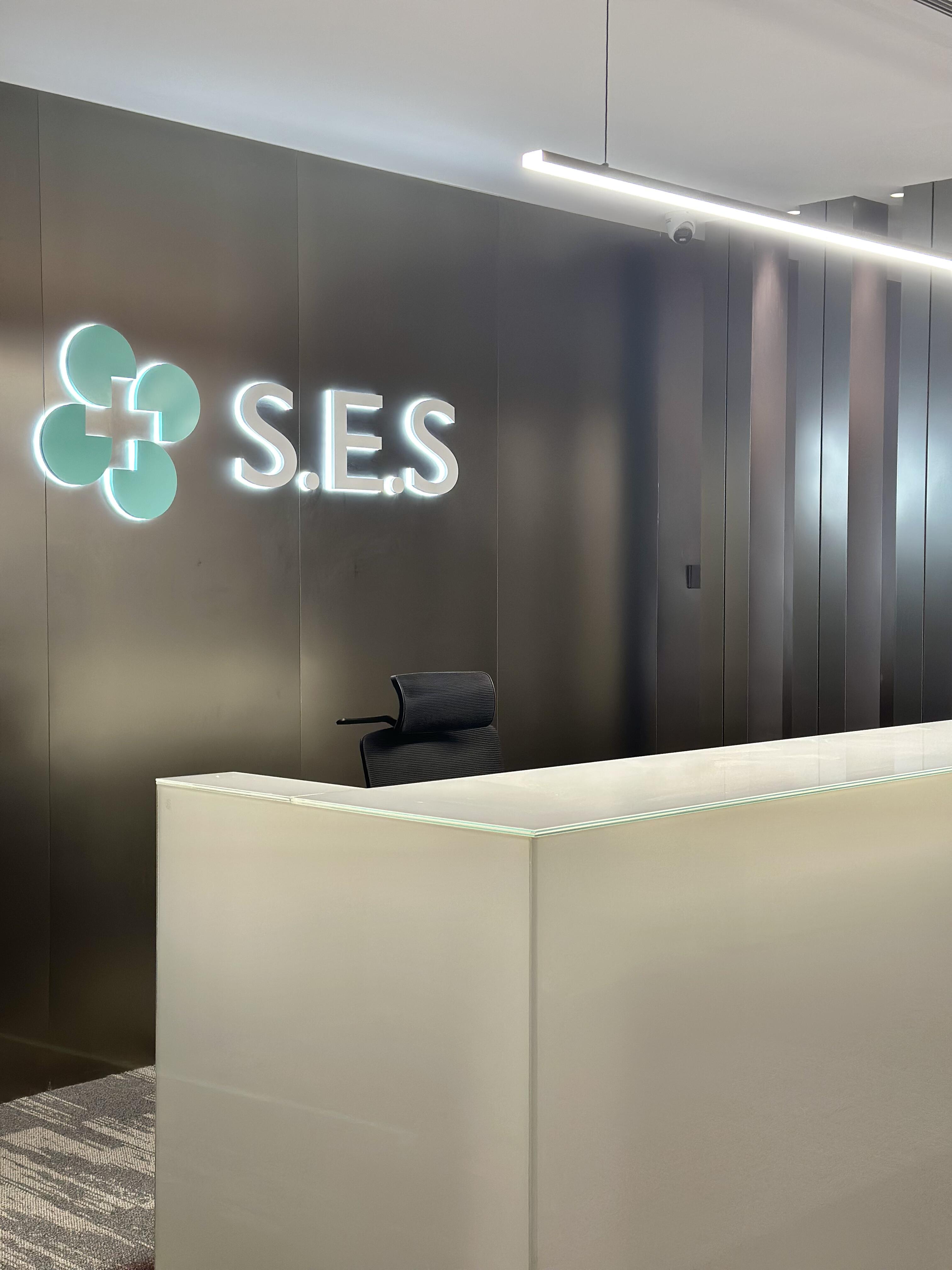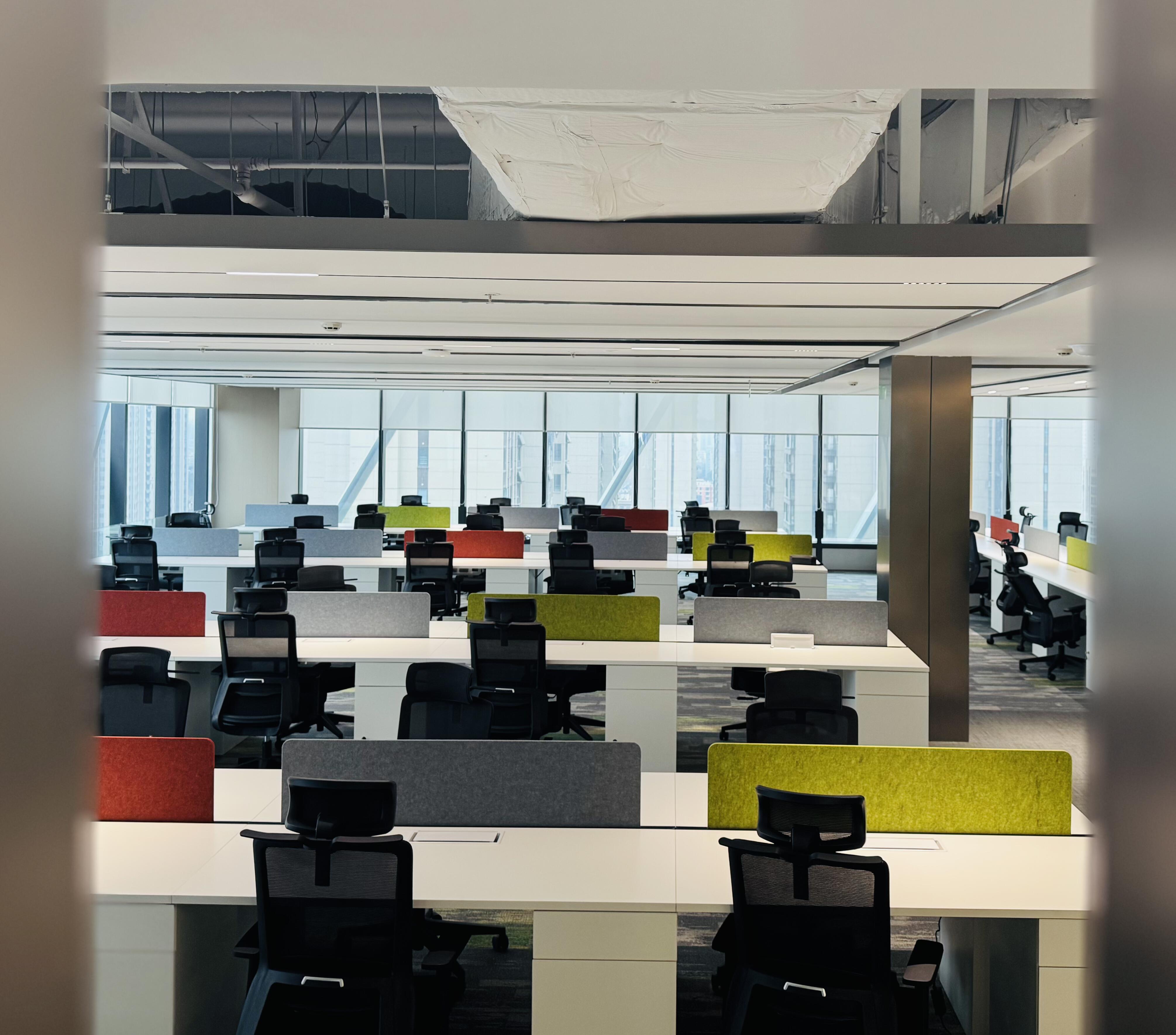 会议室及办公室外面的香槟色铝板与银色铝板搭配构成的弧形双曲金属板造型好似飞船太空舱的一部分;天花上的下凸造型好似星球火山口,折纸概念的发光膜条带连贯着每个空间,一切都散发浓浓的星际与未来。墙面冲孔的点阵Starteos.io英文和圆孔+小条的世界地图再一次强调了科技公司的属性,流线型的墙体及光带,让思绪在数字空间飞翔。