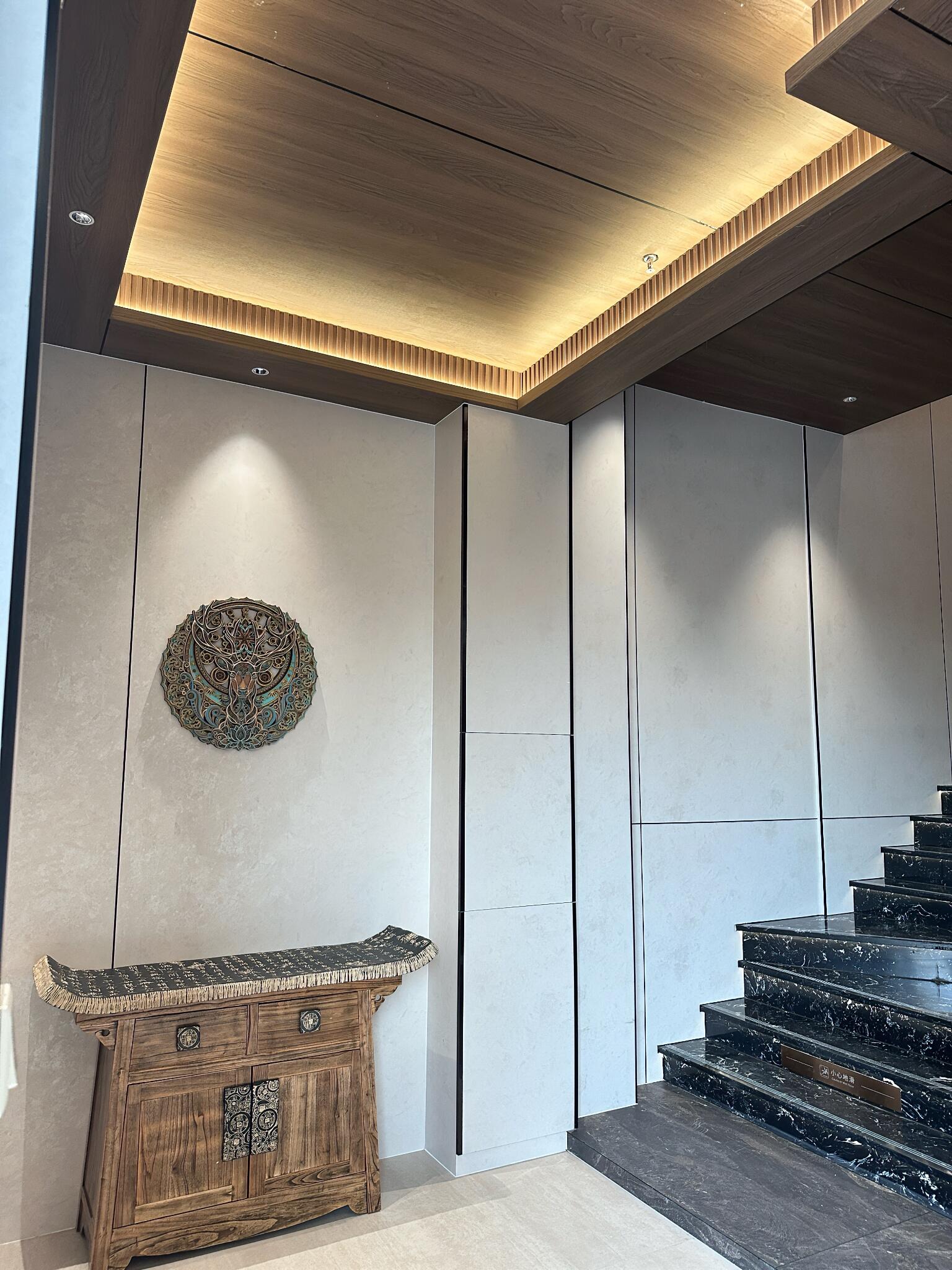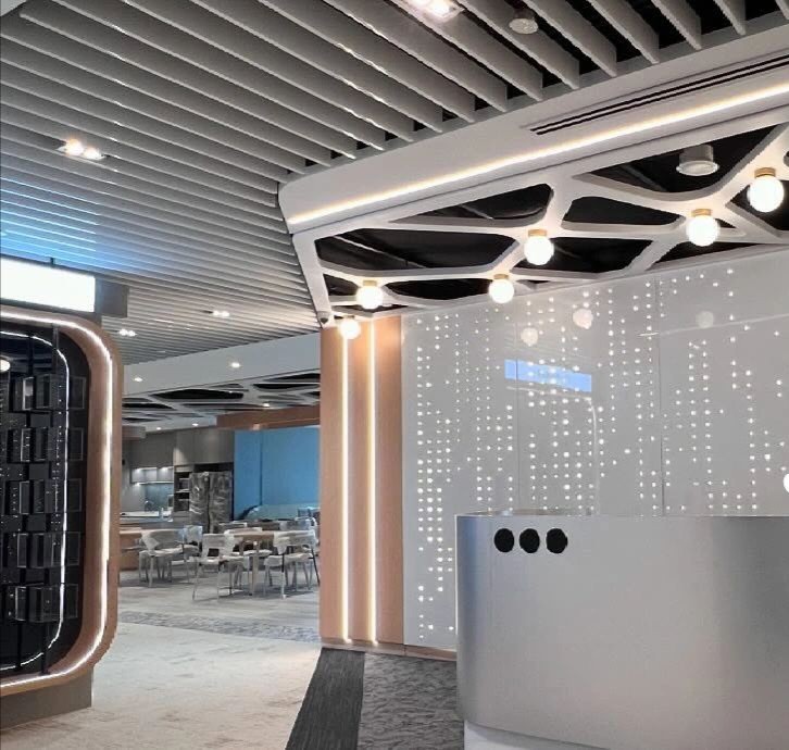 公司前台冲孔铝单板背景墙过道铝方通吊顶