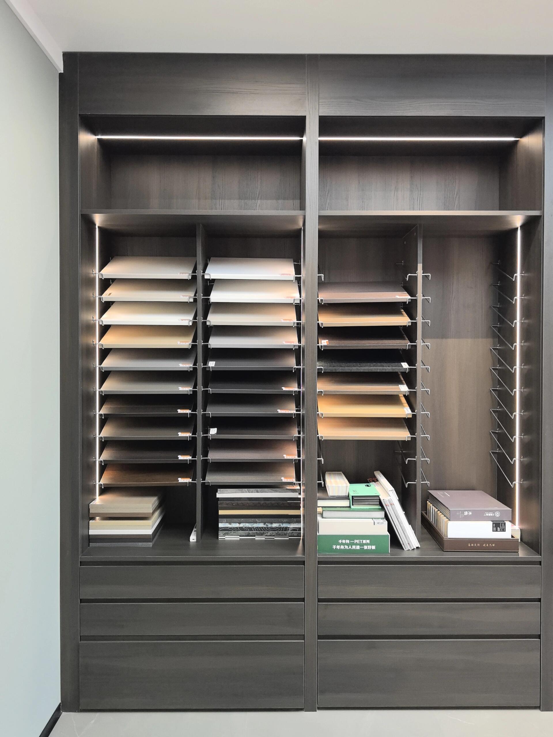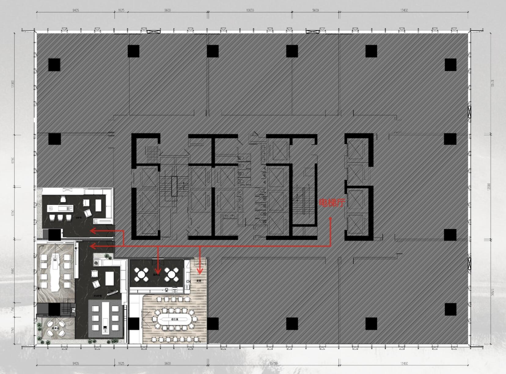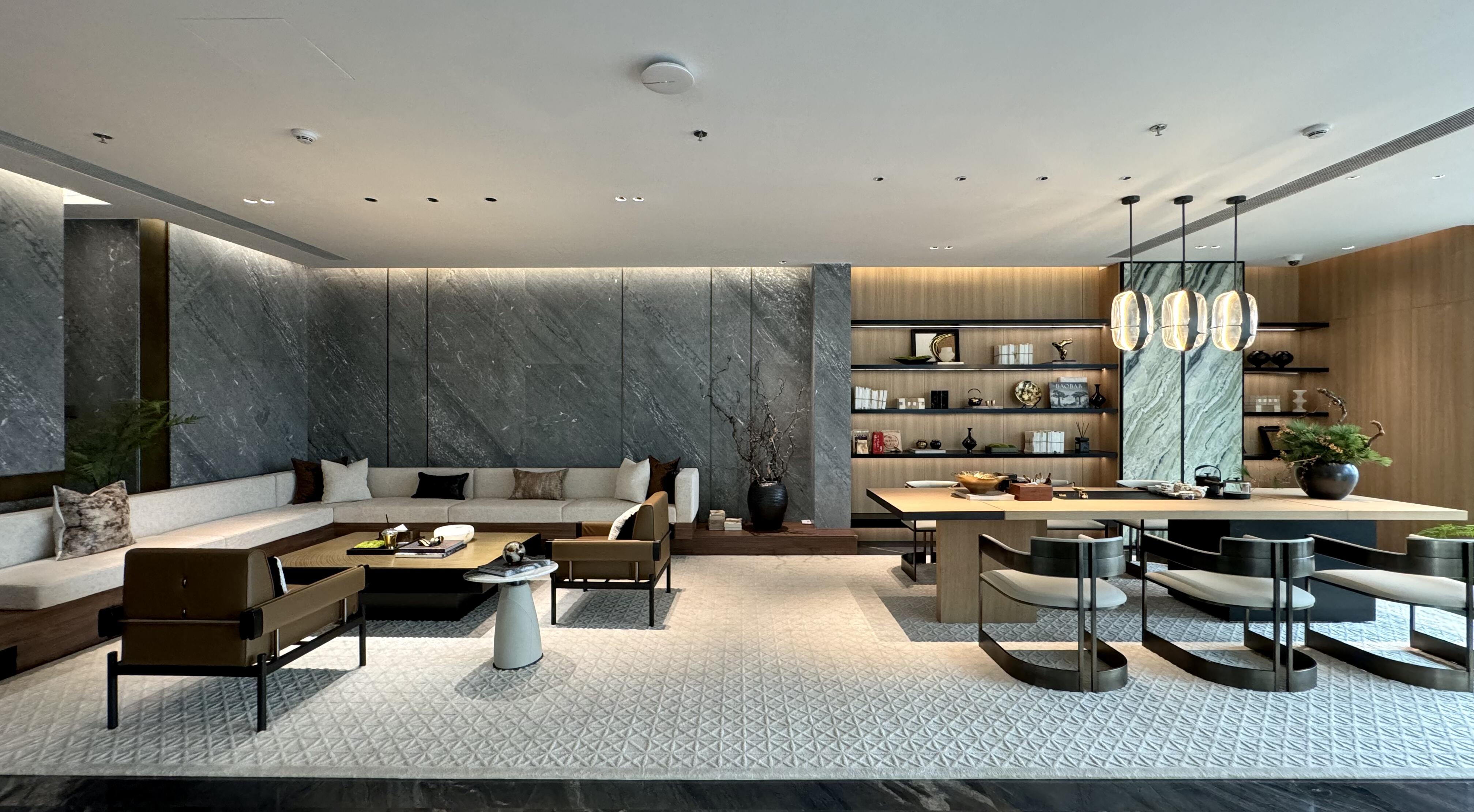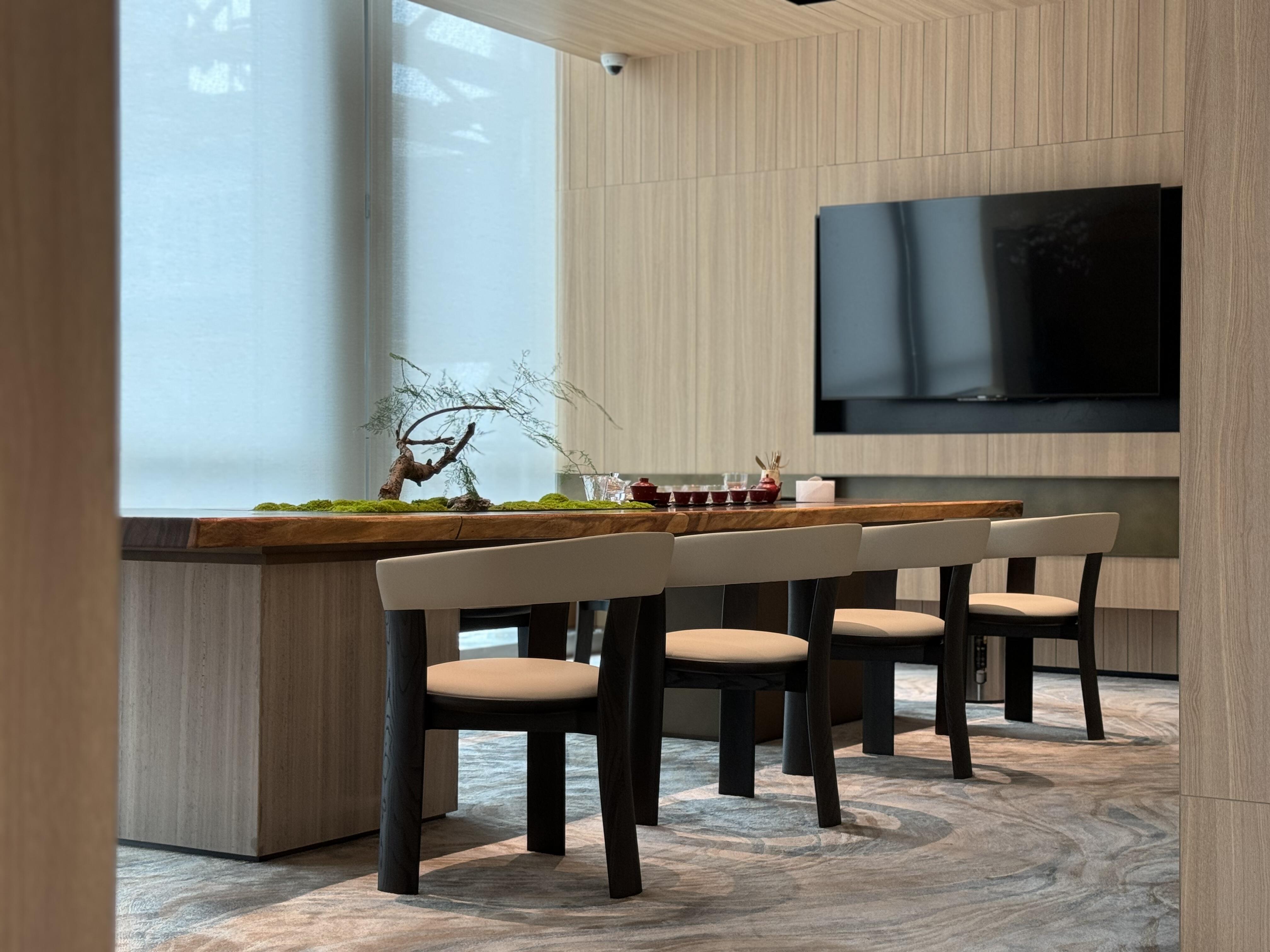 这次业主的委托内容,不是传统意义上的售楼中心,不是传统的办公样板间,也不是一块空地只做效果展示的展厅功能。虽然总面积不大,但是业主也对整体的功能分布,动线结构,以及呈现效果有特定的要求。在写字楼内部做针对写字楼客户的体验接待空间,需要充分了解客户的租售产品,用户的客户画像,和对接待功能的特定需求。在与业主讨论过数轮之后,决定以一大一小的复合接待空间,以茶室作为主要交流场景,搭配可展示可实用的综合会议空间,来打造整体的VIP会客中心。