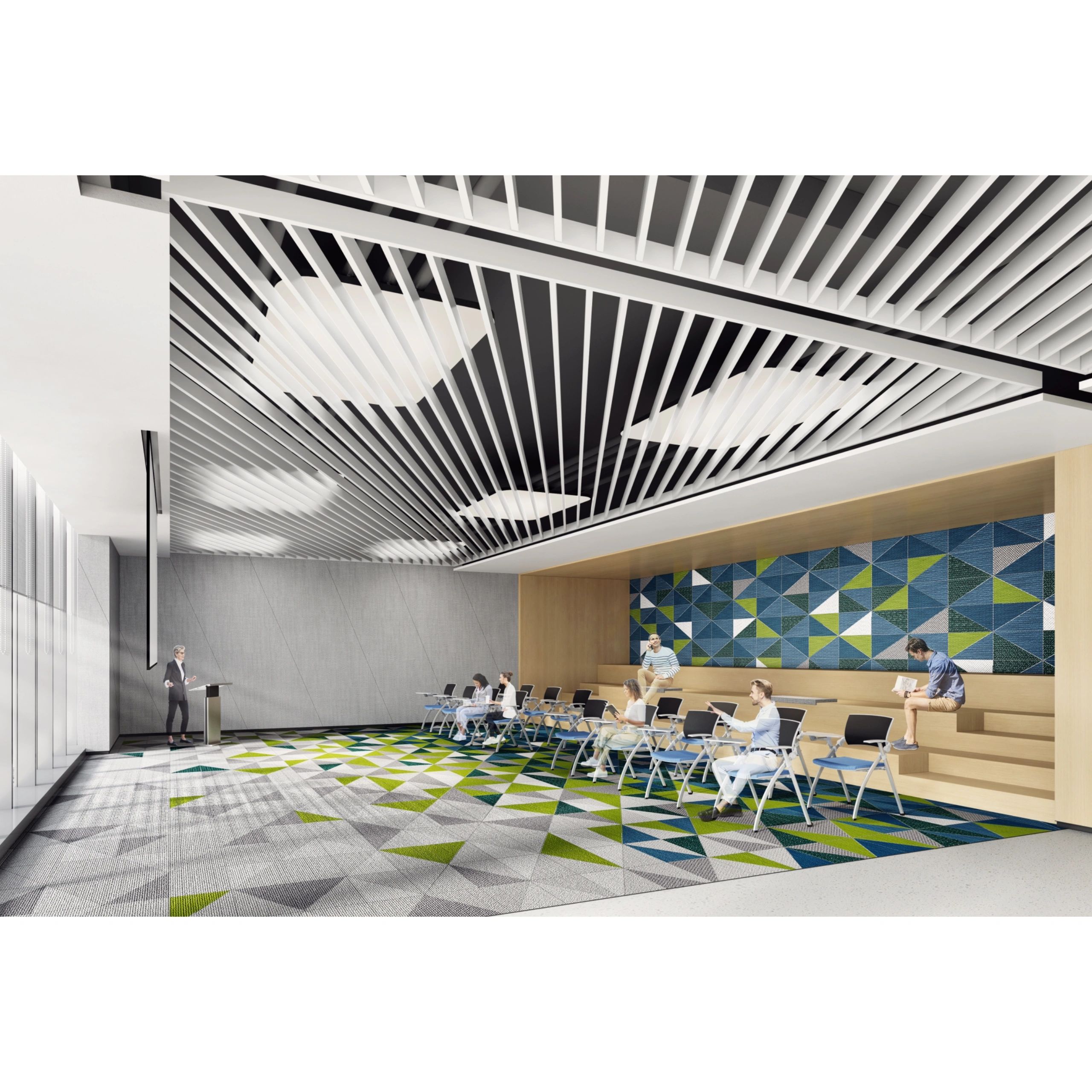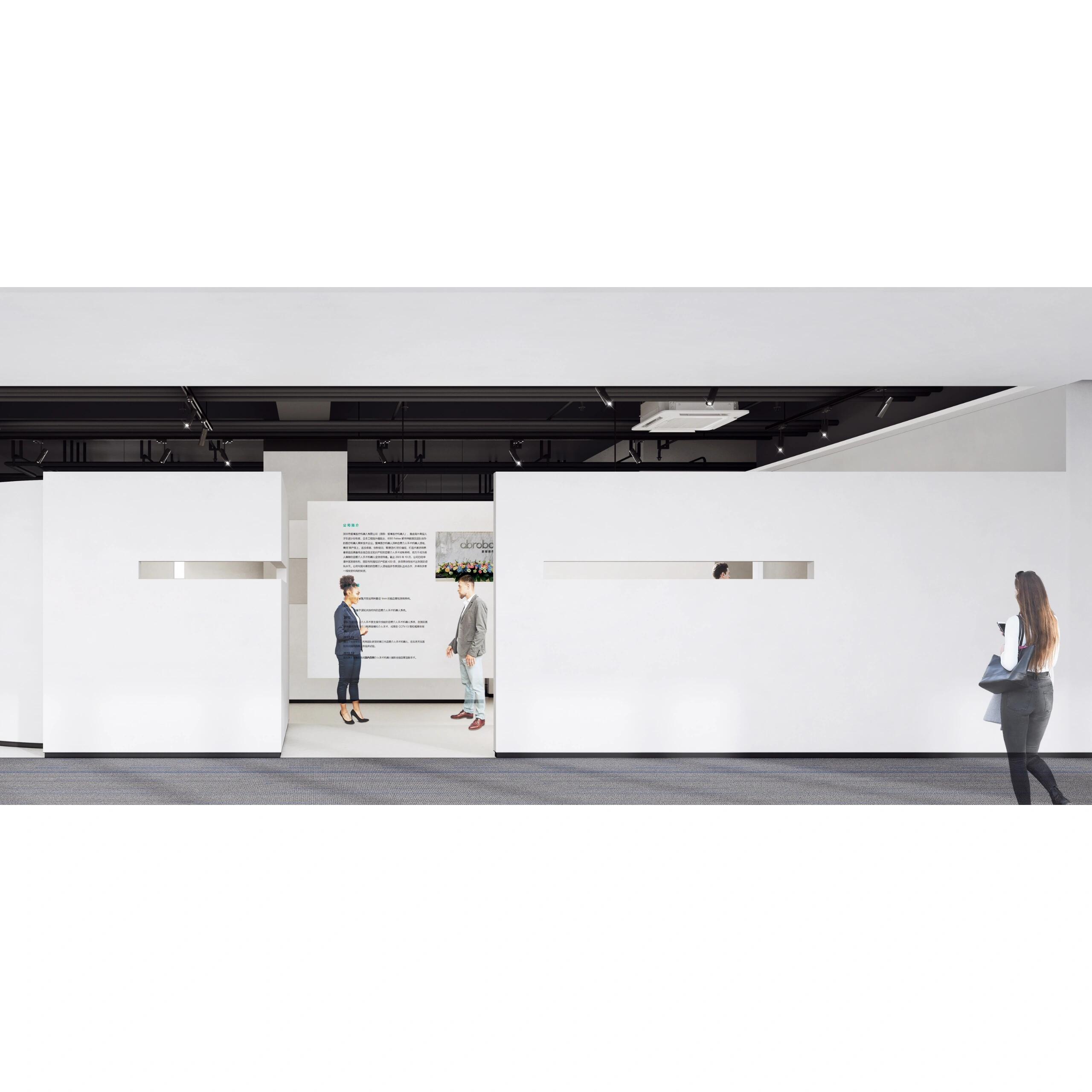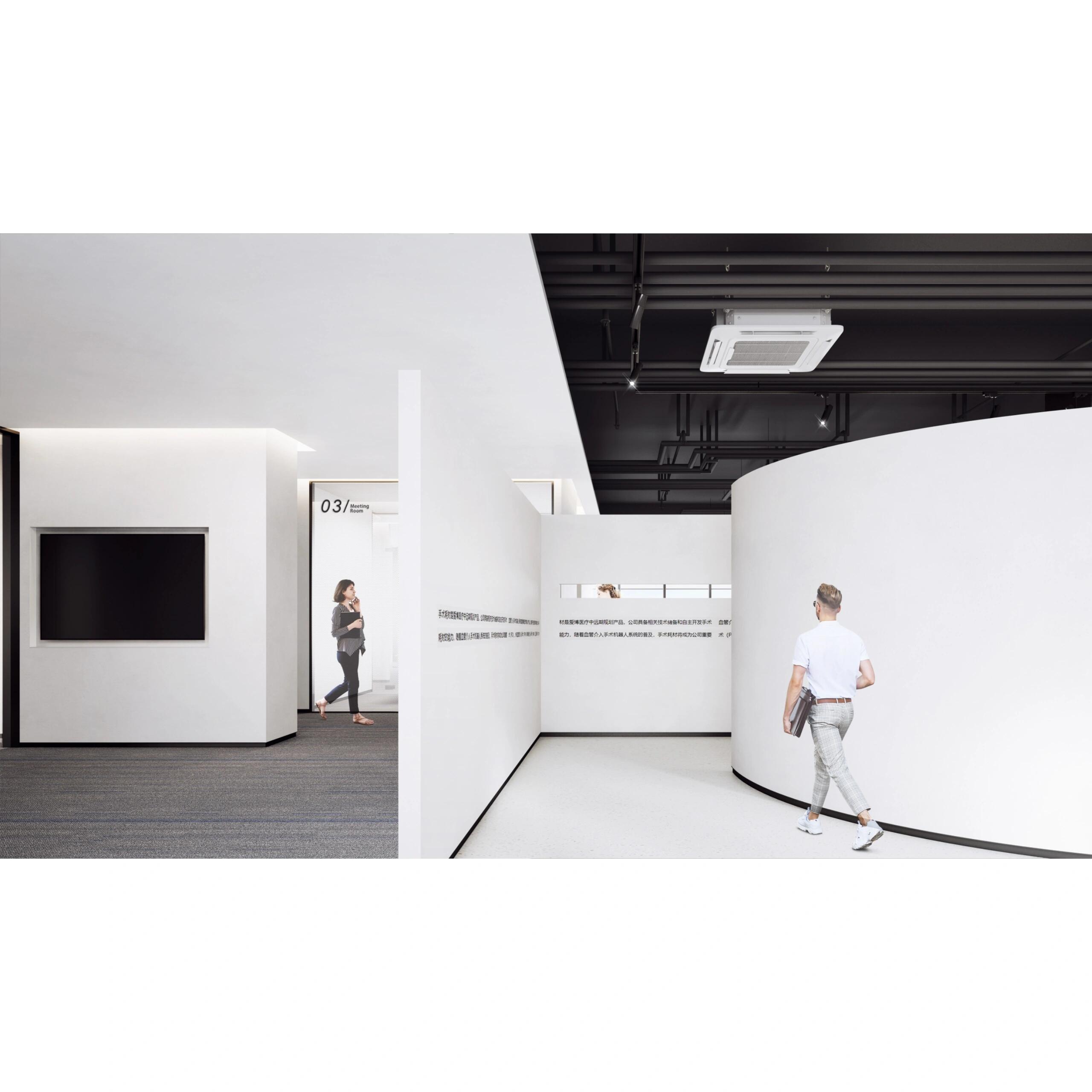 企业展厅的功能,被不同形状的半高墙面围合而成。墙面除了可以做企业文化的展示和投影背景,在人视角高度还有随机延伸的视觉通廊,让展厅两端的同事可以在不经意间被相互看到,同时也增加了大进深空间的视觉通透感。