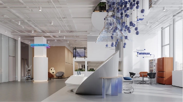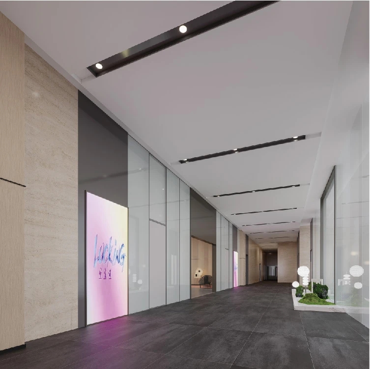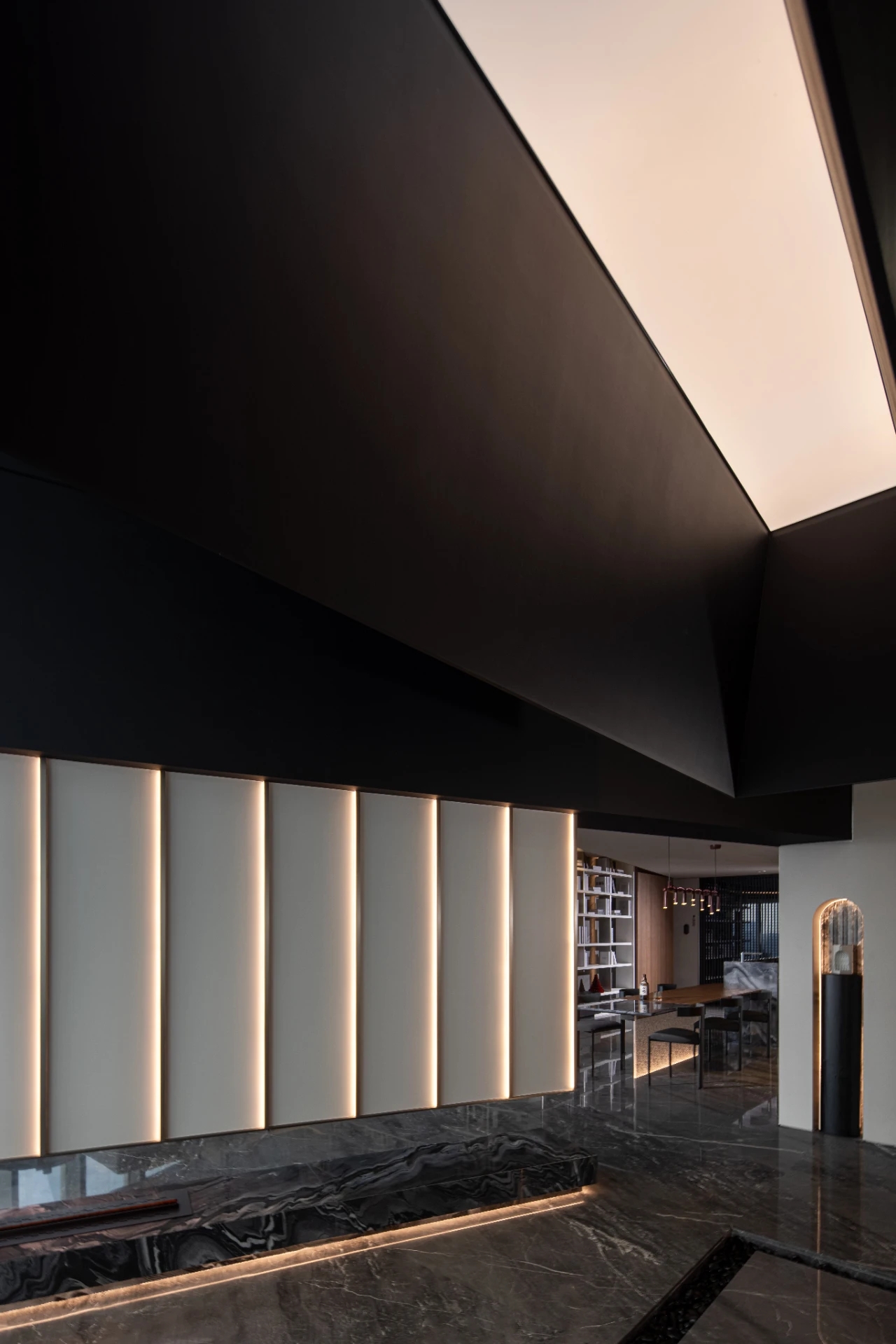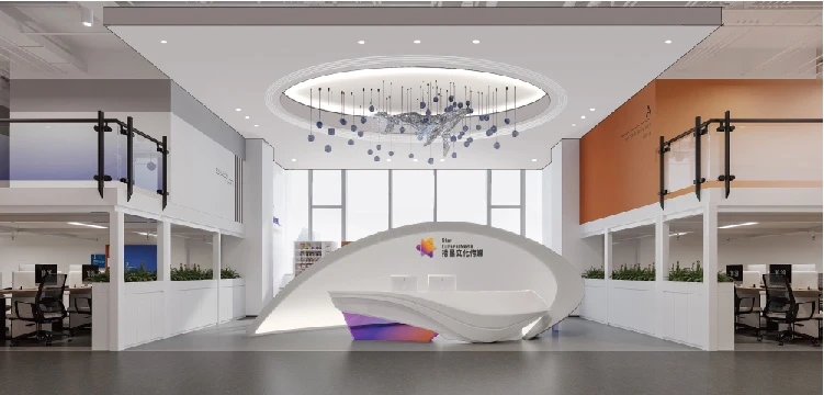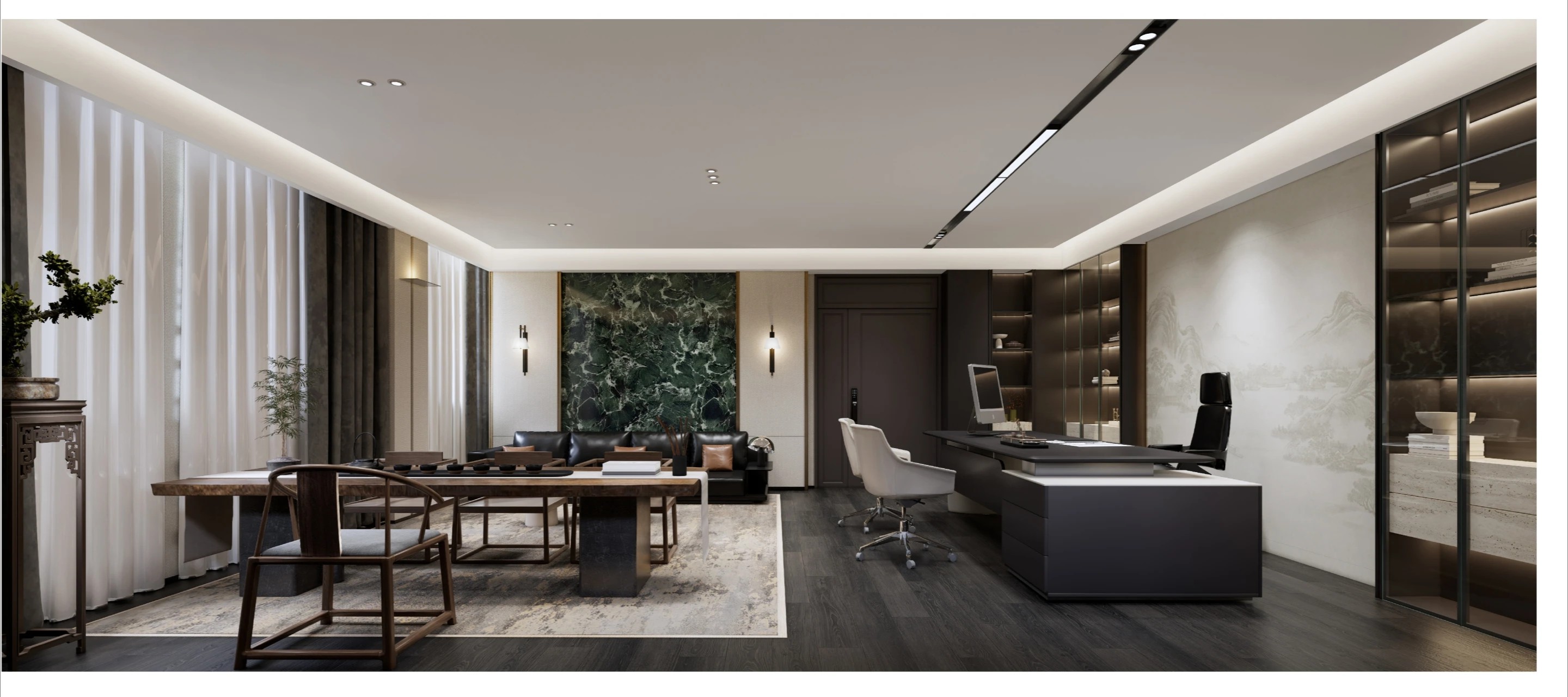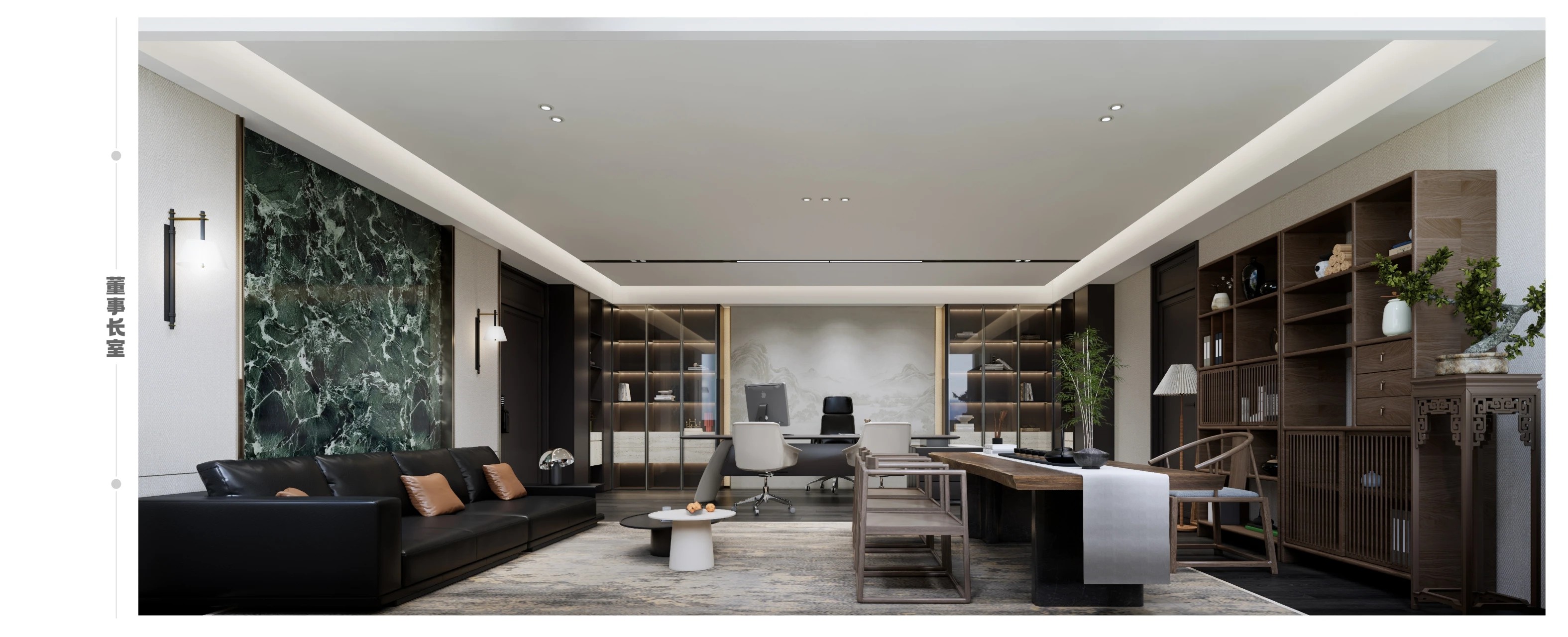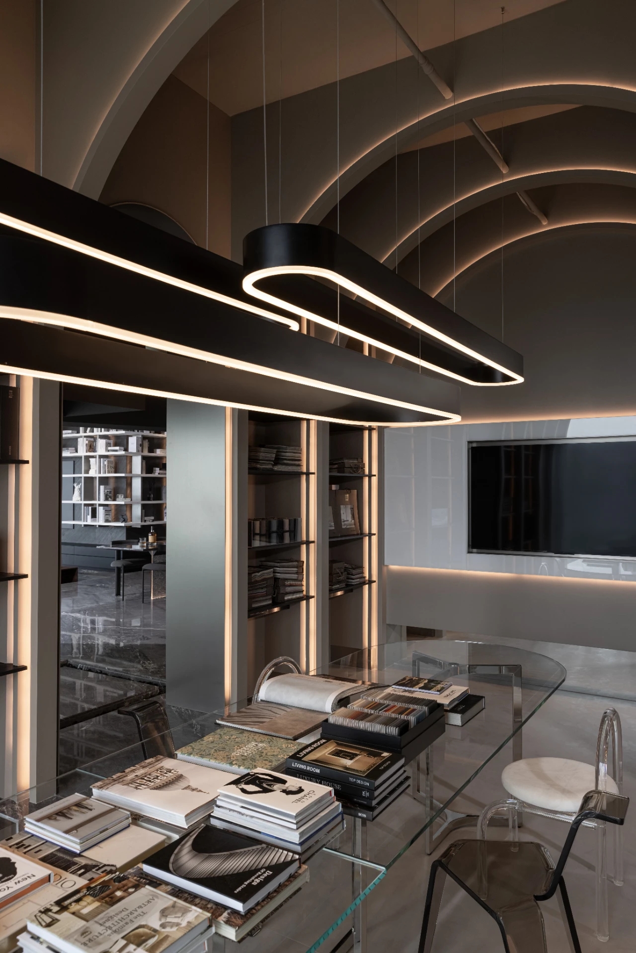 收纳吊柜作为空间区分的一环,位于下沉式区域旁。室内造景则营造出室内花园的氛围,将自然景色引入室内。长方形灯罩的吊顶设计,结合灯膜照明技术,呈现自然天光的光线效果。靠近窗户处设置的休闲桌椅,成为一处放松区域,让人在品茗观景中享受自然风光。软装办公区作为整个空间的重要组成部分,包括软装选样区、办公室等区域。在材质和造型上注重细节处理,通过墙面镜面材质实现空间过渡。软装选样区采用层层圆弧造型,结合线性光源和镜面衬托,强化空间的视觉延伸感。