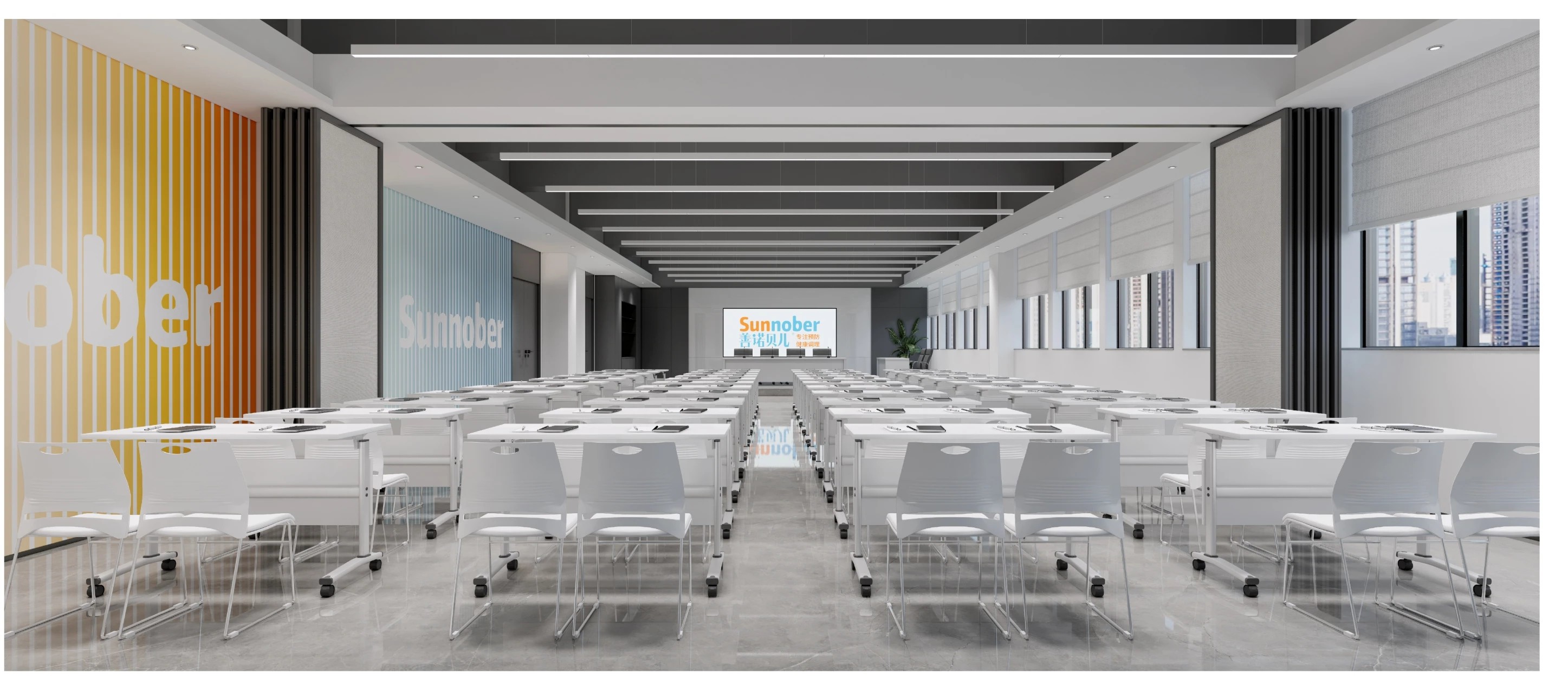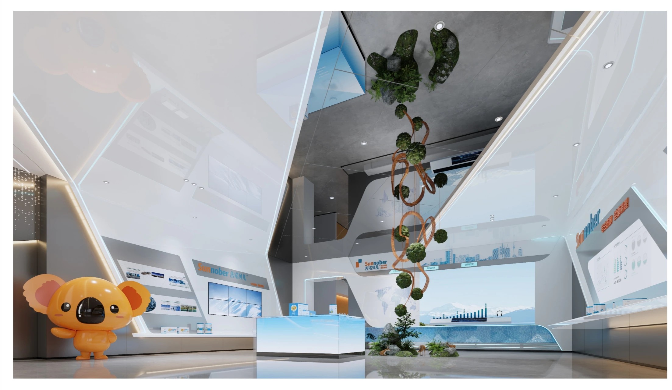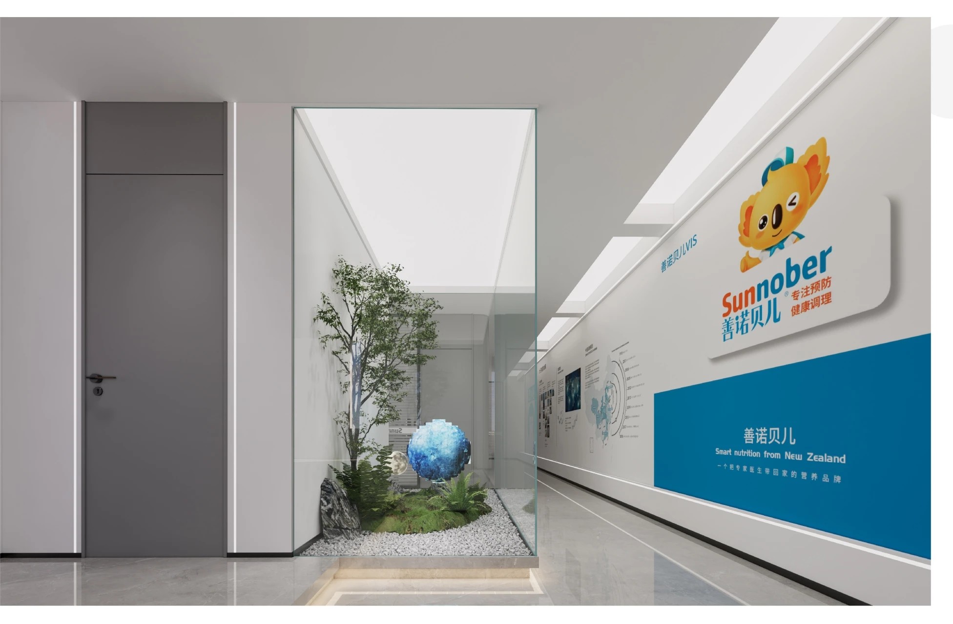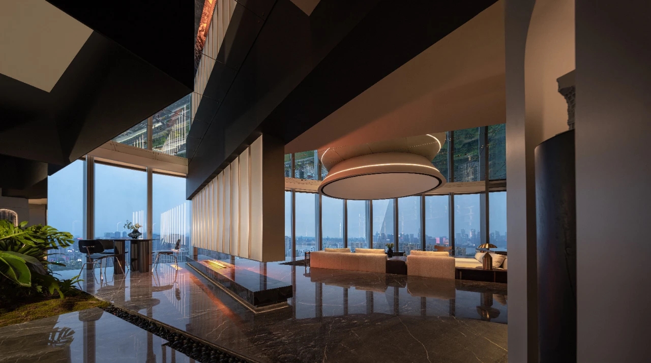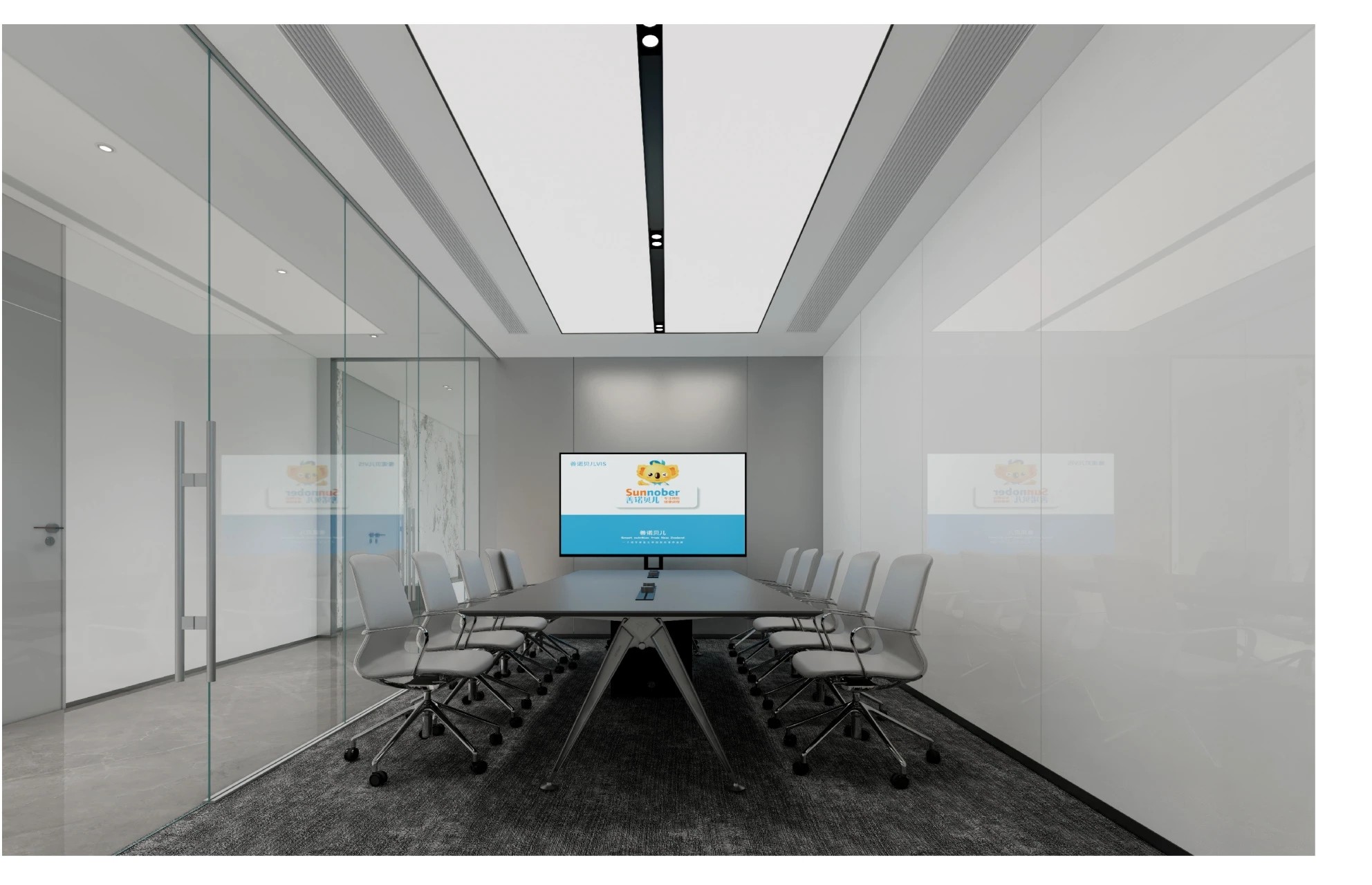 收纳吊柜作为空间区分的一环,位于下沉式区域旁。室内造景则营造出室内花园的氛围,将自然景色引入室内。长方形灯罩的吊顶设计,结合灯膜照明技术,呈现自然天光的光线效果。靠近窗户处设置的休闲桌椅,成为一处放松区域,让人在品茗观景中享受自然风光。软装办公区作为整个空间的重要组成部分,包括软装选样区、办公室等区域。在材质和造型上注重细节处理,通过墙面镜面材质实现空间过渡。软装选样区采用层层圆弧造型,结合线性光源和镜面衬托,强化空间的视觉延伸感。