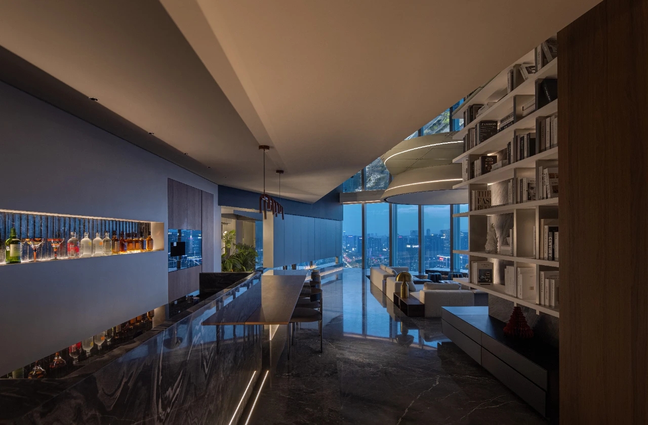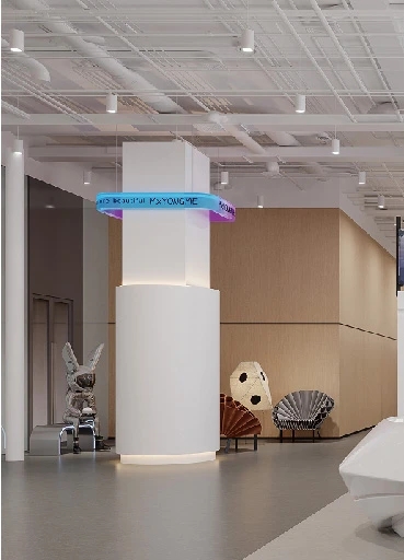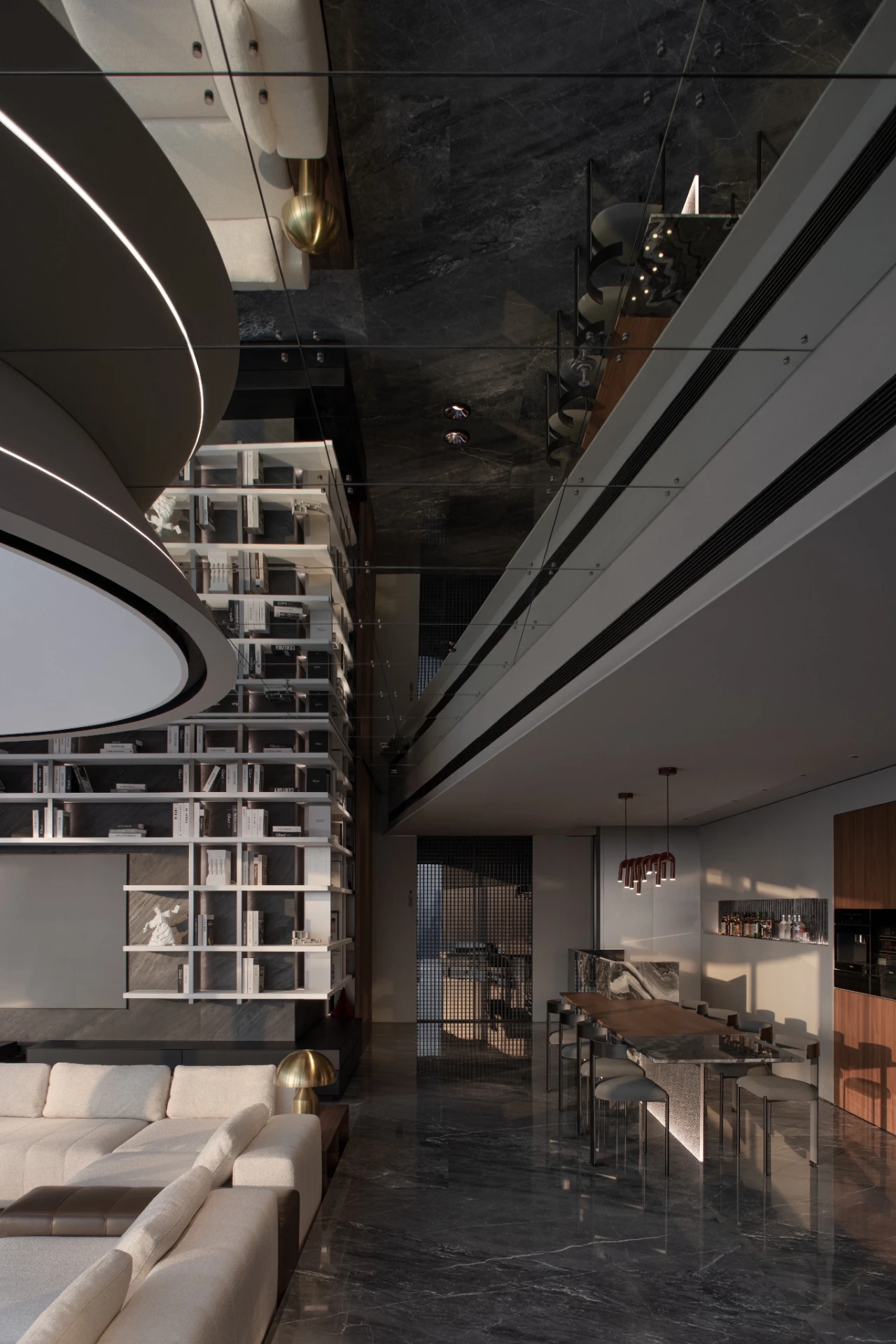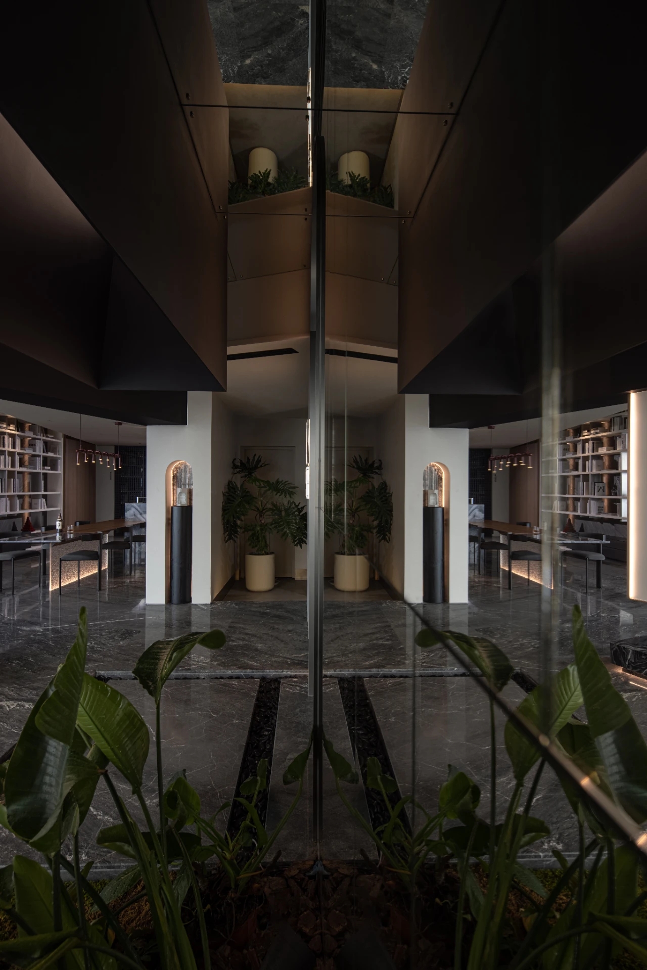 在整体规划中,我们以电影《盗梦空间》的灵感启示,采用独特的空间设计手法和多种材质,将私密与公共空间、不同氛围完美融合,展现出卓越的凝聚力和设计感。致力于创造一个融合工作与社交的空间。我们在规划时,不仅考虑了空间的比例和视野,更注重通过独特的解构和重构方式,营造出一个既有家的温馨又不失工作氛围的独特空间。整个空间的光线充足,每个区域都享有自然采光,在视觉上营造出一种宽敞、明亮的感觉。会客空间视野开阔,能够满足不同客户的会客需求。据功能需求,我们将空间划分为三大区域:会客区、软装设计办公室和硬装设计办公室。会客区作为核心区域,包括前厅、休闲水吧区、沙发会客区以及室内造景区。为降低办公空间的严肃性,入口处未设置常规接待前台,通过巧妙的空间设计,营造进入不同空间的神秘感,激发探索和好奇心。一整面通透的落地玻璃。我们在空间的中心区域打造了一个下沉式会客区,与门口抬高处完美衔接。顶部镜面设计在视觉上实现纵向延伸,下沉式沙发区域采用圆形顶面造型,营造安全舒适的氛围。