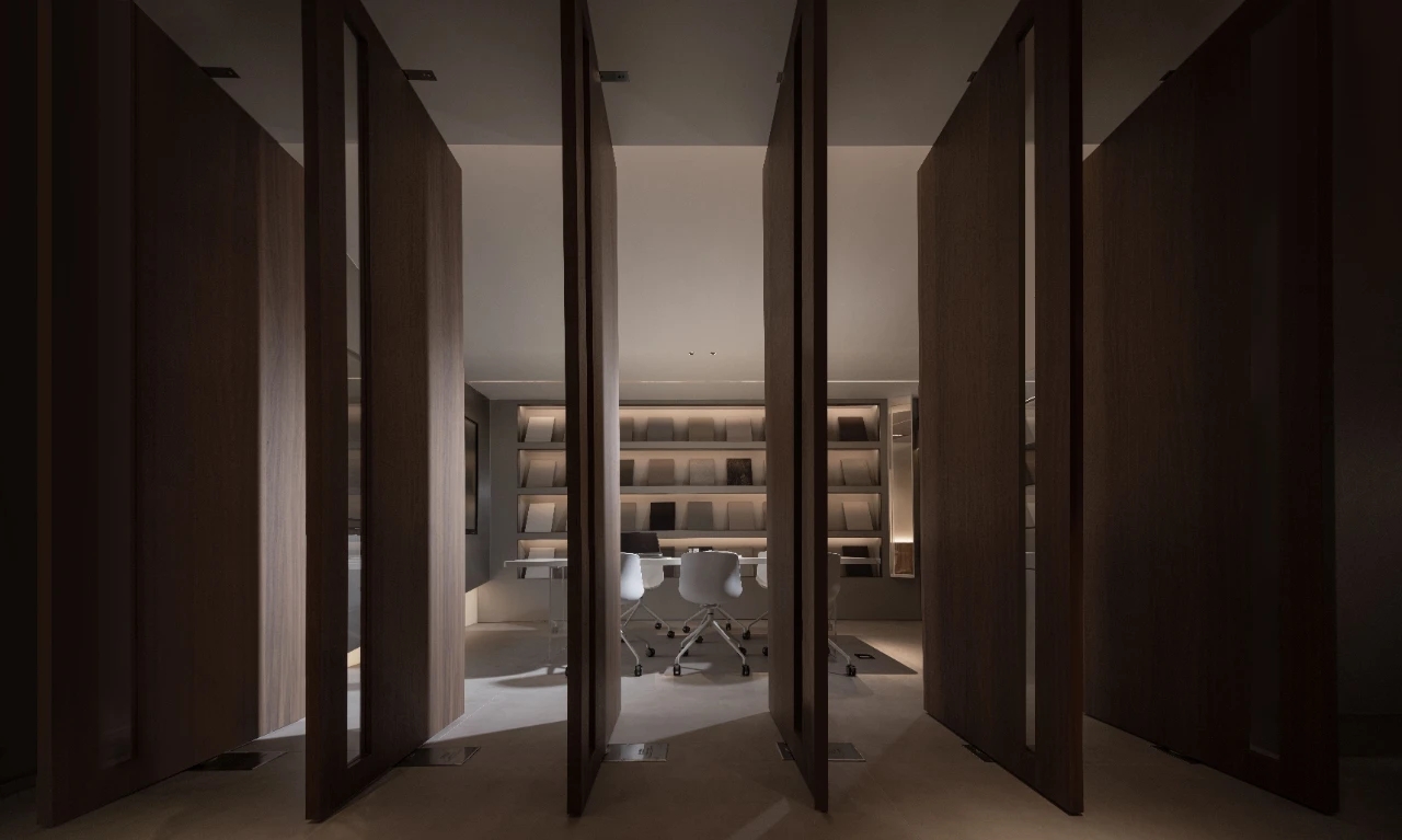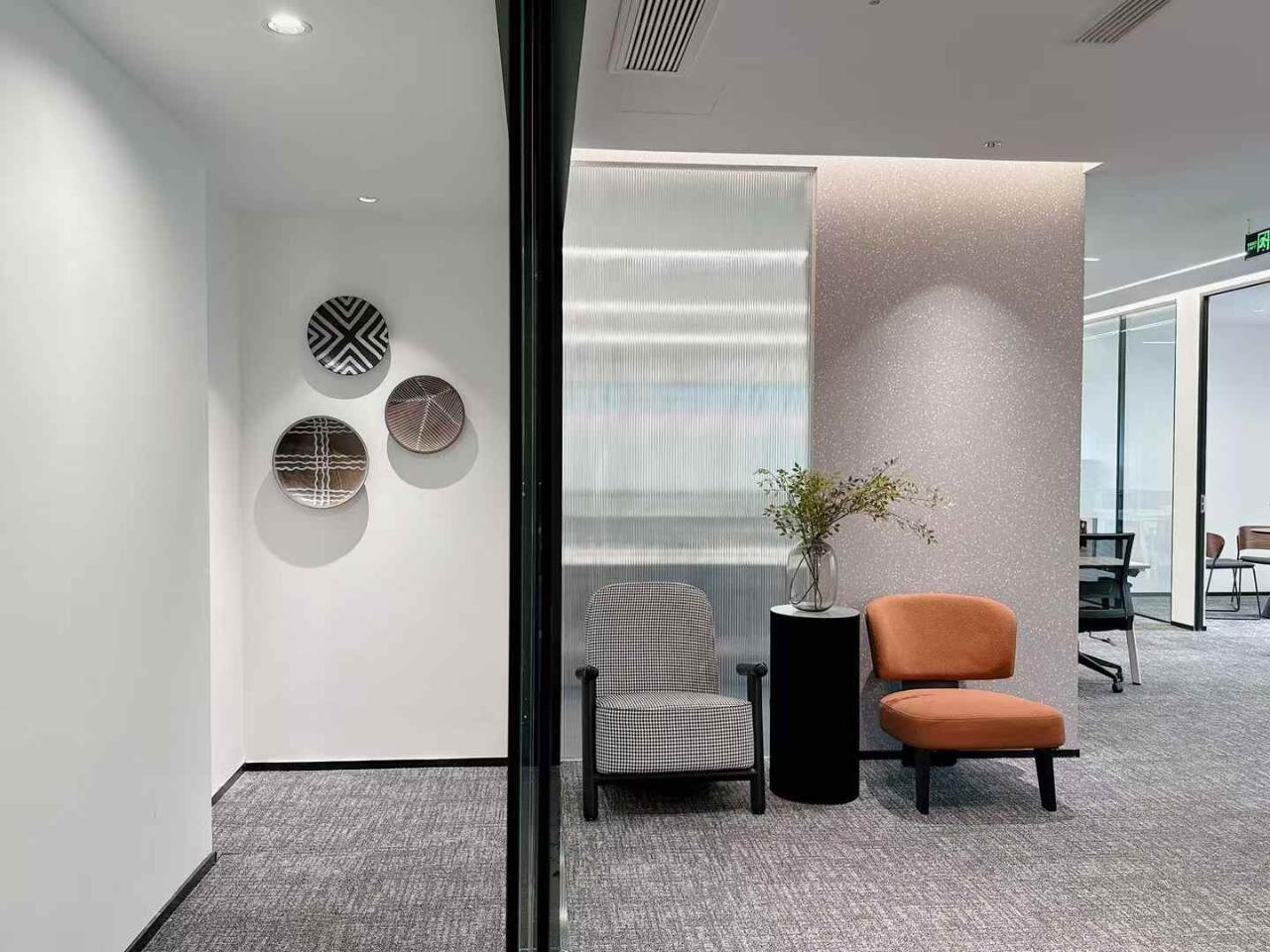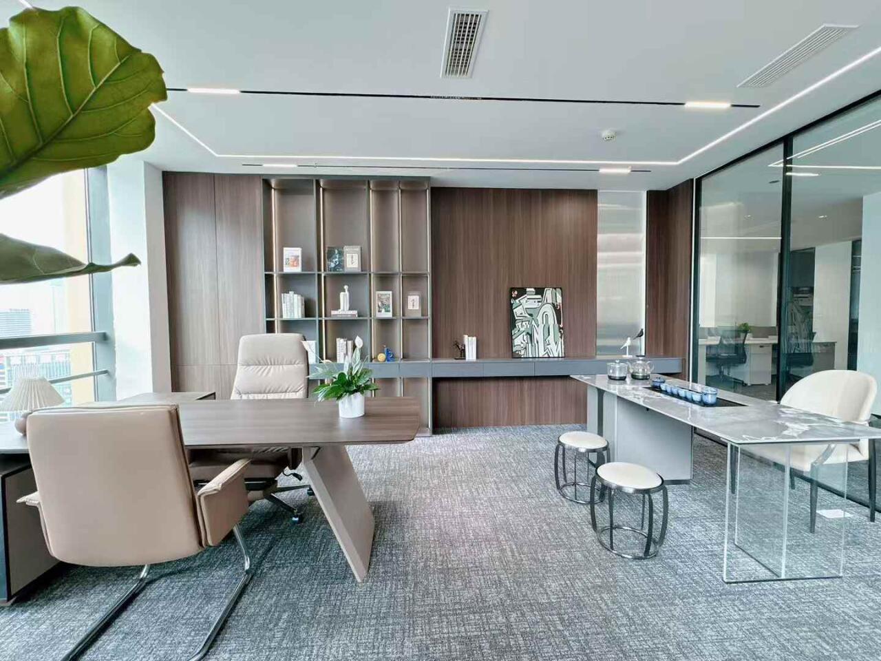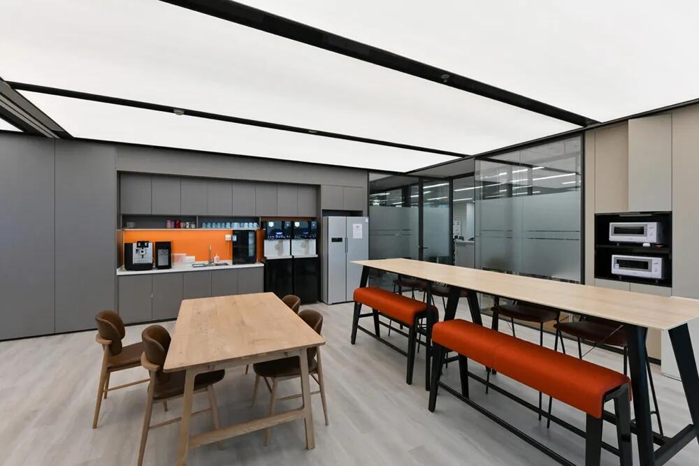 在接待前厅左右两边各设置了一个大会议室,其中一个是现代酷灰的可二合一的会议室,另一个是稳重优雅的行政会议室。感谢成品隔断供应商卡莱斯卓的紧密配合和支持,在设计师的要求下,把LED灯带嵌入了双层玻璃隔断中。让整个会议室区域看上去充满科技感!