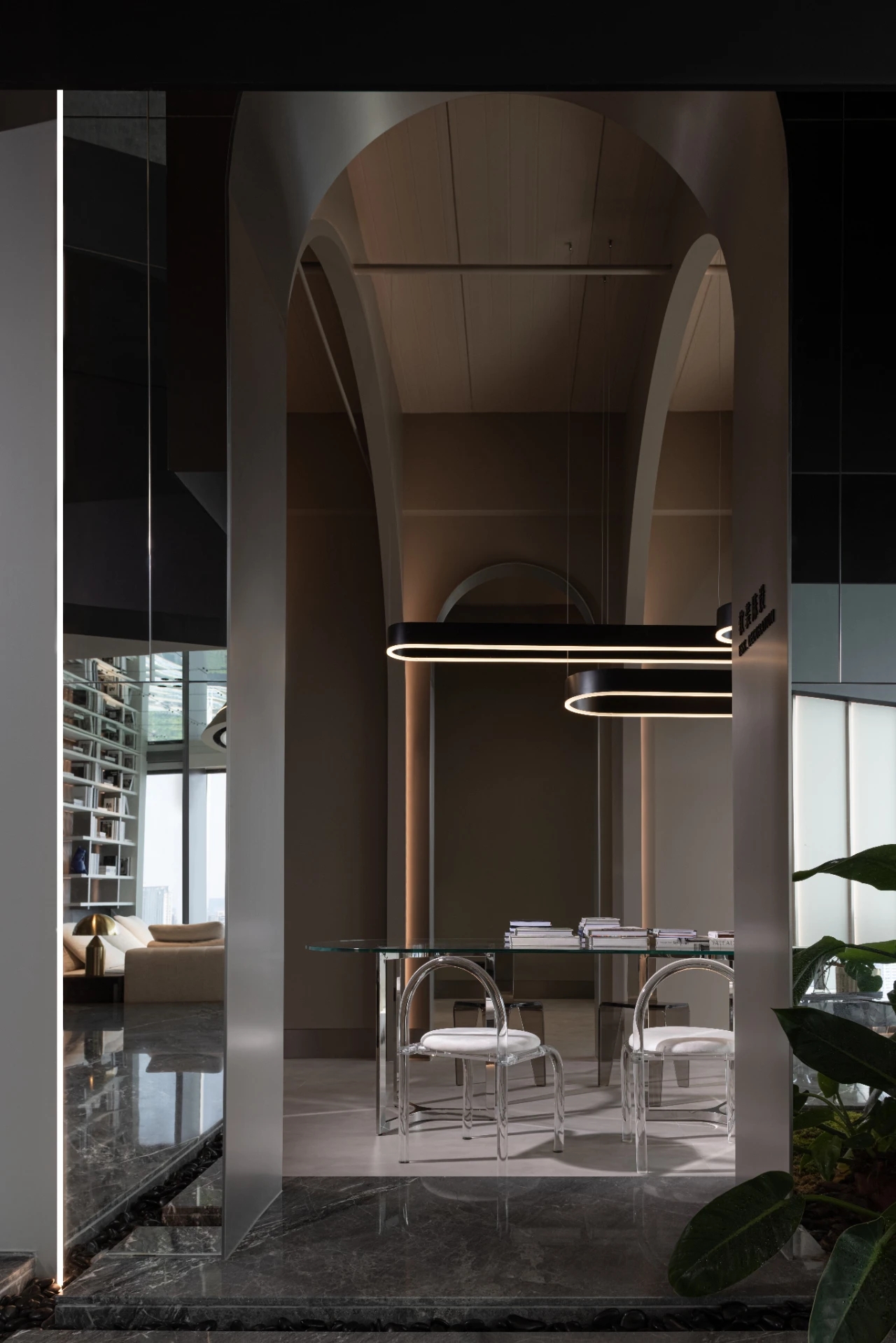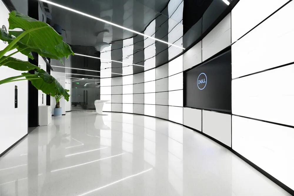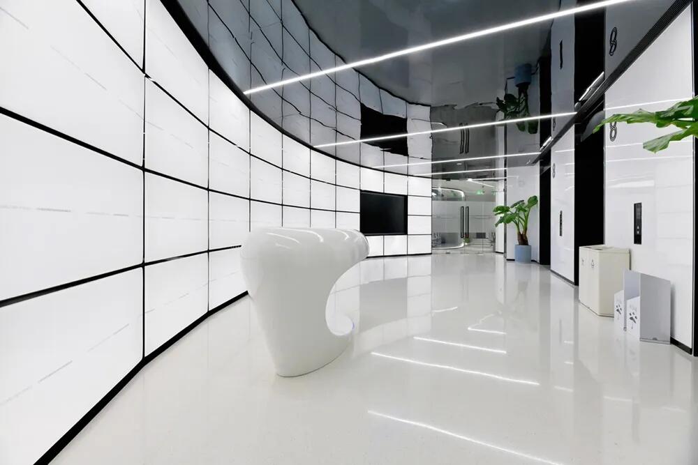 在电梯出来,一步入半圆弧的接待前厅,马上看到的是以安全气囊元素为主创意的,带灯光变化的半弧造型墙,时尚大气。在这纯粹的黑白灰空间里,一个纯白色飞驰动感造型的前台安安静静的摆设在那,在不使用的时候,它也是一个时尚的艺术品。和背镜墙相结合,体现了速度与安全的设计理念。