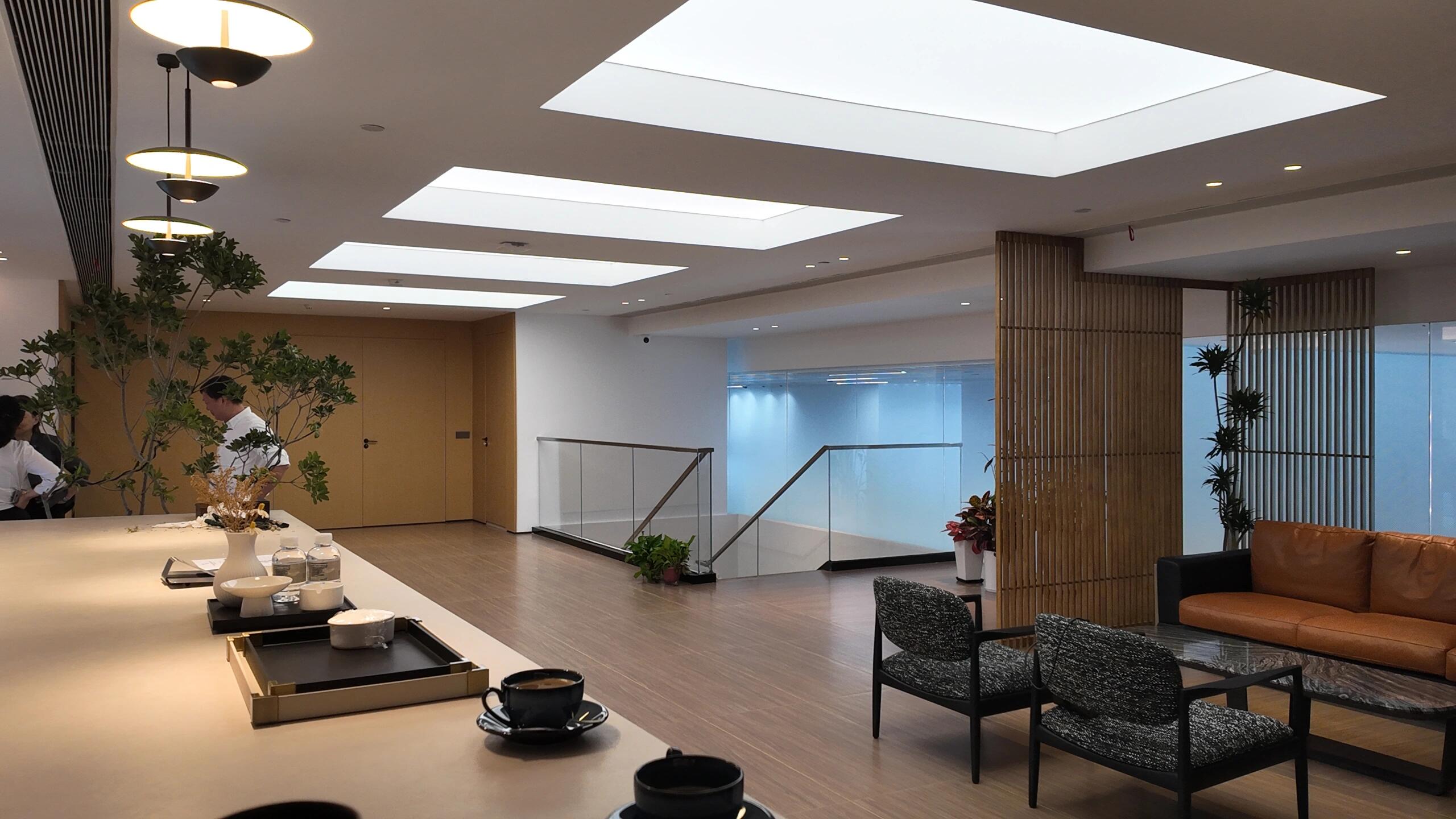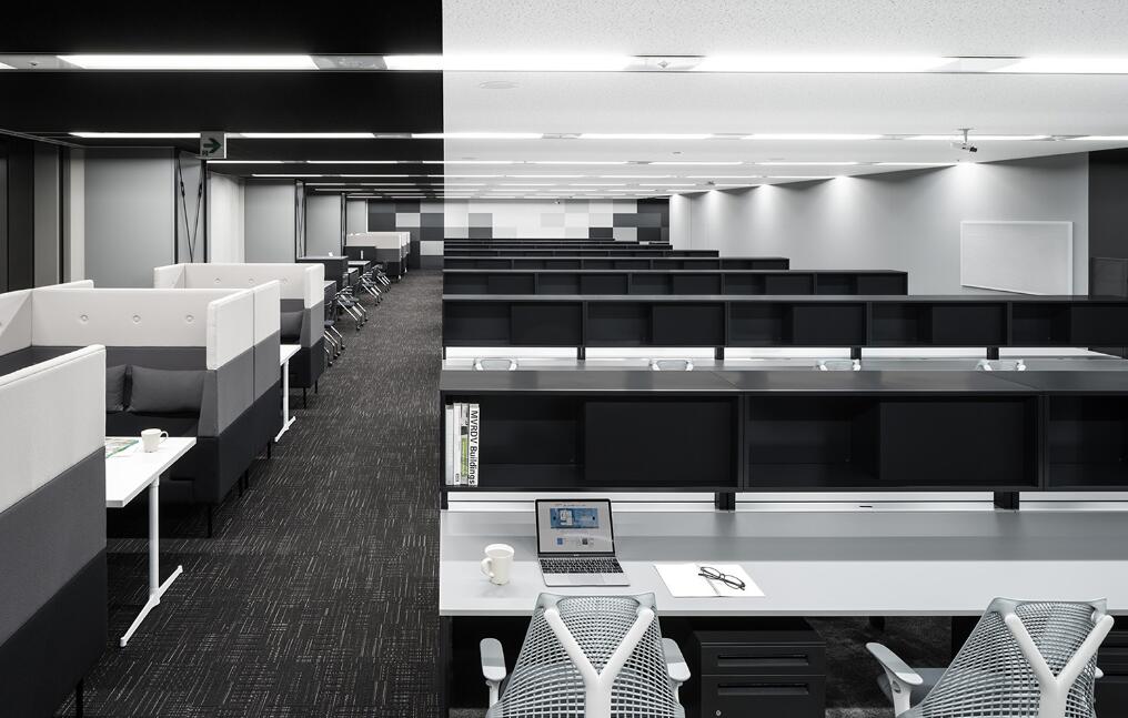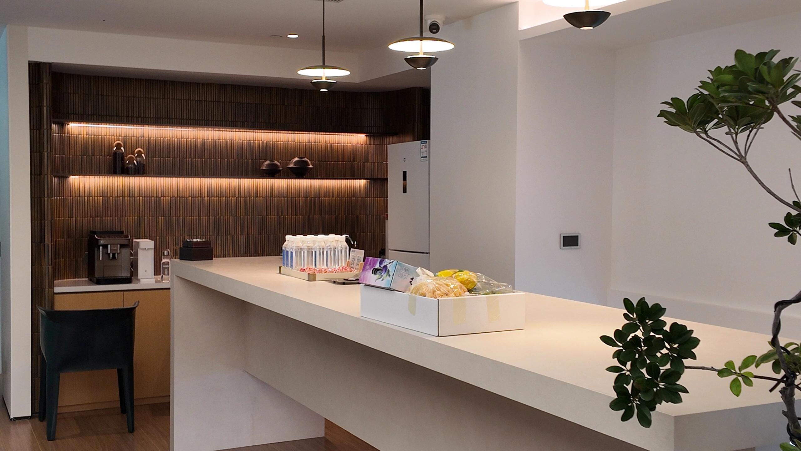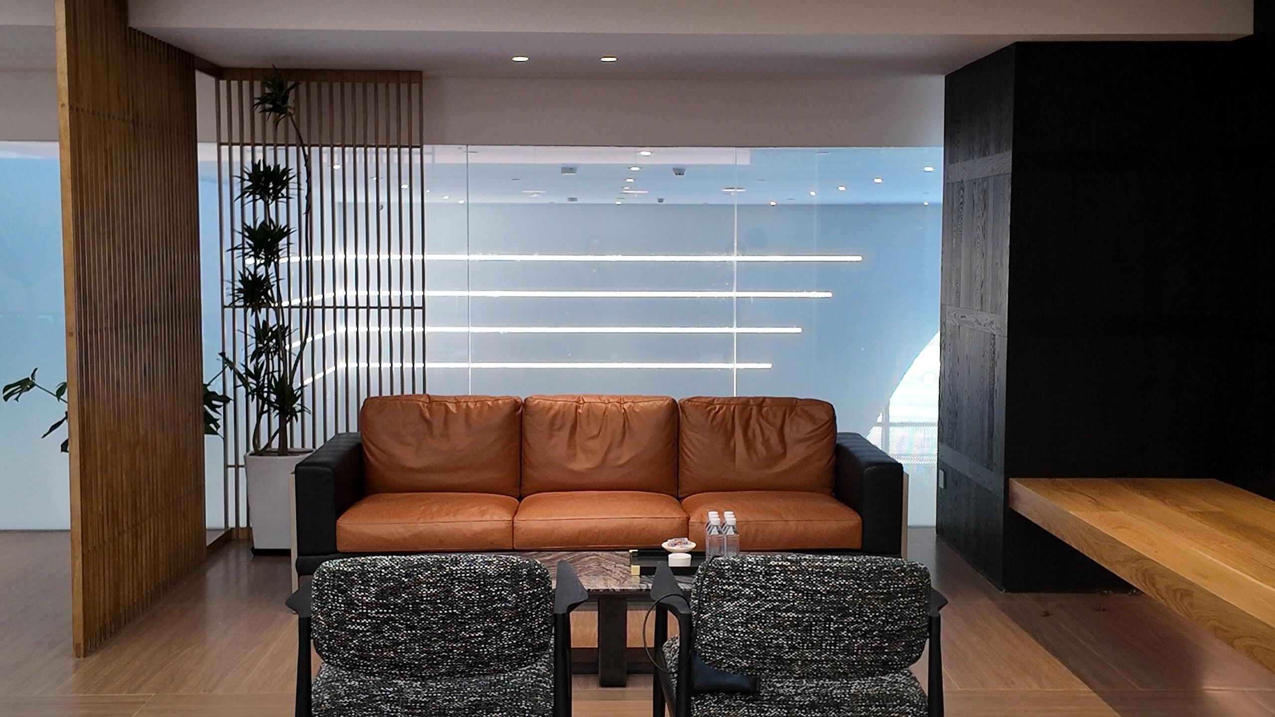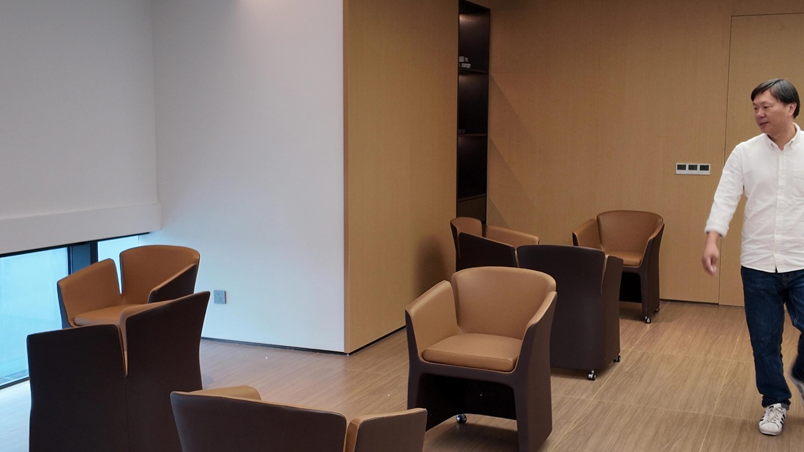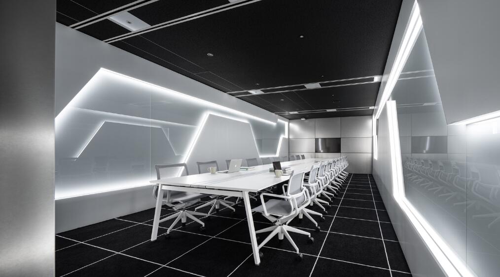 前台区域采用了创新的悬挂式背景墙设计,实现了空间的通透与连贯,其背后直接衔接着开阔的共享休息区。如此布局,旨在确保每一位来访者在踏入事务所的瞬间,映入眼帘的并非刻板繁忙的工作场景,而是相对舒缓的休憩天地。经典的卡座式工作区域设计,巧妙融入了背对背折角遮挡元素,这一细节处理不仅精心保障了每位工作者的私密空间与专注度,还确保了工作交流的高效流畅。层高偏低可能会带来一些实际的问题,如空间压抑感、光线不足、通风不良等,这些问题可能会影响律师的工作效率、客户满意度以及整体的工作氛围。然而,原始顶喷黑可缓解层高偏低弊端,又可以弱化顶部杂乱的管线,同时也是最经济的做法,改善整体空间结构。