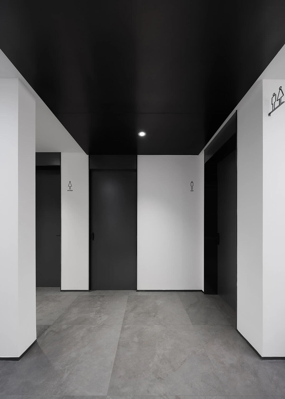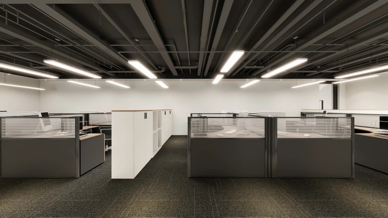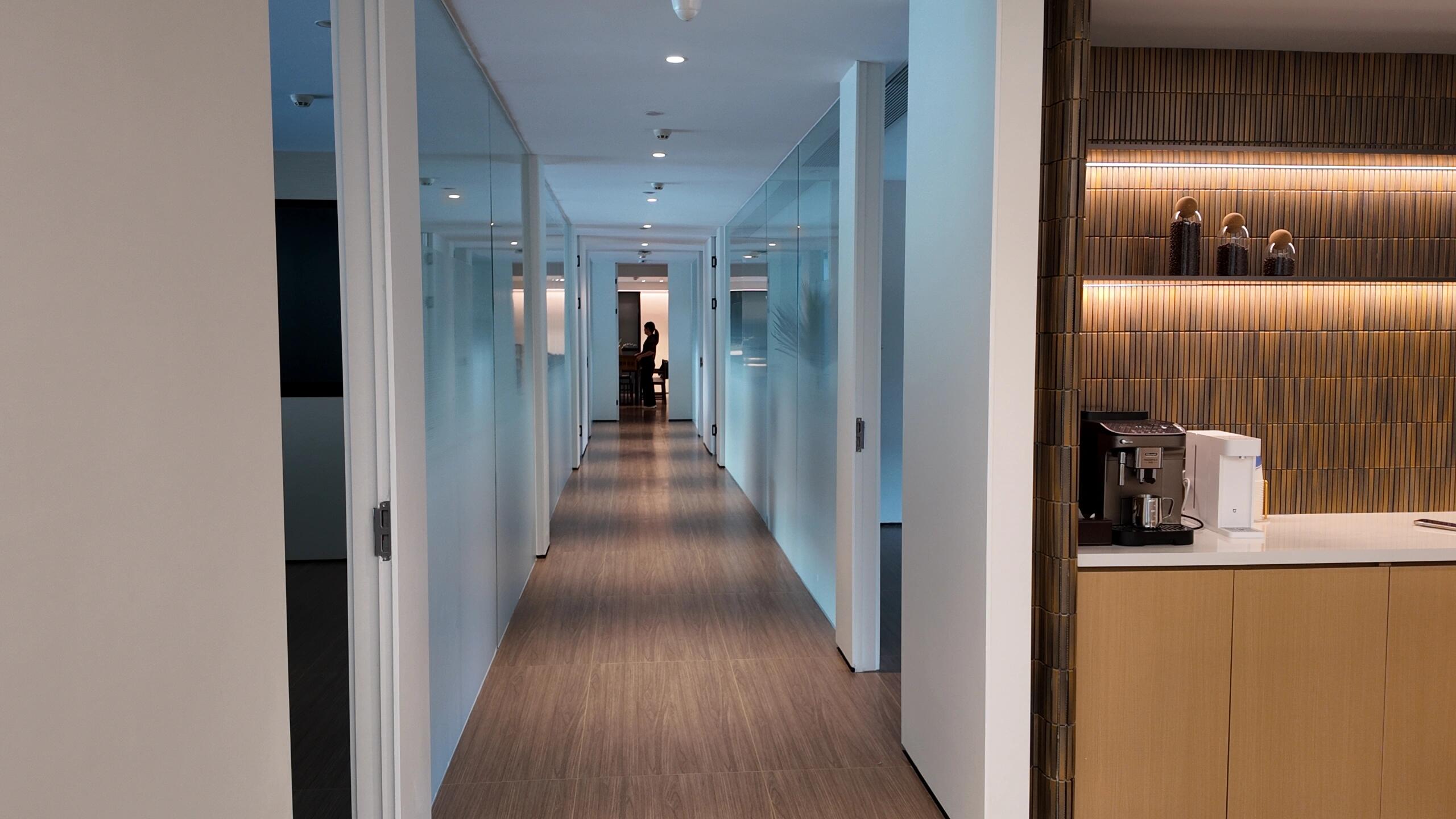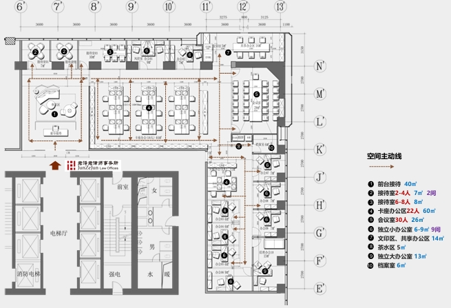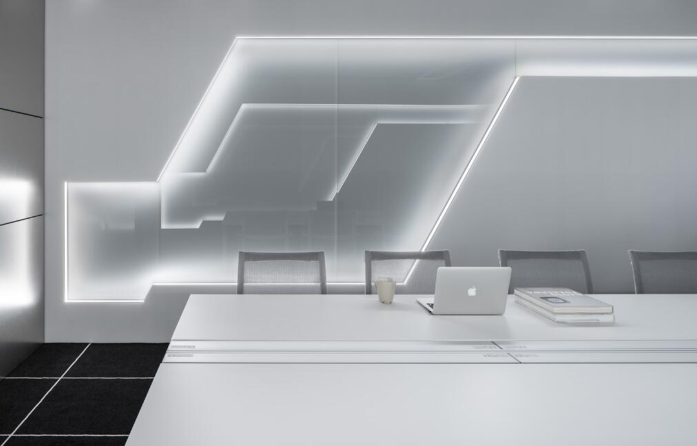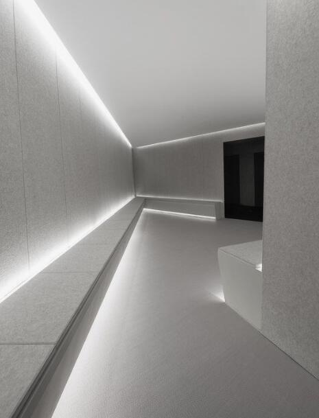前台区域采用了创新的悬挂式背景墙设计,实现了空间的通透与连贯,其背后直接衔接着开阔的共享休息区。如此布局,旨在确保每一位来访者在踏入事务所的瞬间,映入眼帘的并非刻板繁忙的工作场景,而是相对舒缓的休憩天地。经典的卡座式工作区域设计,巧妙融入了背对背折角遮挡元素,这一细节处理不仅精心保障了每位工作者的私密空间与专注度,还确保了工作交流的高效流畅。层高偏低可能会带来一些实际的问题,如空间压抑感、光线不足、通风不良等,这些问题可能会影响律师的工作效率、客户满意度以及整体的工作氛围。然而,原始顶喷黑可缓解层高偏低弊端,又可以弱化顶部杂乱的管线,同时也是最经济的做法,改善整体空间结构。