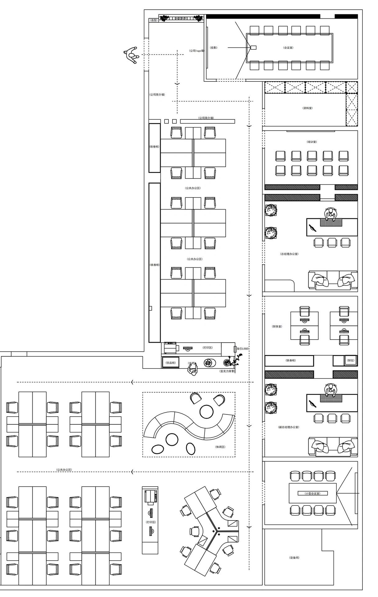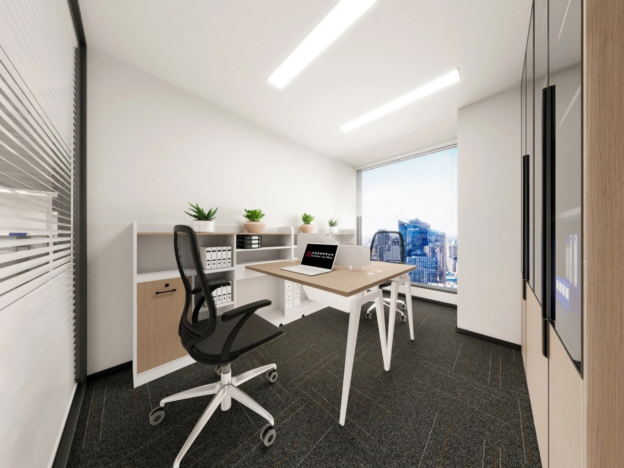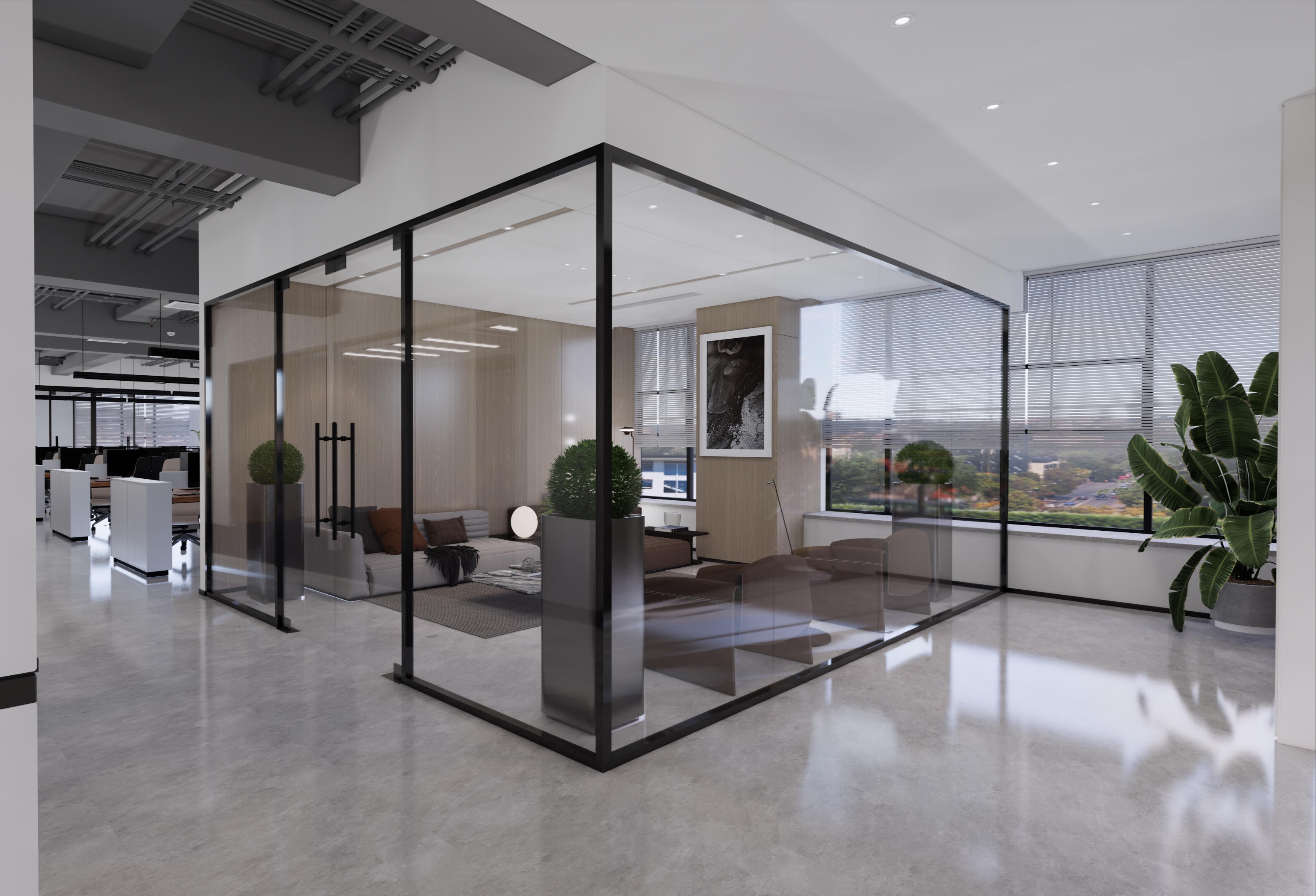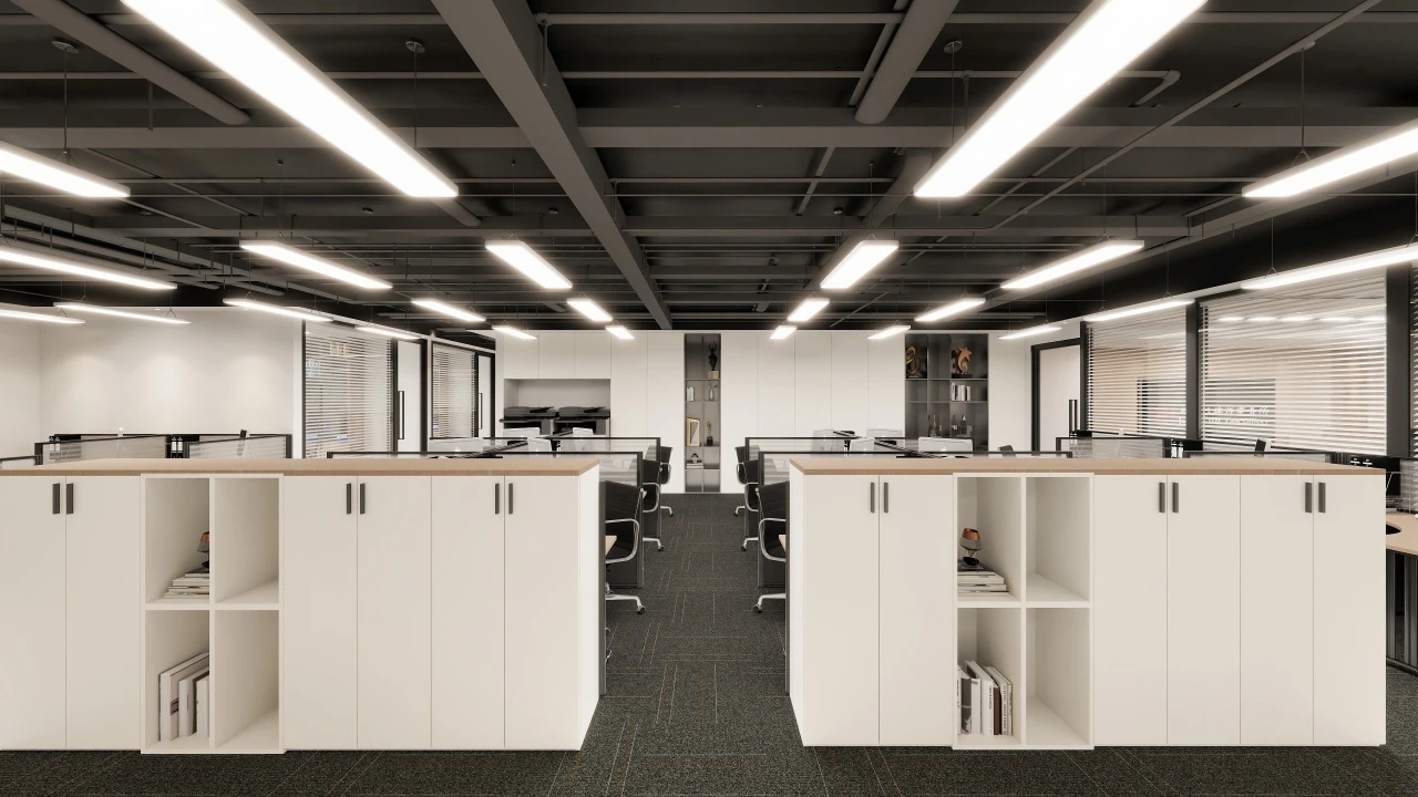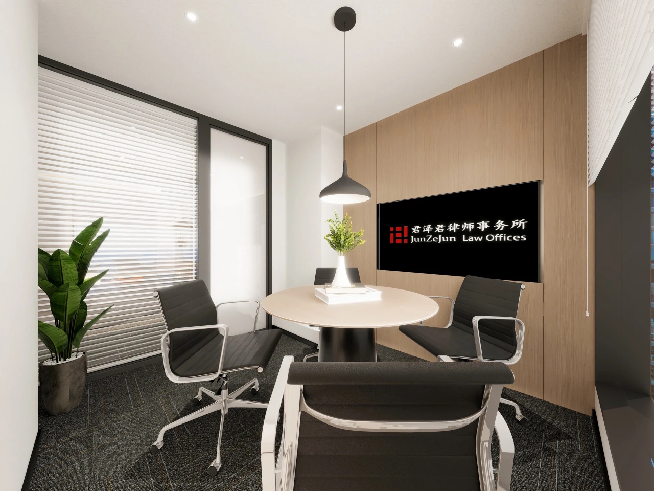 前台区域采用了创新的悬挂式背景墙设计,实现了空间的通透与连贯,其背后直接衔接着开阔的共享休息区。如此布局,旨在确保每一位来访者在踏入事务所的瞬间,映入眼帘的并非刻板繁忙的工作场景,而是相对舒缓的休憩天地。经典的卡座式工作区域设计,巧妙融入了背对背折角遮挡元素,这一细节处理不仅精心保障了每位工作者的私密空间与专注度,还确保了工作交流的高效流畅。层高偏低可能会带来一些实际的问题,如空间压抑感、光线不足、通风不良等,这些问题可能会影响律师的工作效率、客户满意度以及整体的工作氛围。然而,原始顶喷黑可缓解层高偏低弊端,又可以弱化顶部杂乱的管线,同时也是最经济的做法,改善整体空间结构。
