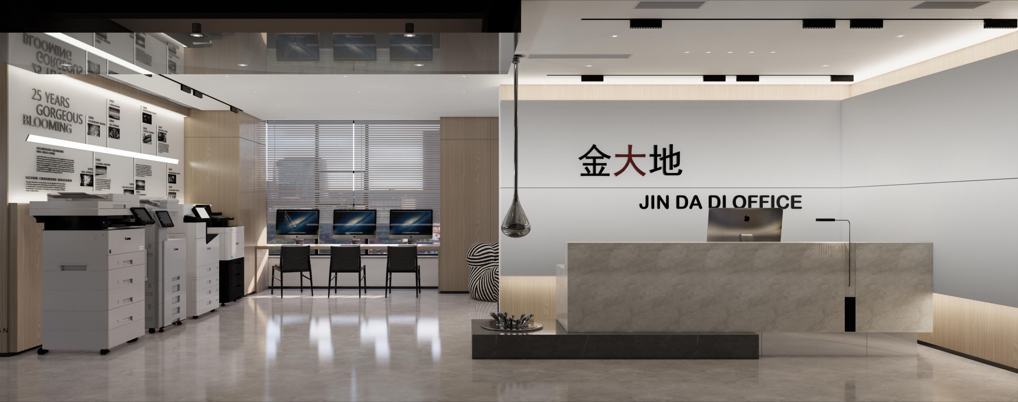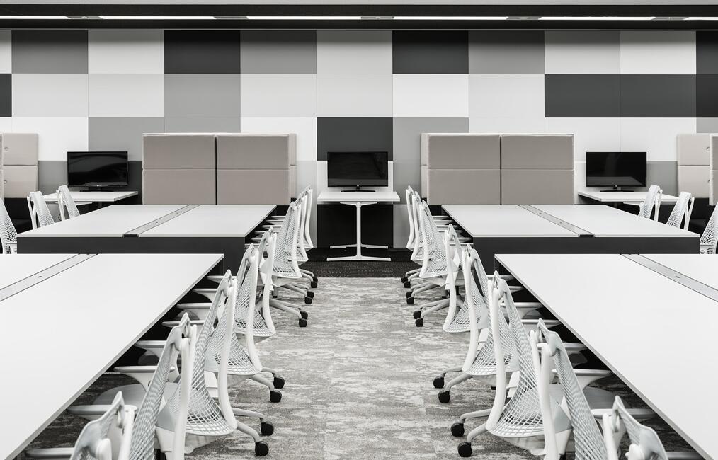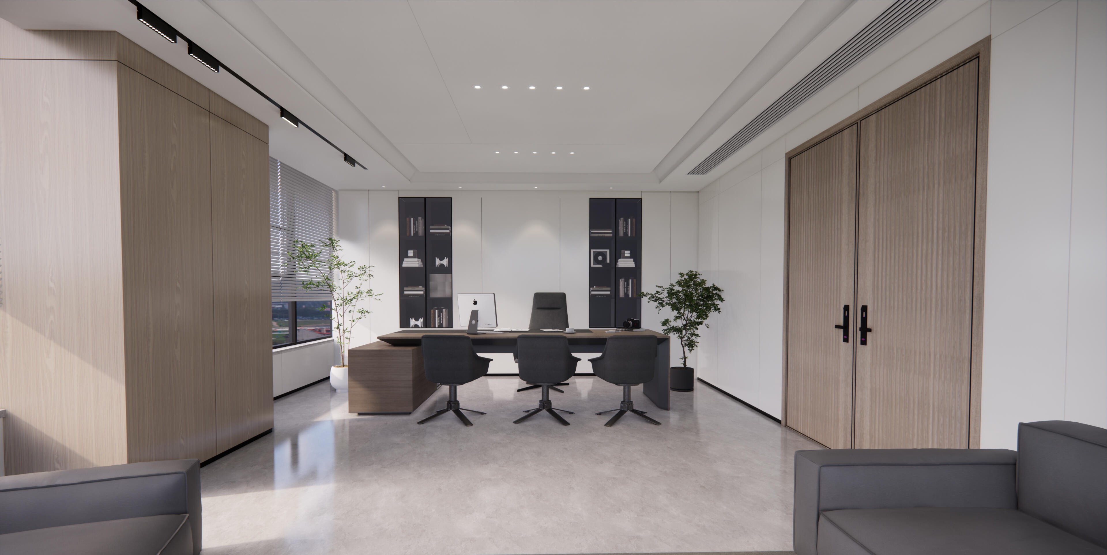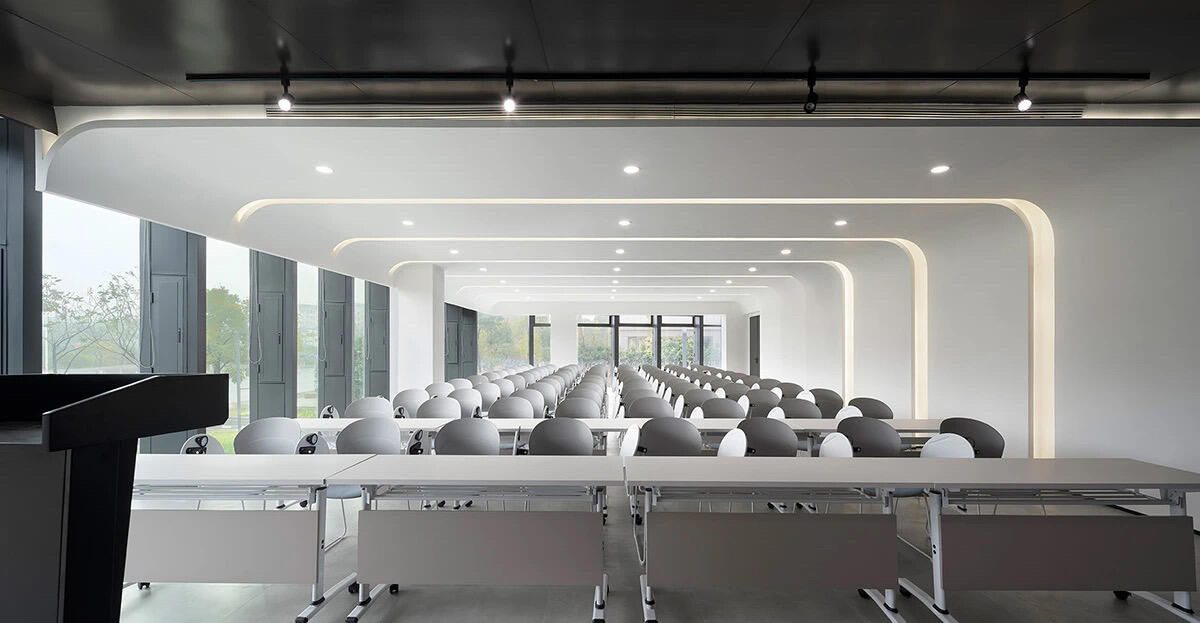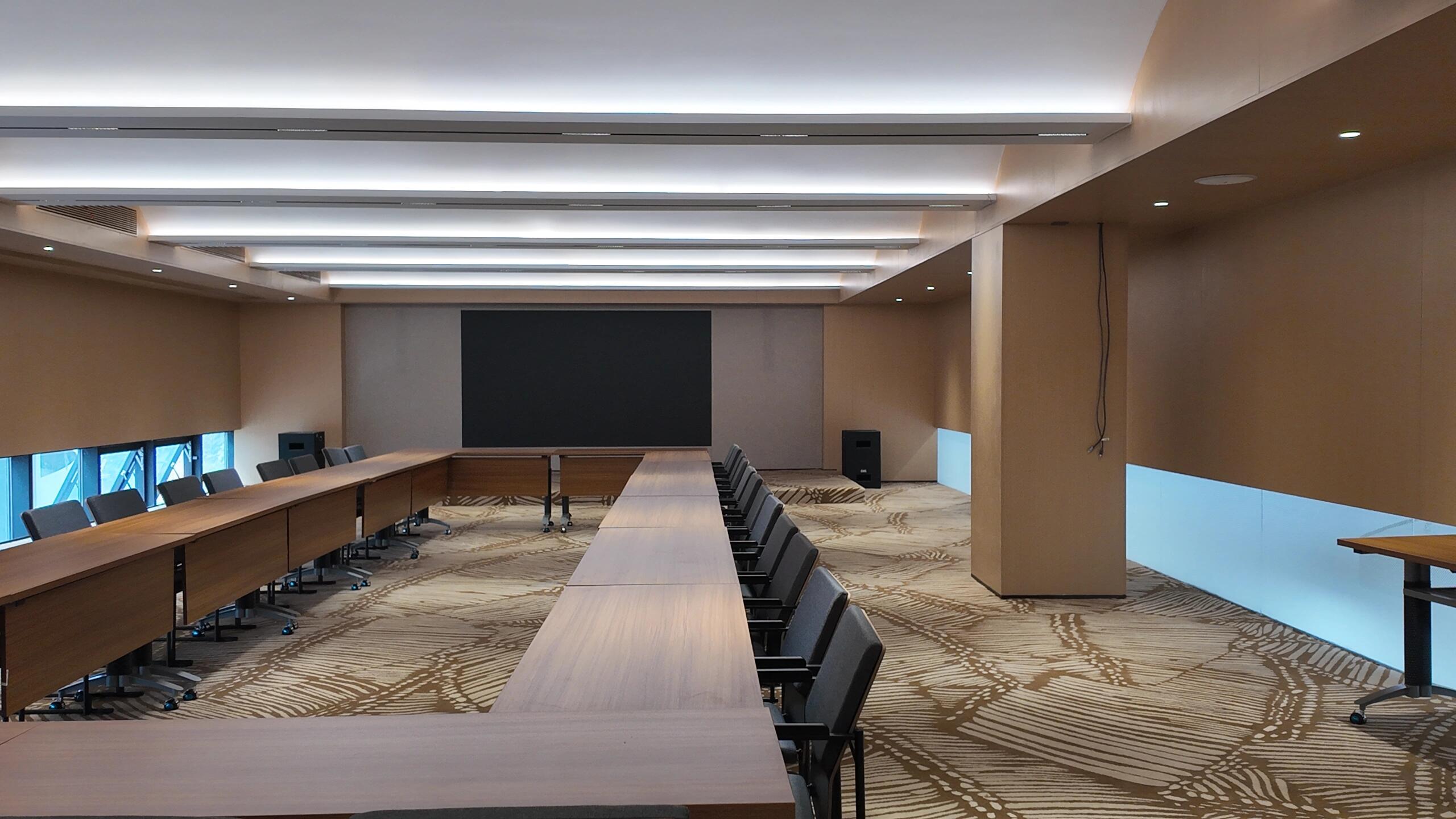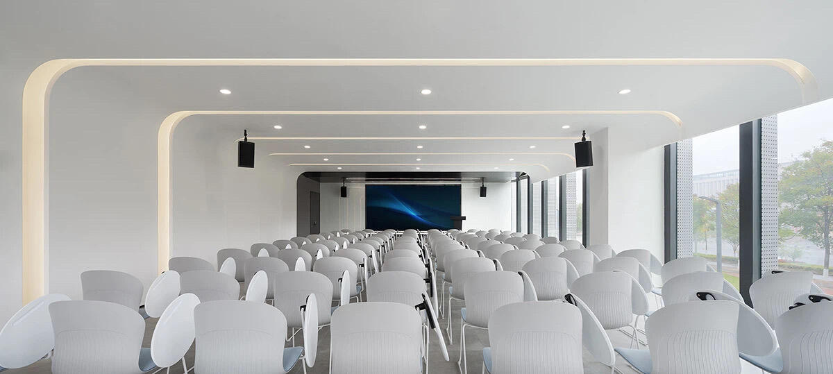 前台区域采用了创新的悬挂式背景墙设计,实现了空间的通透与连贯,其背后直接衔接着开阔的共享休息区。如此布局,旨在确保每一位来访者在踏入事务所的瞬间,映入眼帘的并非刻板繁忙的工作场景,而是相对舒缓的休憩天地。经典的卡座式工作区域设计,巧妙融入了背对背折角遮挡元素,这一细节处理不仅精心保障了每位工作者的私密空间与专注度,还确保了工作交流的高效流畅。层高偏低可能会带来一些实际的问题,如空间压抑感、光线不足、通风不良等,这些问题可能会影响律师的工作效率、客户满意度以及整体的工作氛围。然而,原始顶喷黑可缓解层高偏低弊端,又可以弱化顶部杂乱的管线,同时也是最经济的做法,改善整体空间结构。